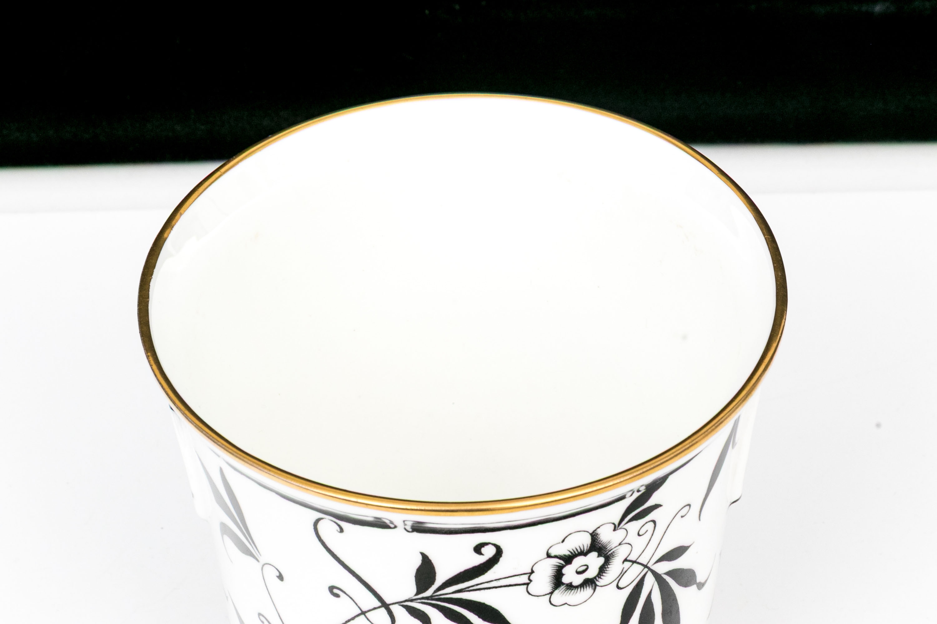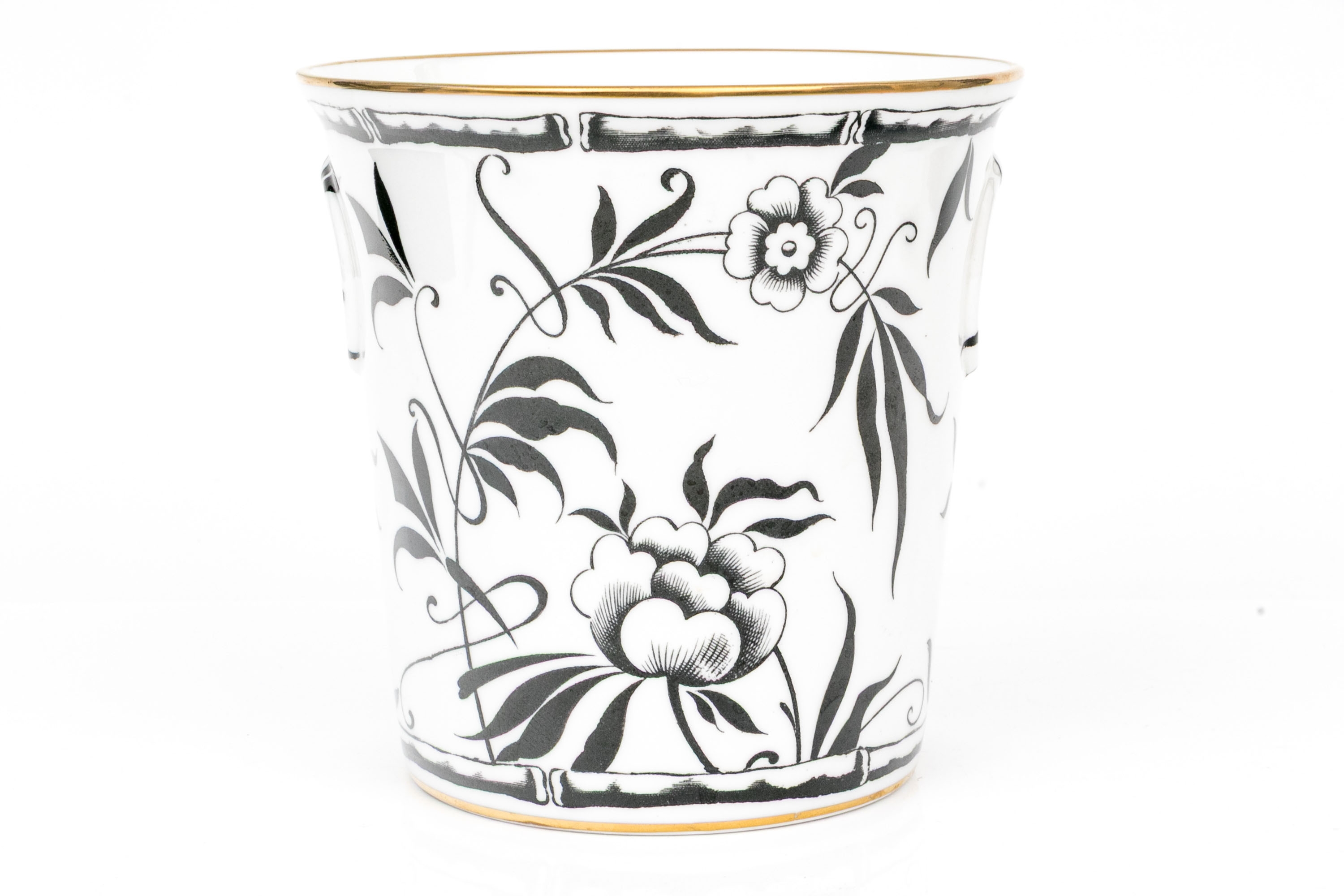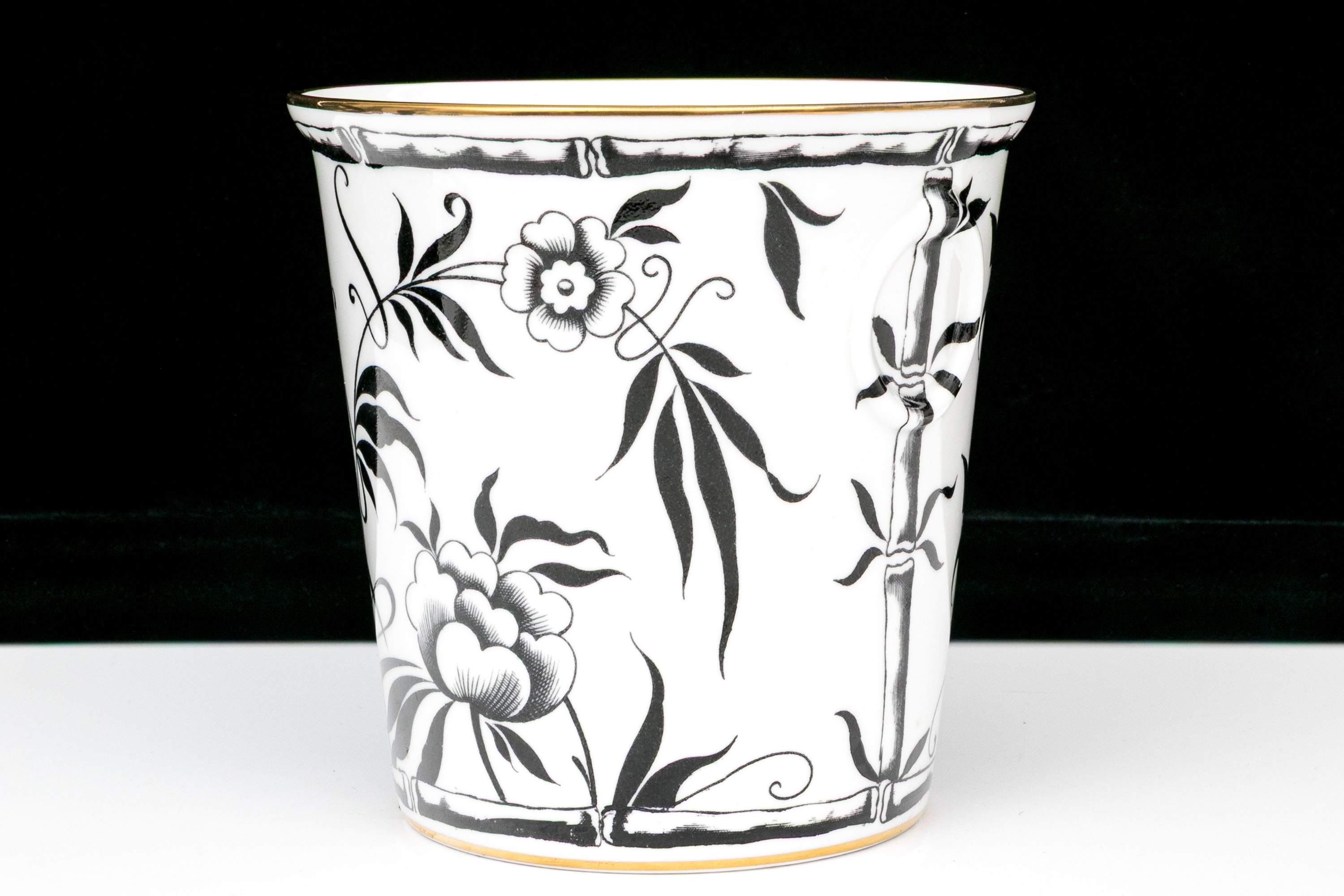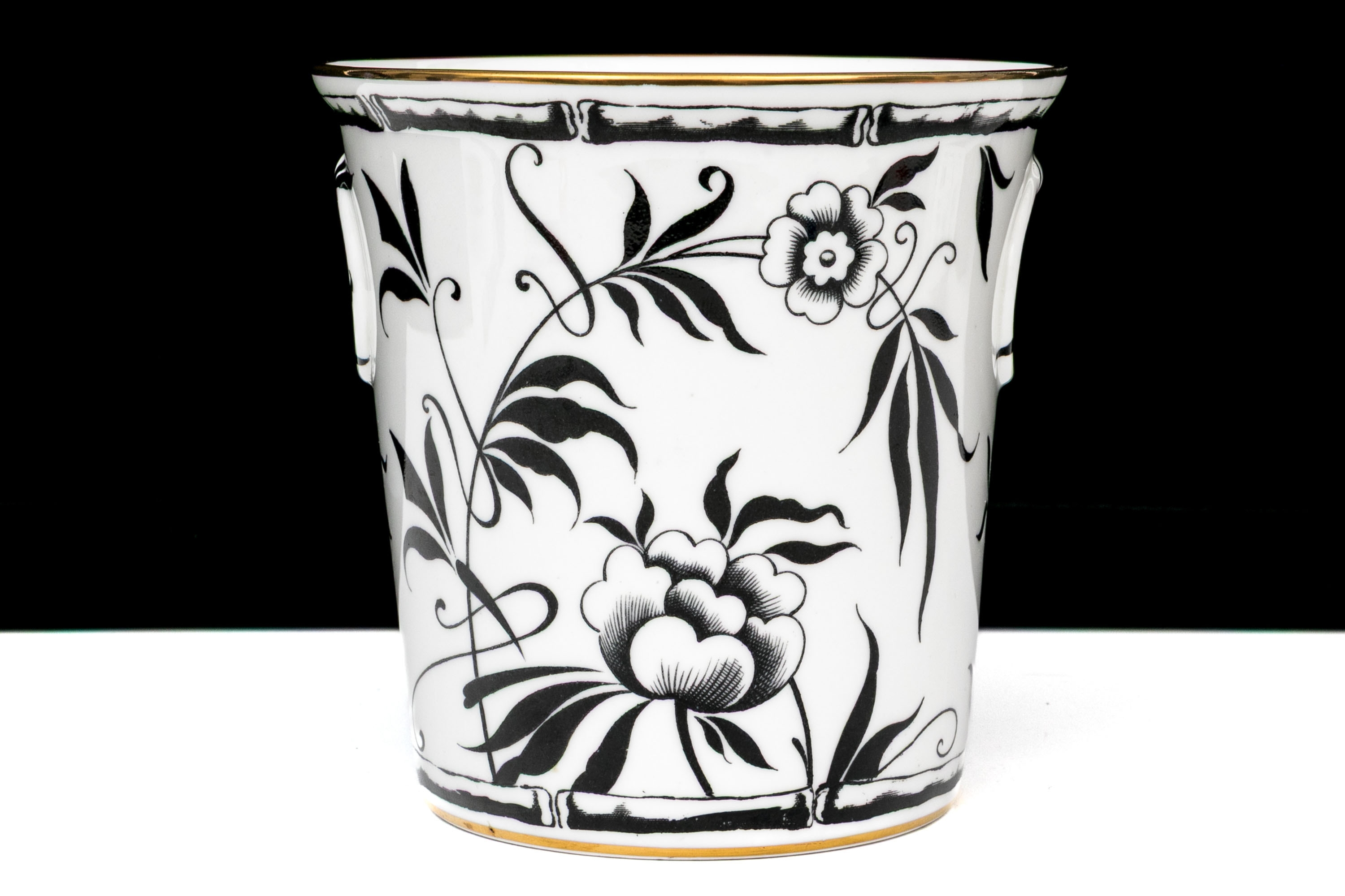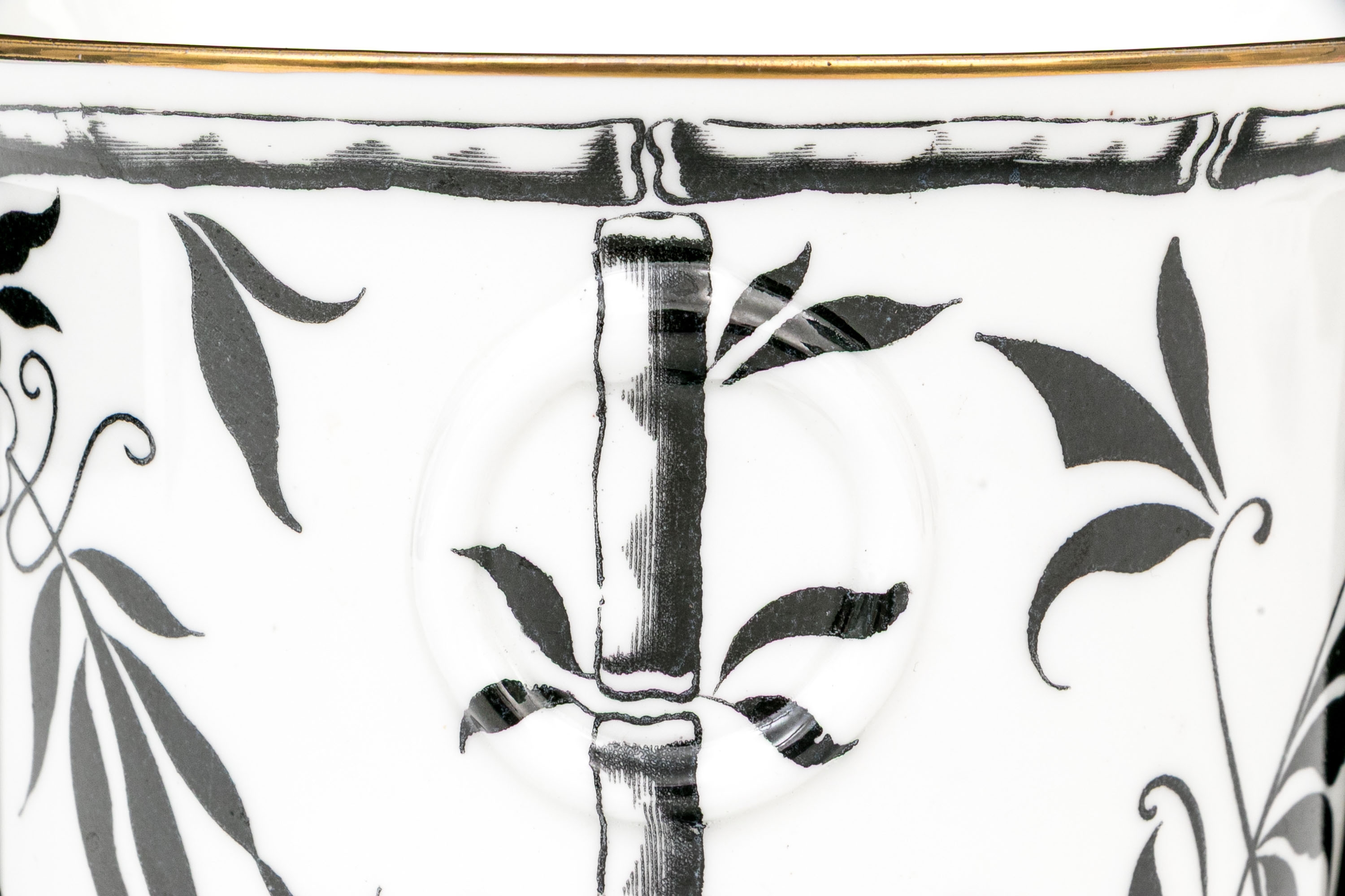 In white with black floral vine pattern and bamboo stalks around the top and on the sides. Flat ring handles and gilt rim and base edges.