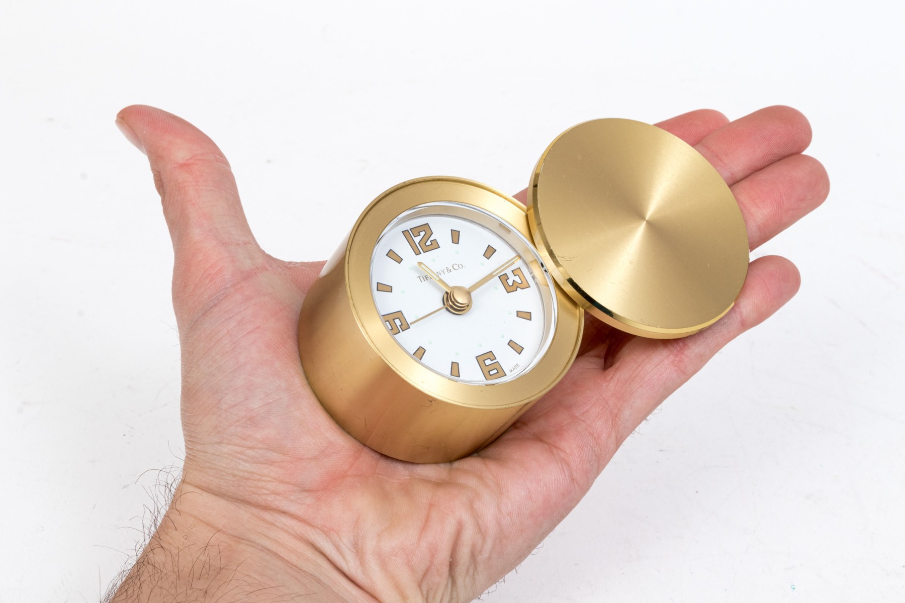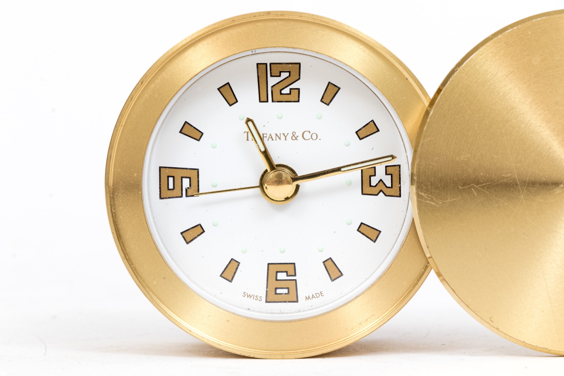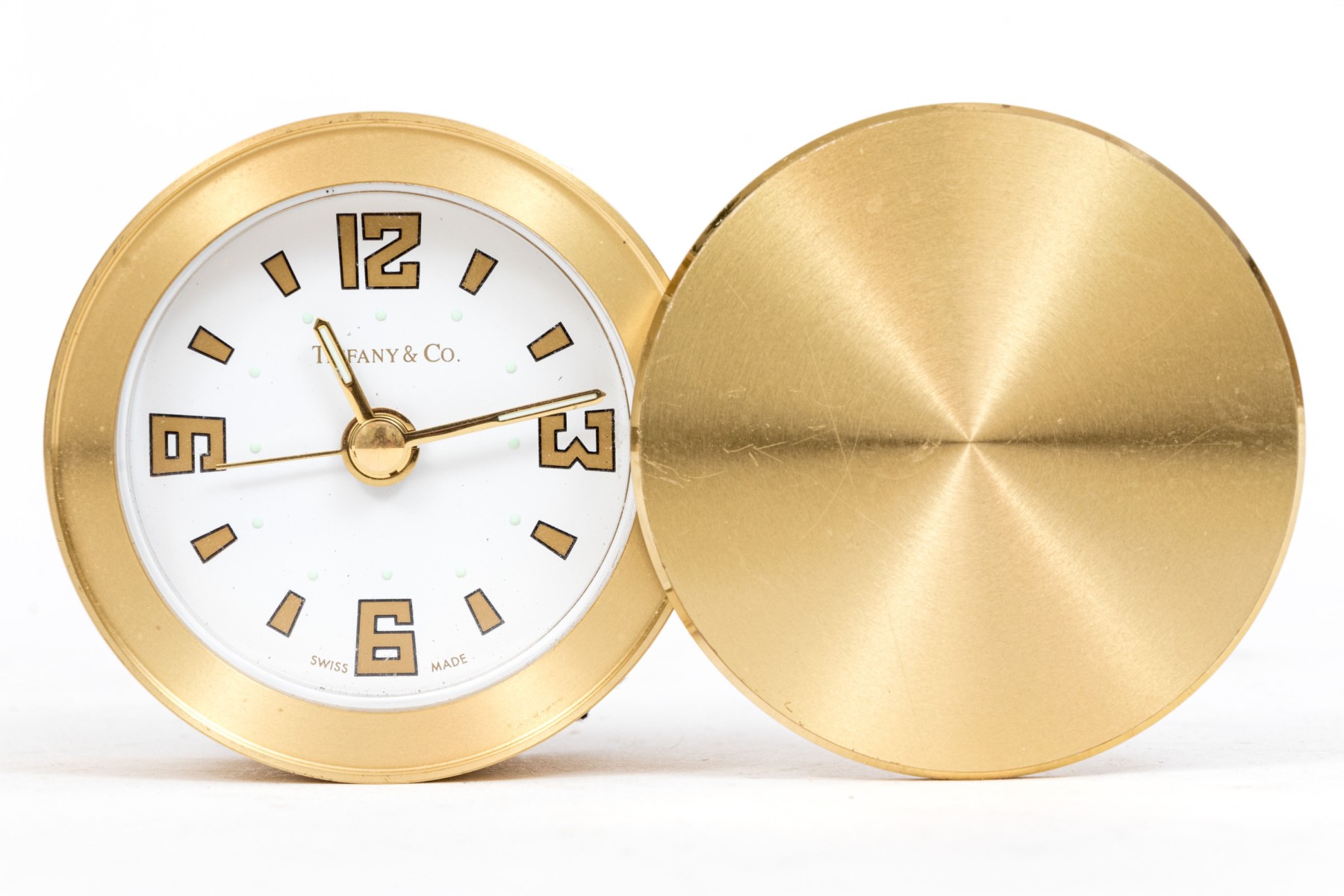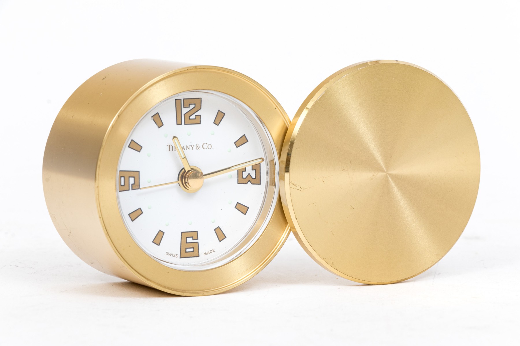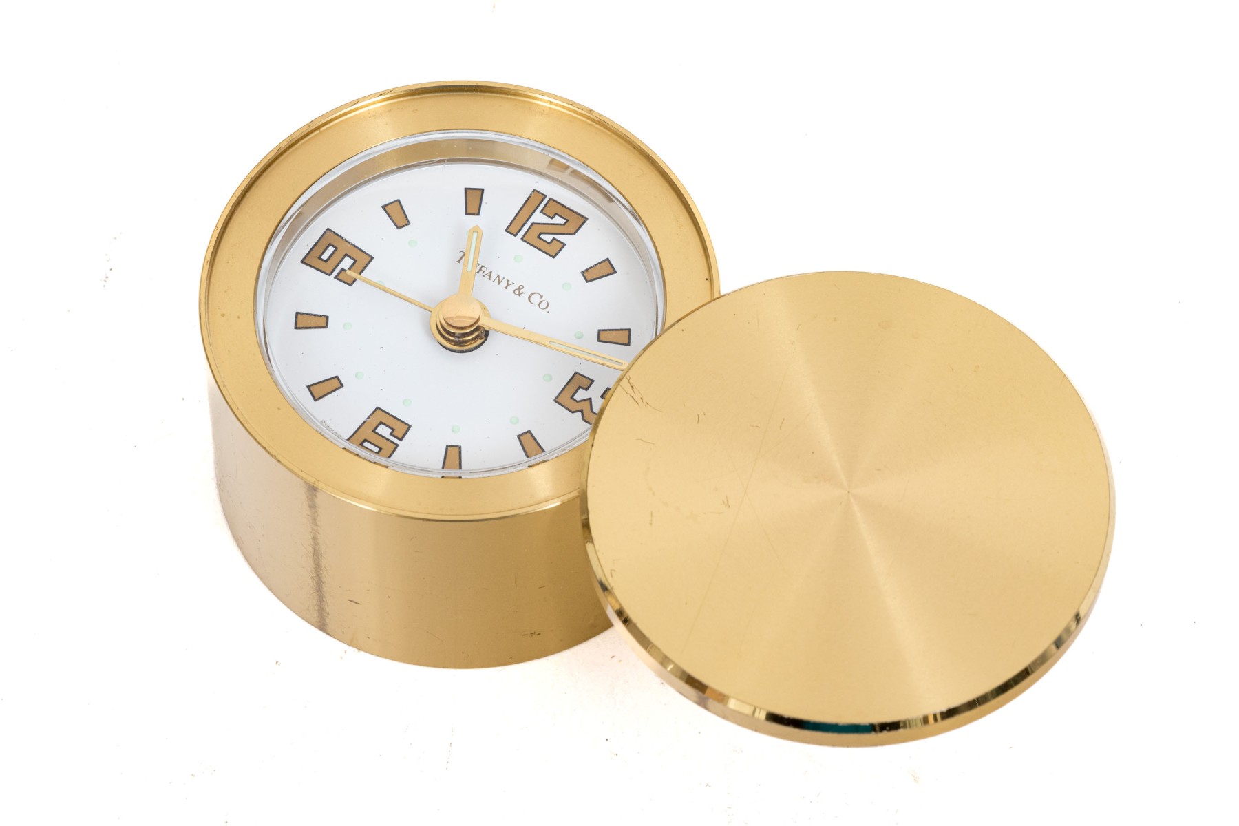 Tiffany & Co. handsome brass travel clock, white dial