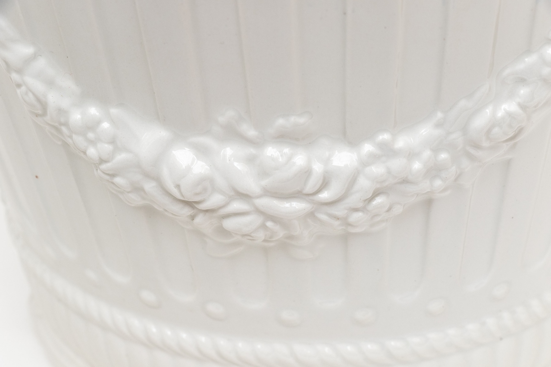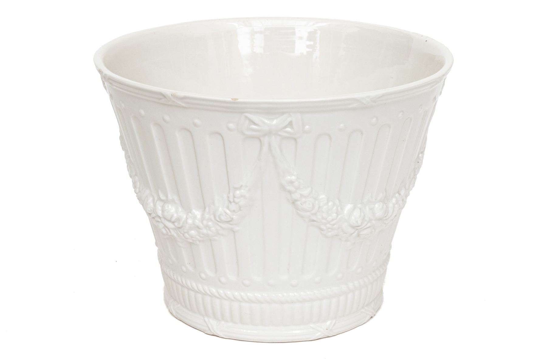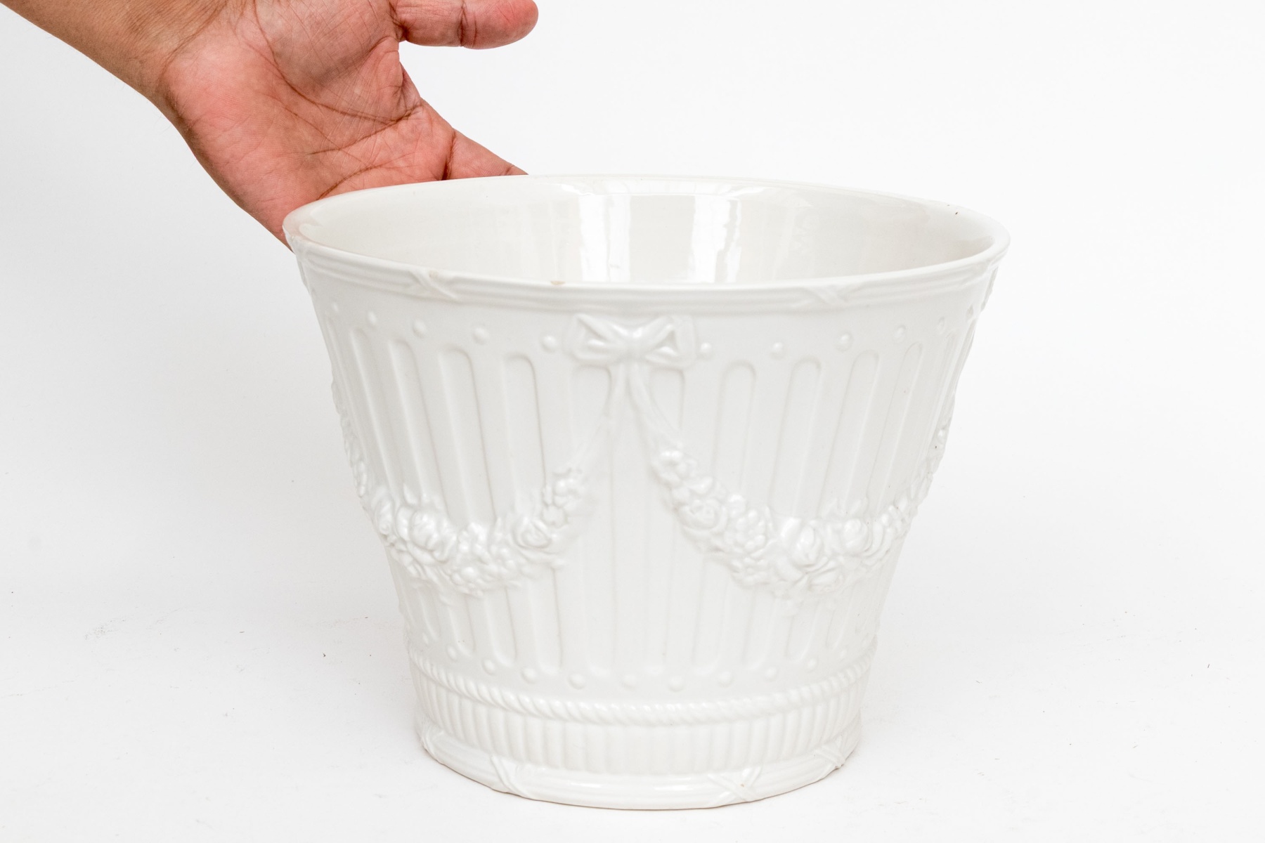 An elegant Tiffany & Co. ceramic jardiniere with great neoclassical appeal, showcasing a tapered conical form with a reeded rim crossed by X-motifs, a fluted body with beaded rivets overlaid by floral swags and ribbon garlands, and a rope twist band around the lower body leading down to the base. Marked underfoot.