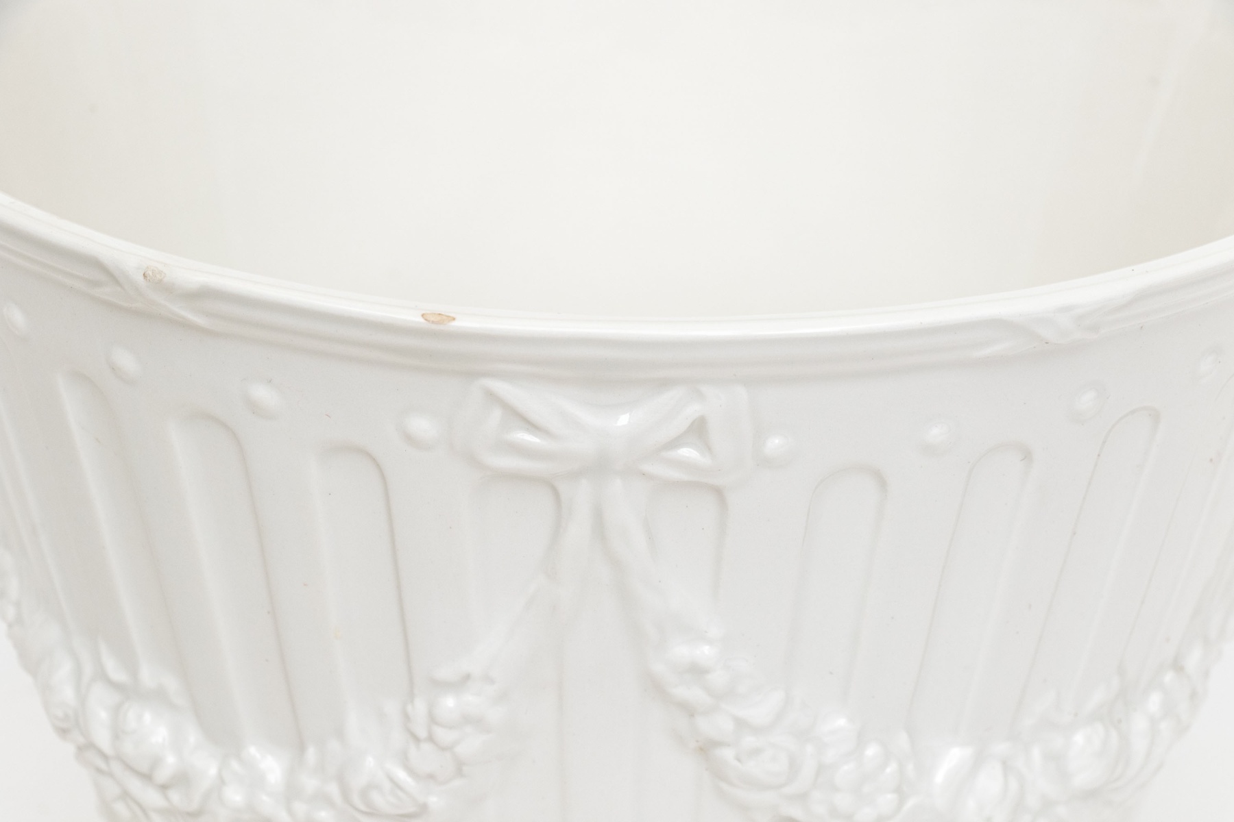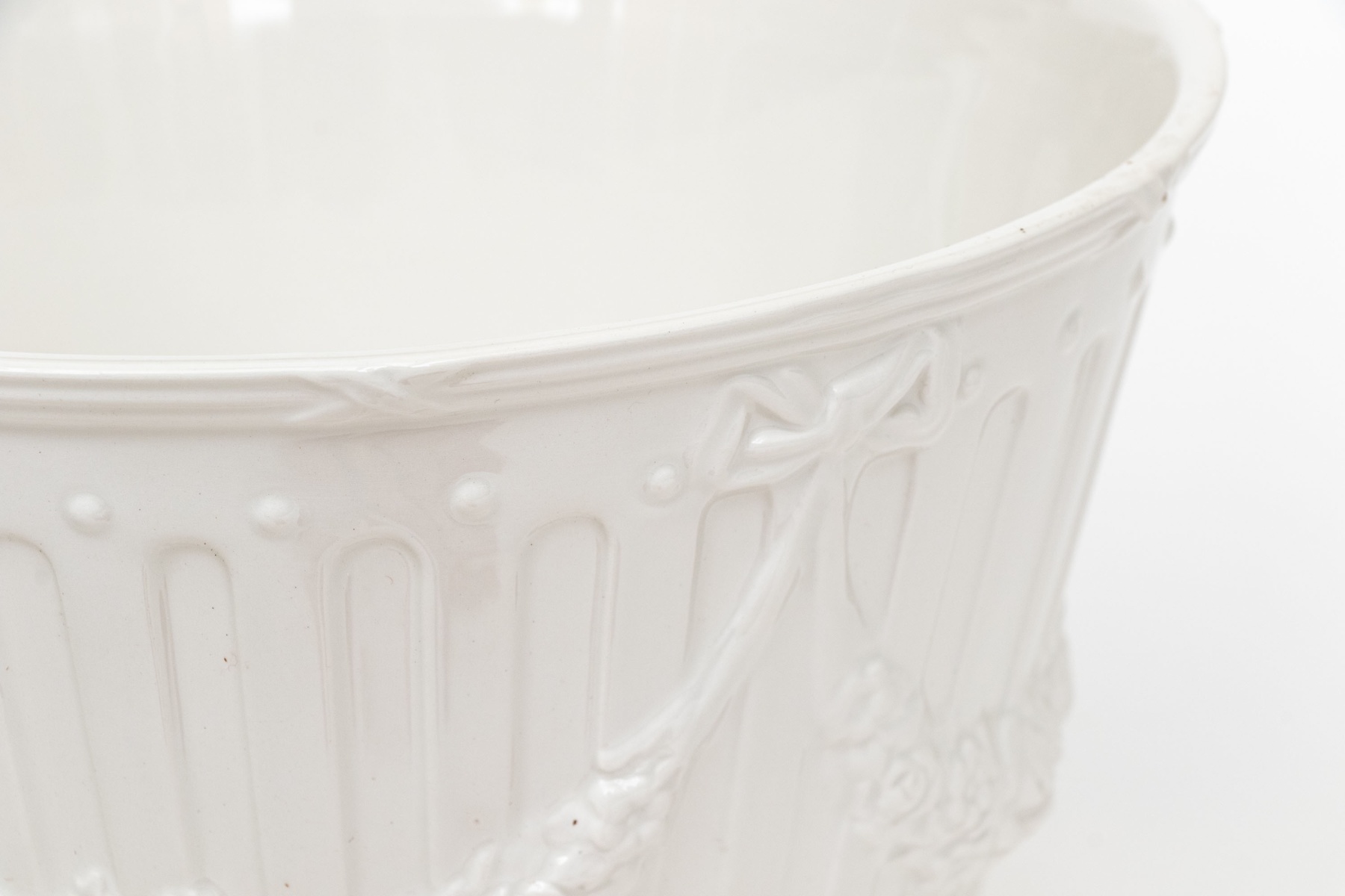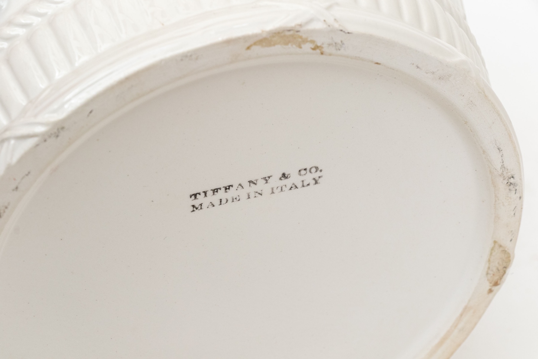 An elegant Tiffany & Co. ceramic jardiniere with great neoclassical appeal, showcasing a tapered conical form with a reeded rim crossed by X-motifs, a fluted body with beaded rivets overlaid by floral swags and ribbon garlands, and a rope twist band around the lower body leading down to the base. Marked underfoot.