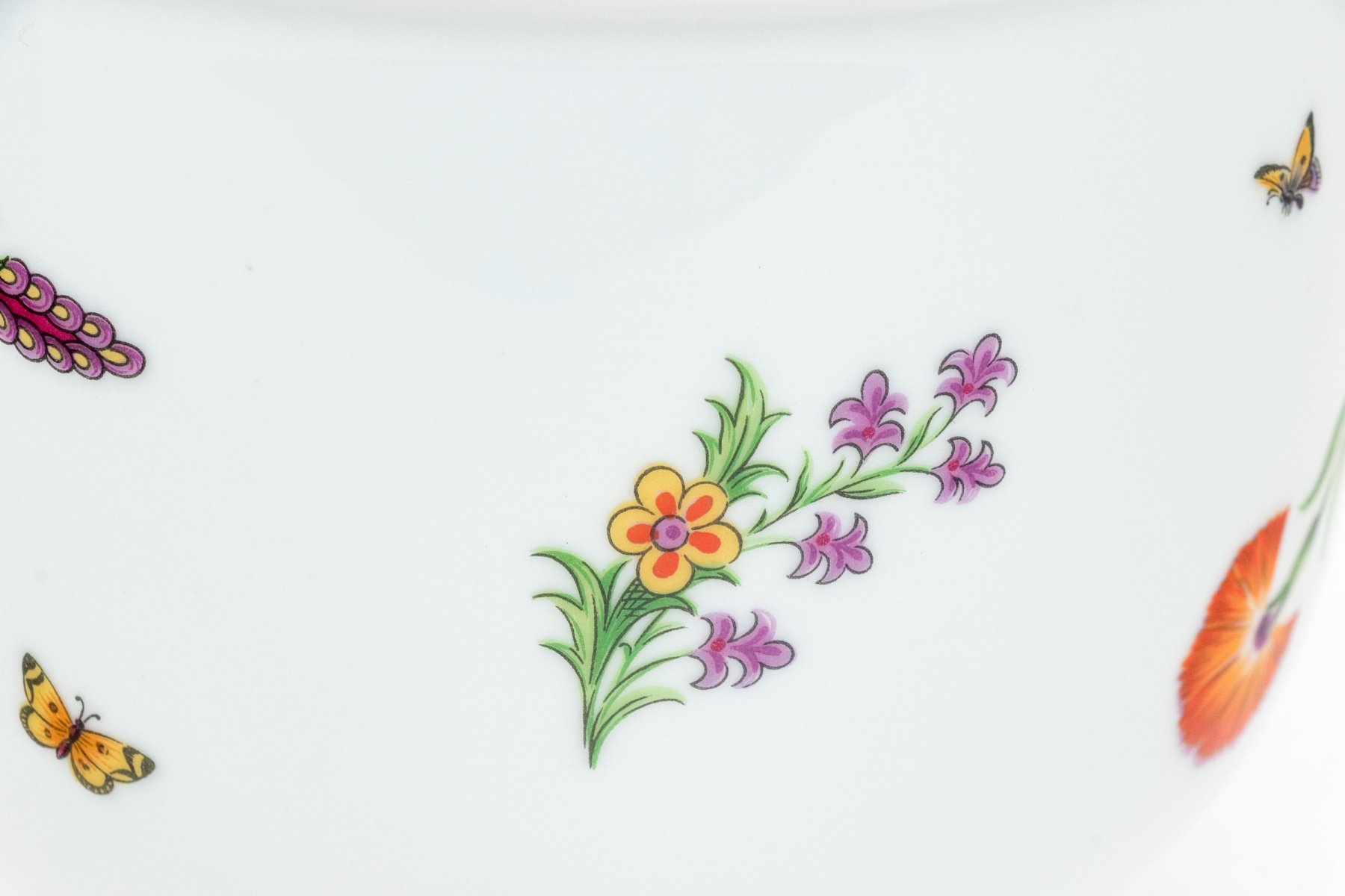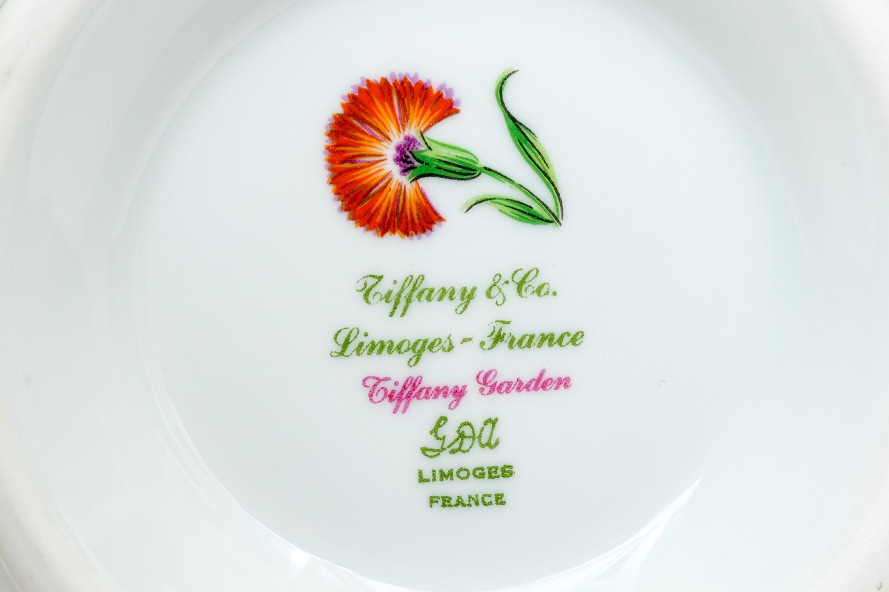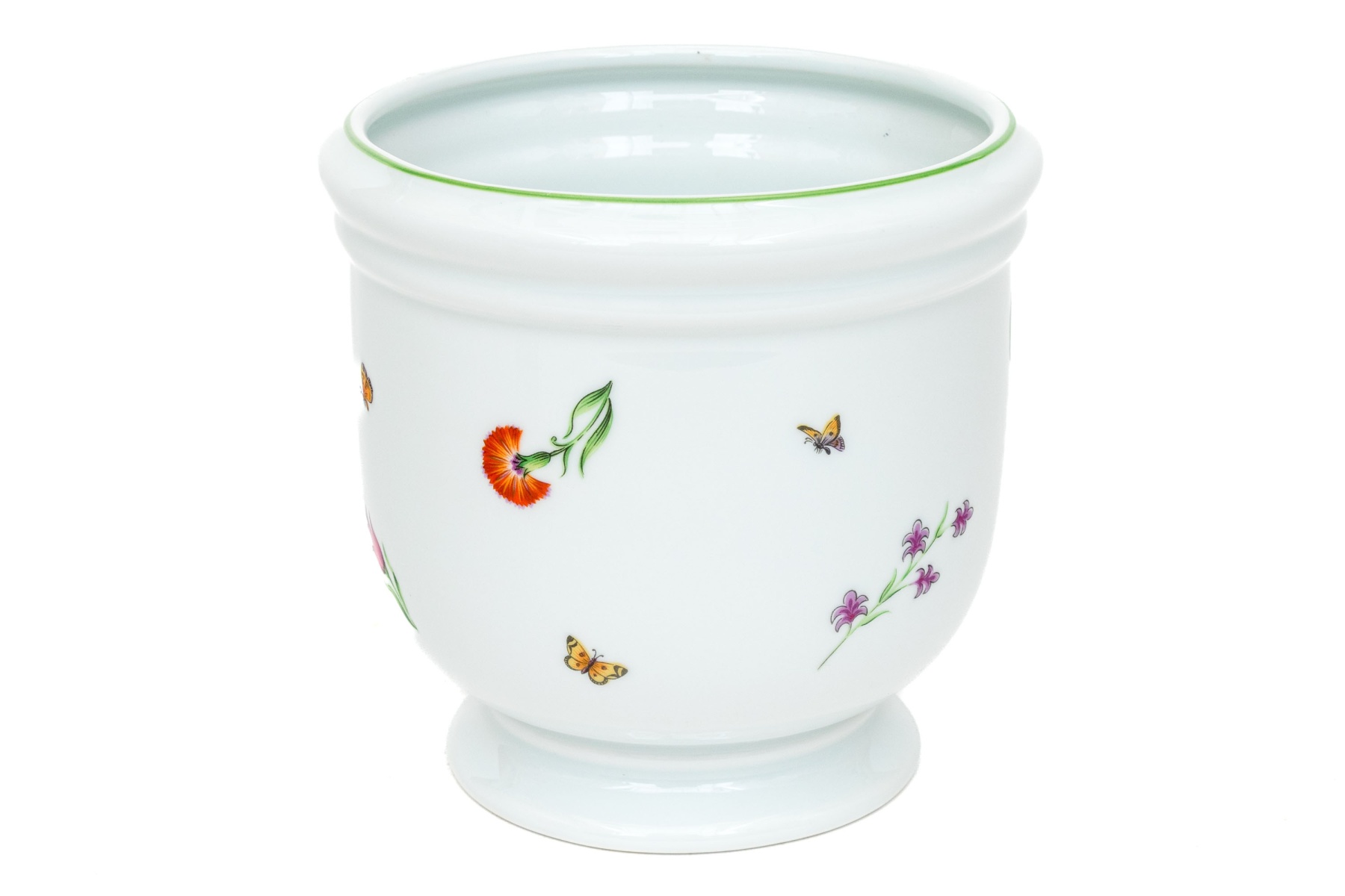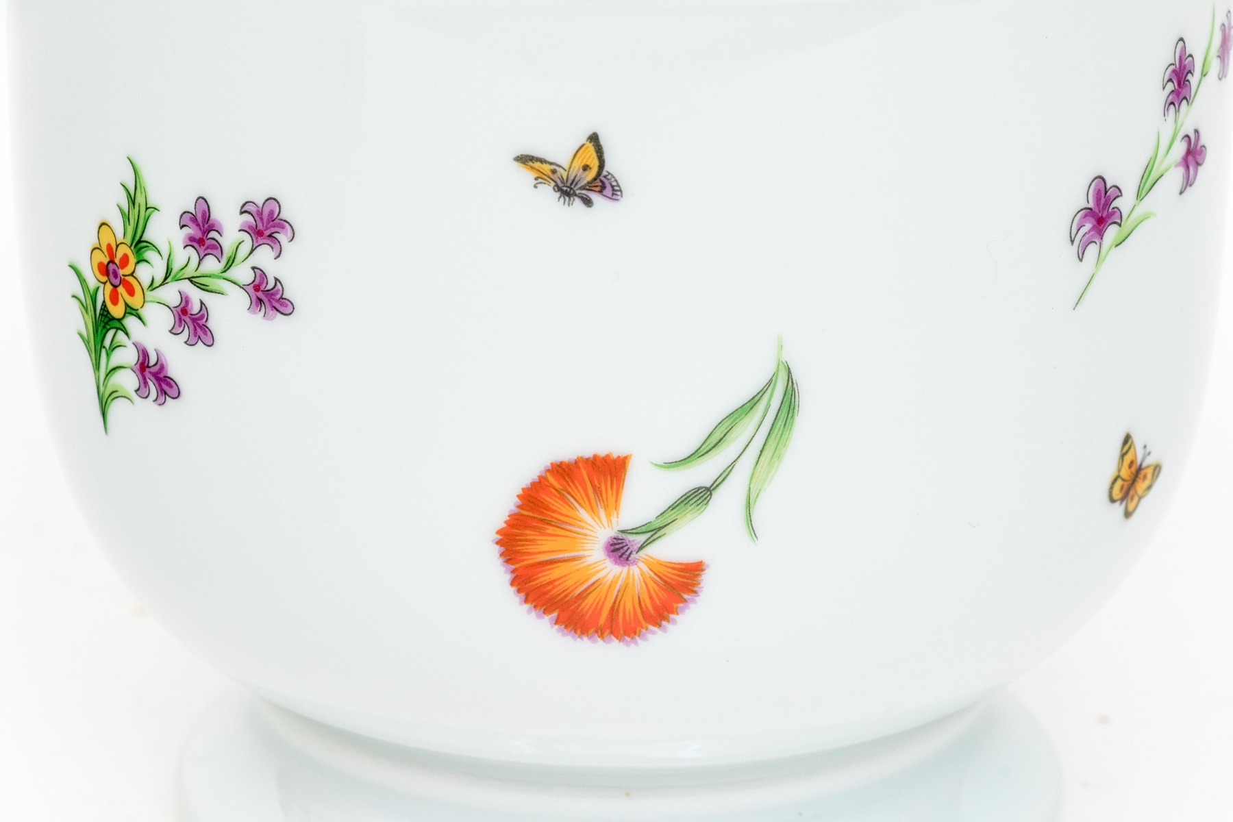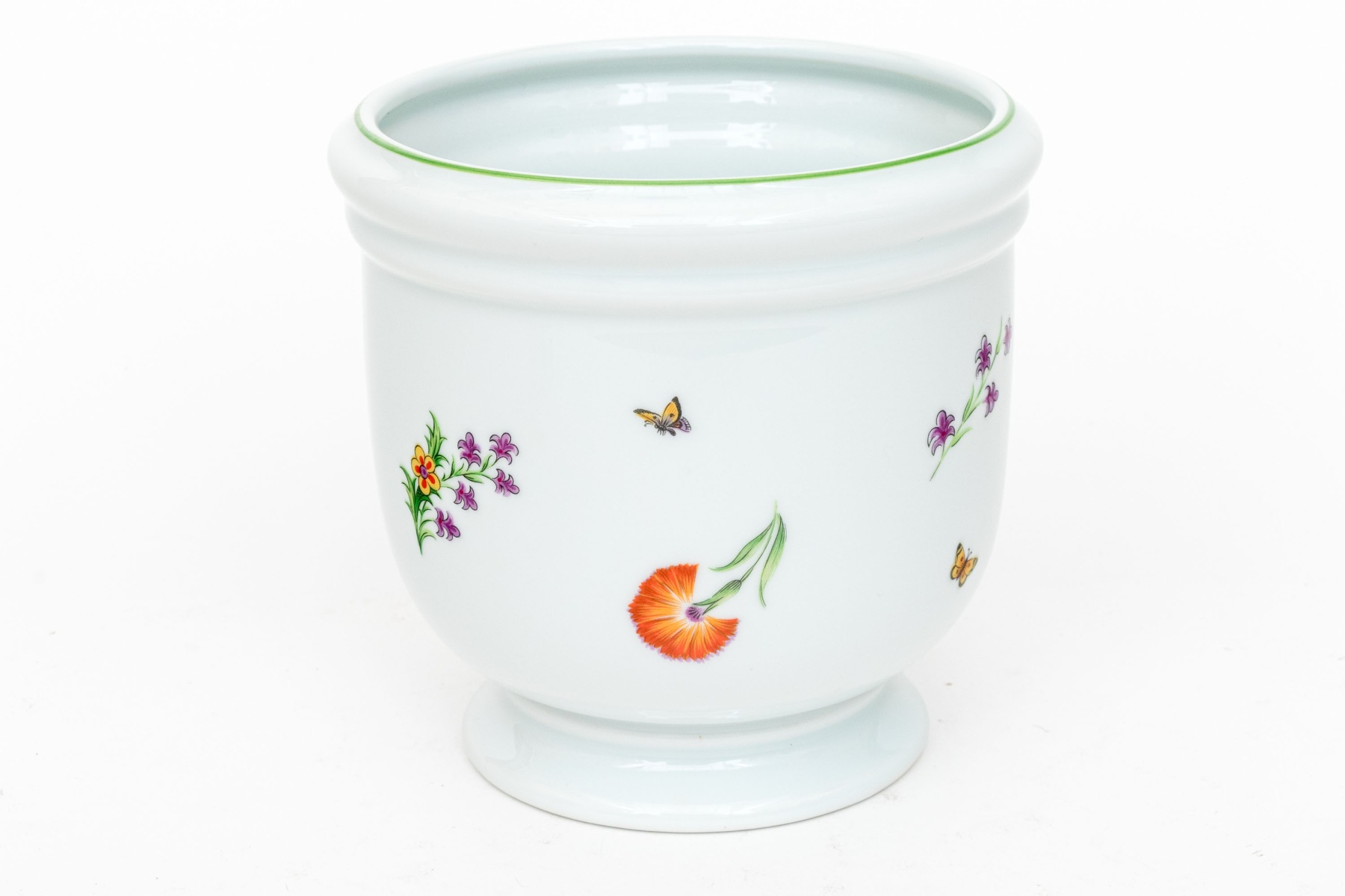 A delightful Tiffany & Co. Limoges "Tiffany Garden" porcelain jardiniere in bright white with dainty purple, orange, and red floral sprays scattered about orange butterflies with green stems and leaves echoed by a fine green trim around a tiered rim, leading down to a stout pedestal foot. Marked underfoot.