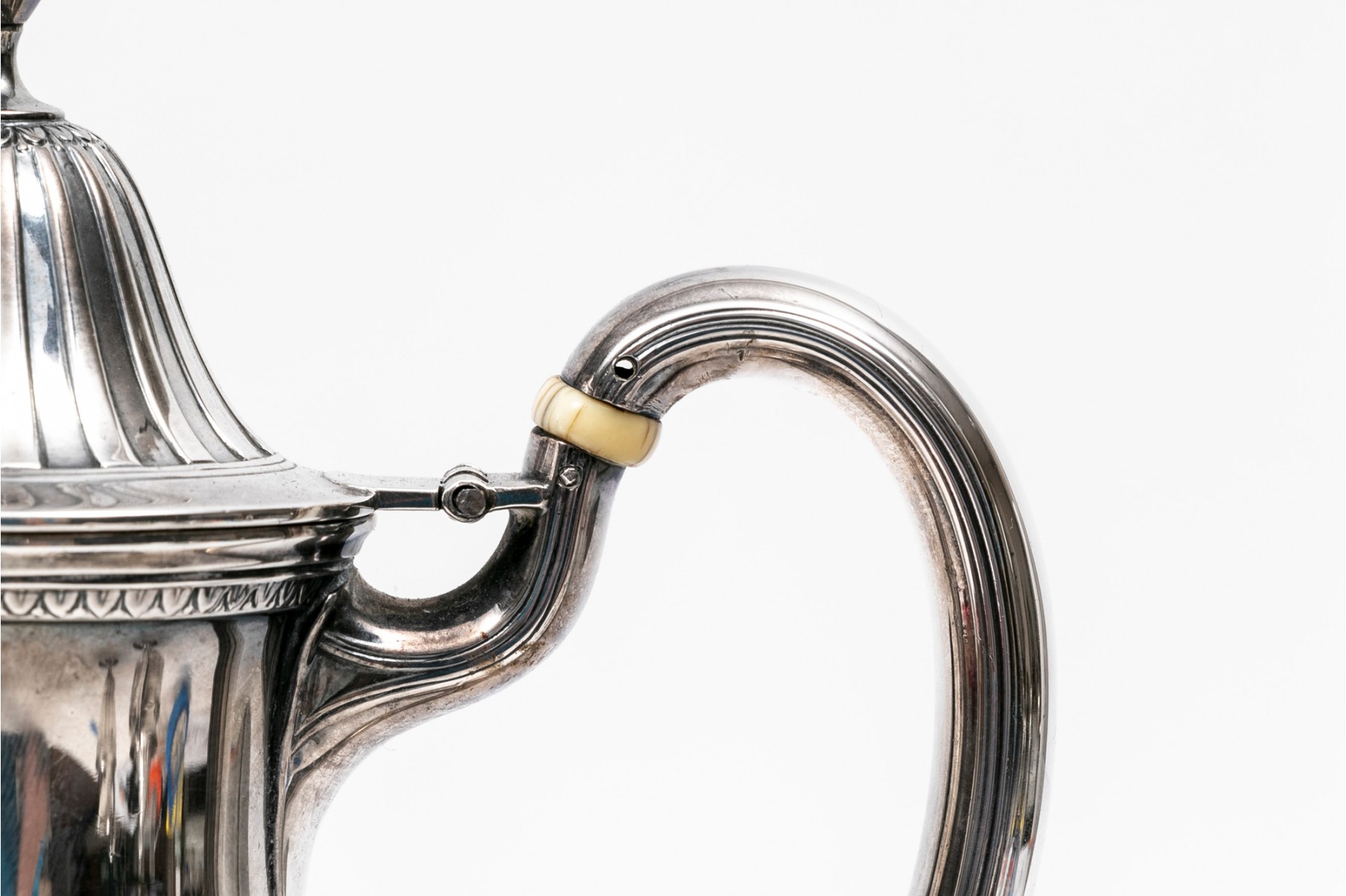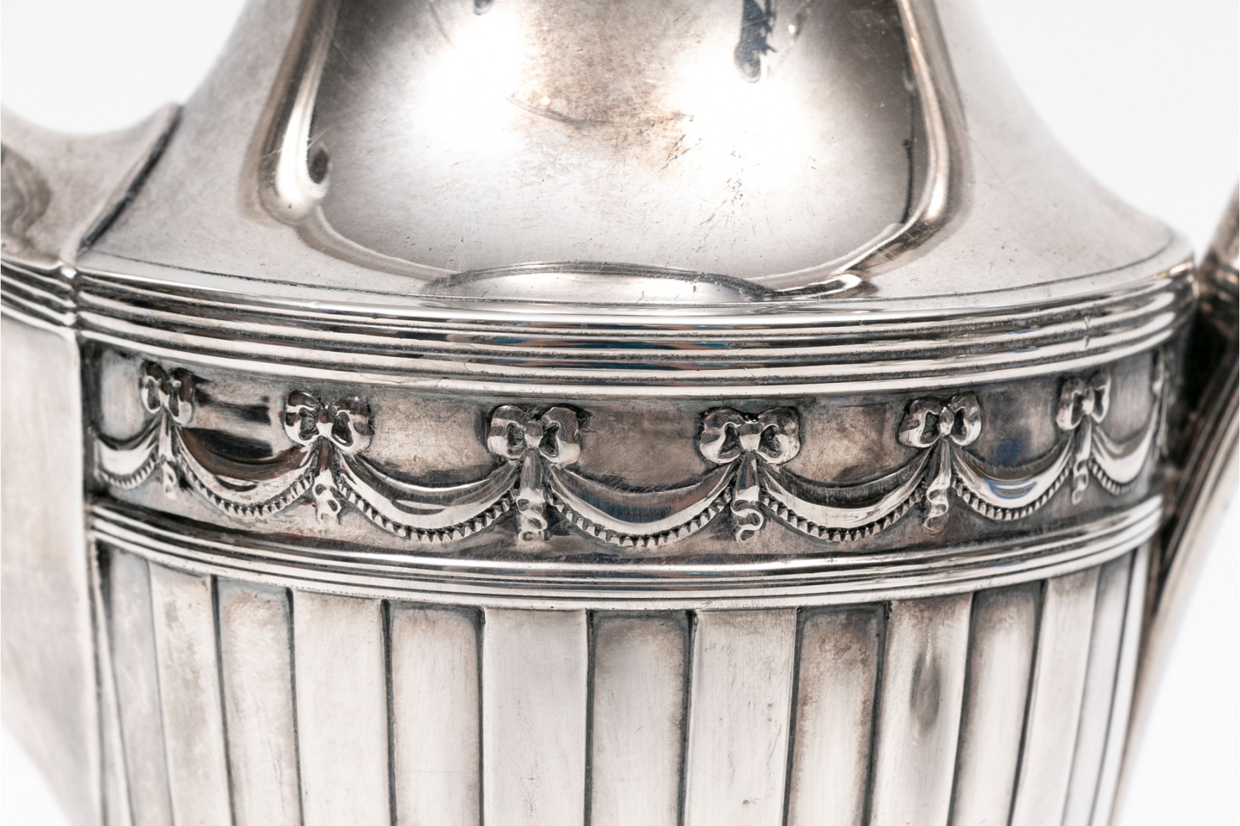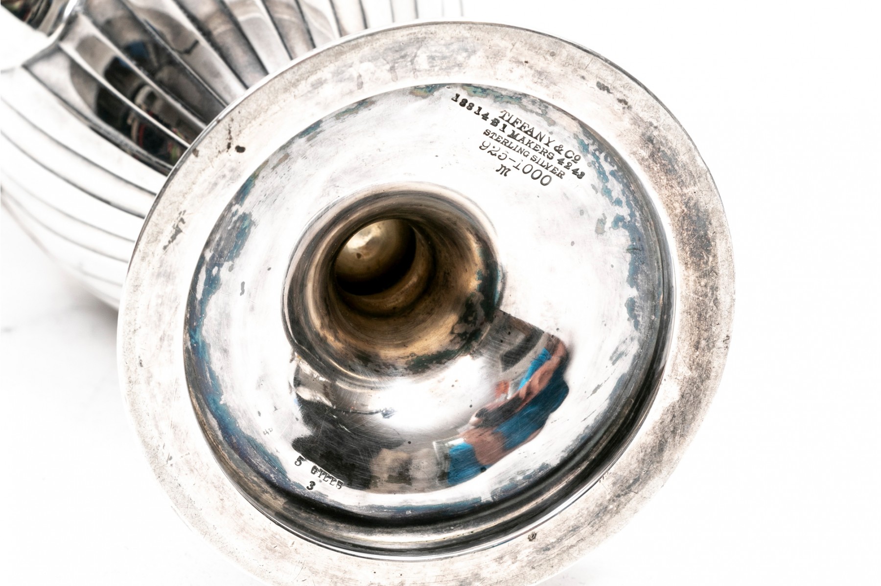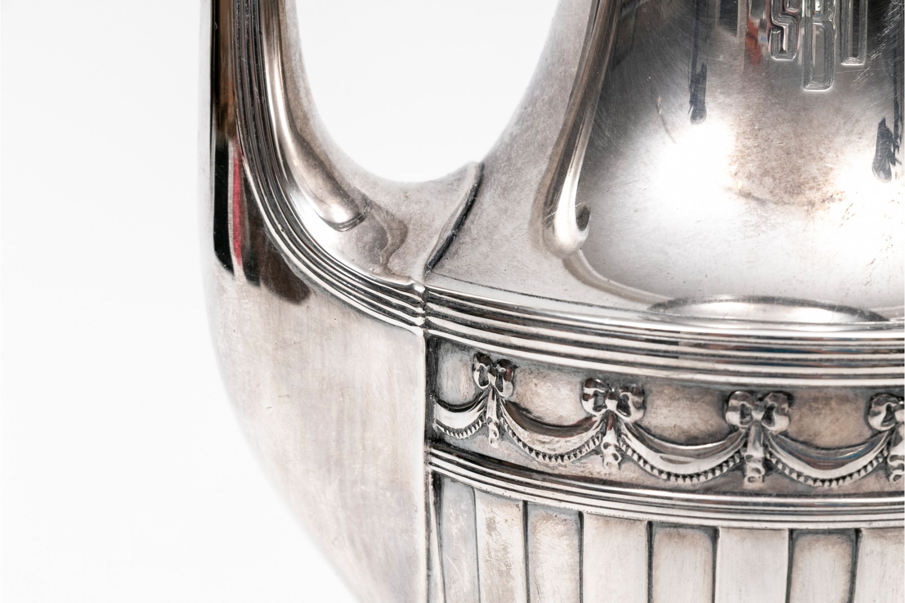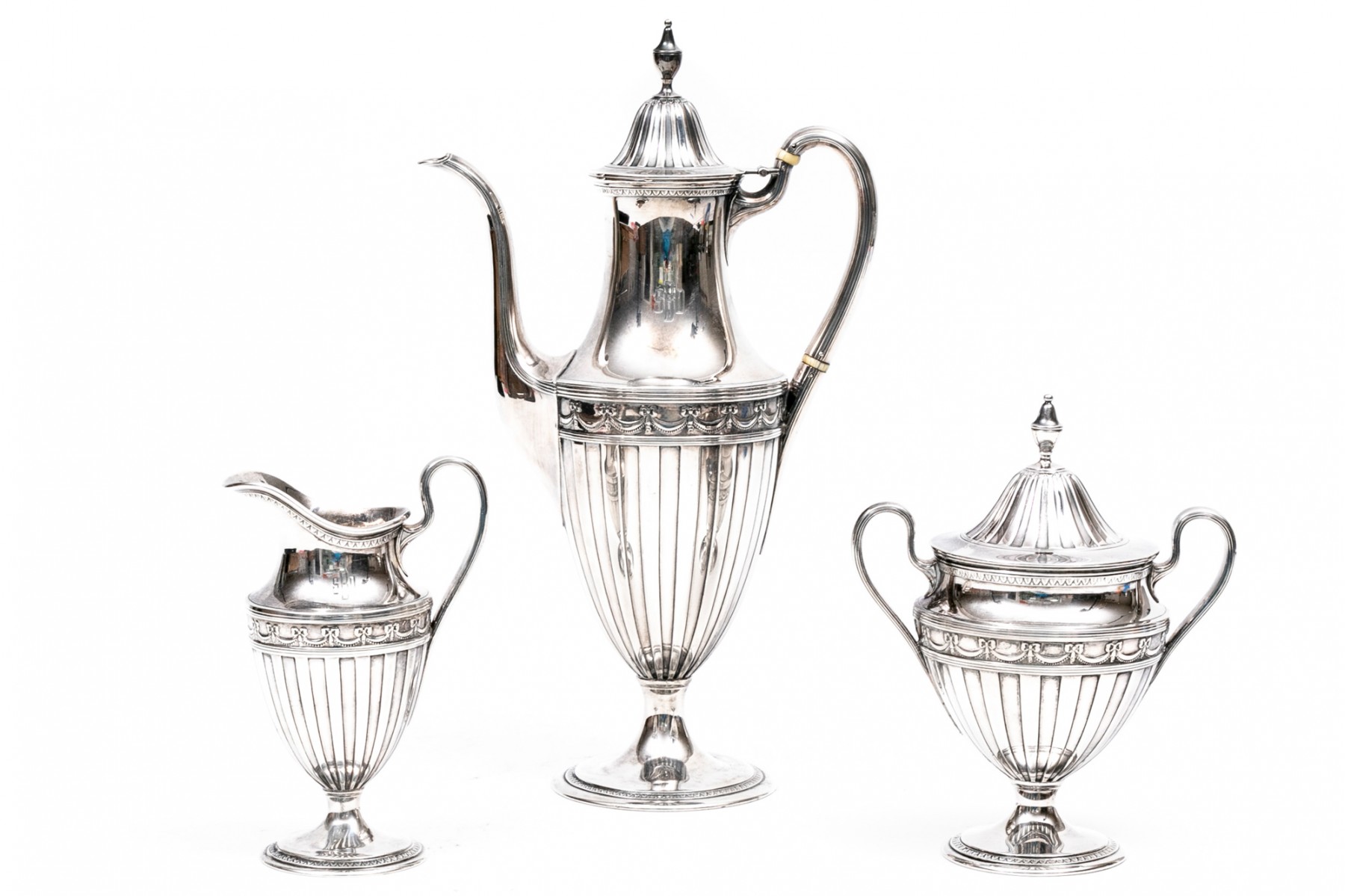 Tiffany & Co. Makers sterling stunning vintage three piece pedestal demitasse set, adorned with a wainscoat patterning and finished with a festooning style decoration