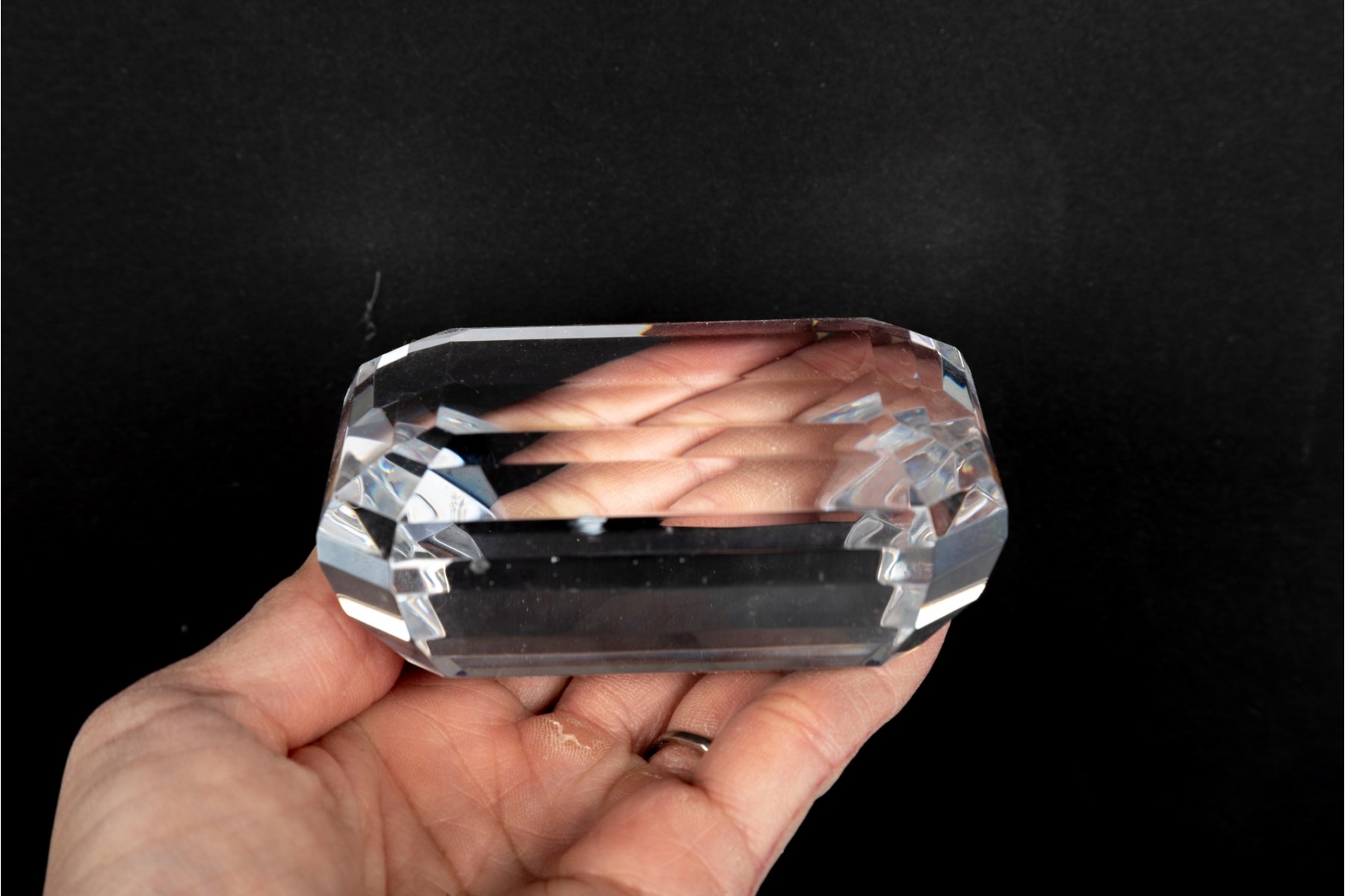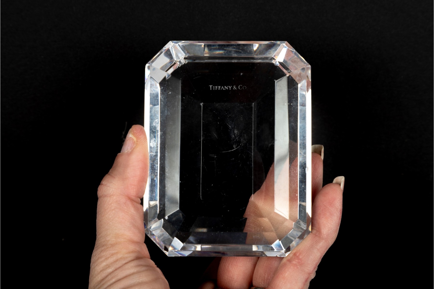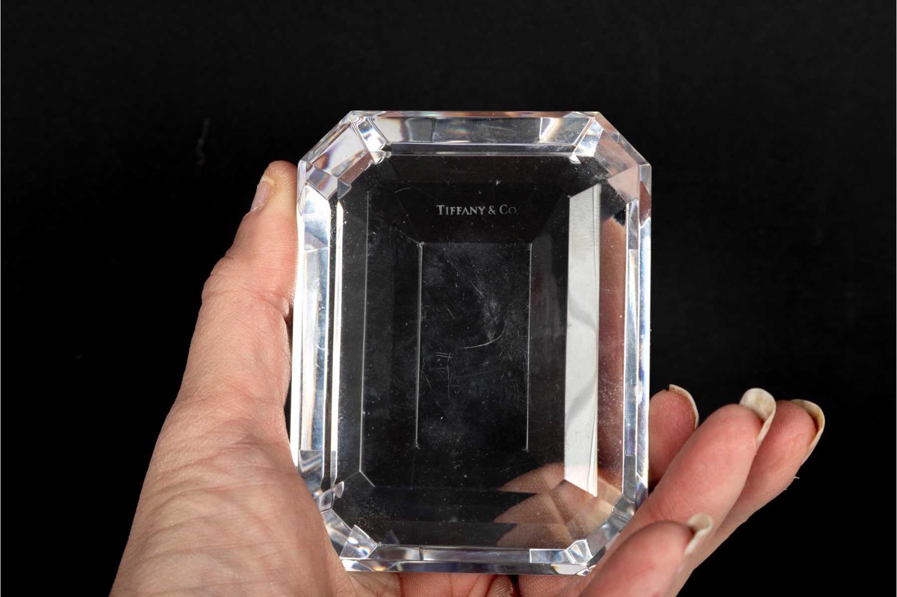 A Tiffany & Co. octagon-cut crystal glass paperweight, showcasing a sleek, multifaceted design that reflects light beautifully