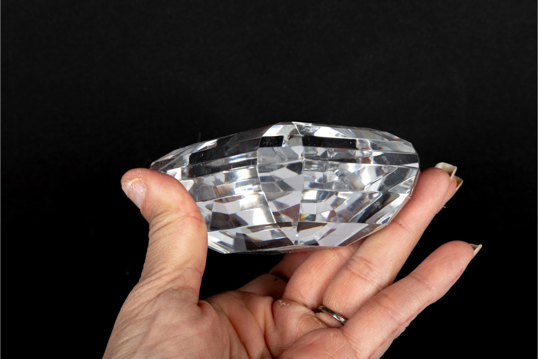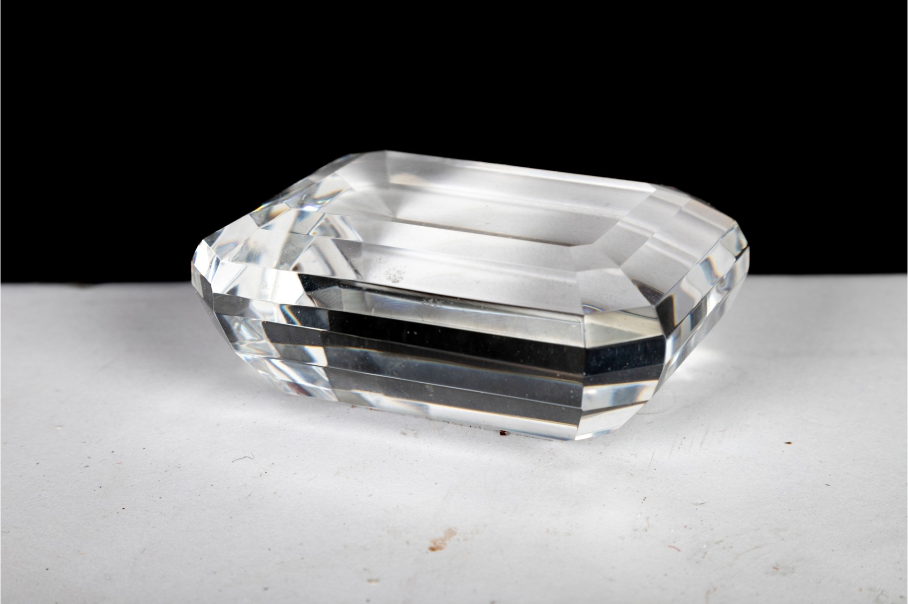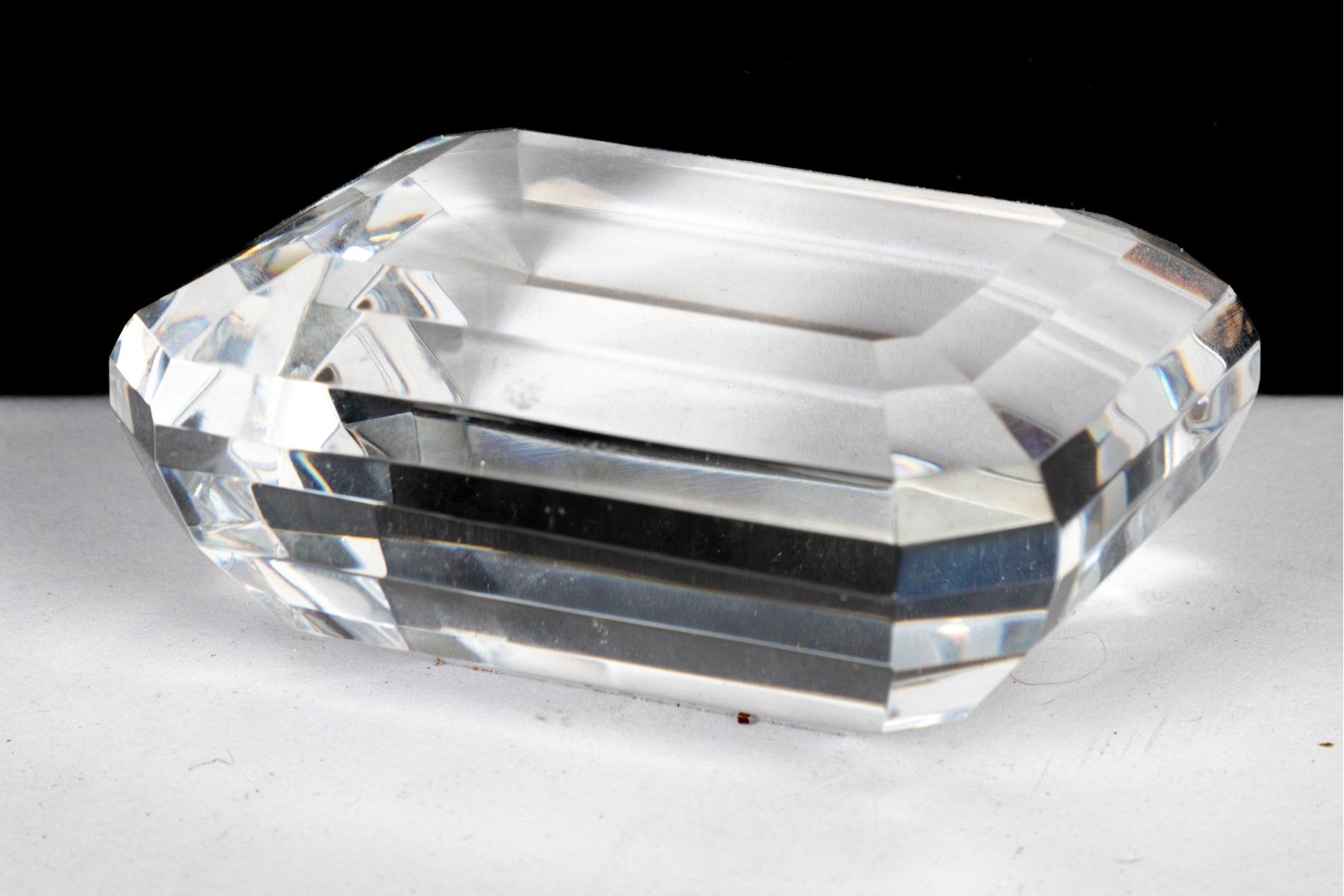 A Tiffany & Co. octagon-cut crystal glass paperweight, showcasing a sleek, multifaceted design that reflects light beautifully