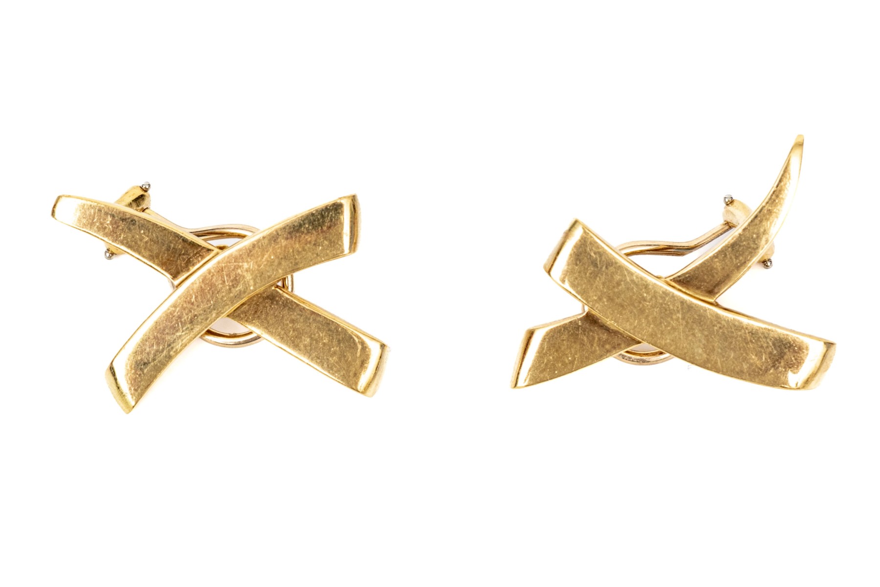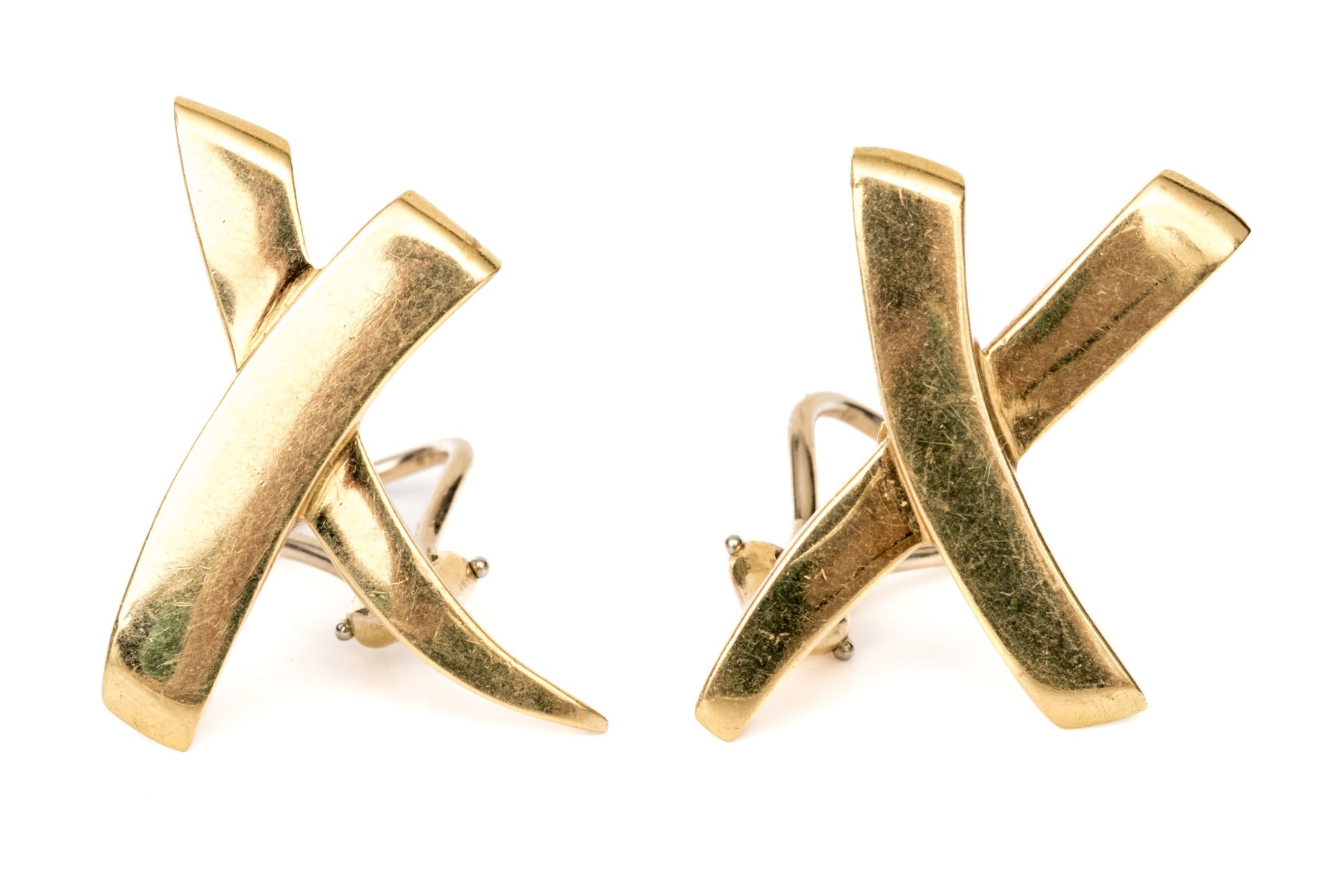 Tiffany & Co. Paloma Picasso 18k yellow gold fabulous large grafiti hugs "x" earrings, finished with omega style backs and no posts
