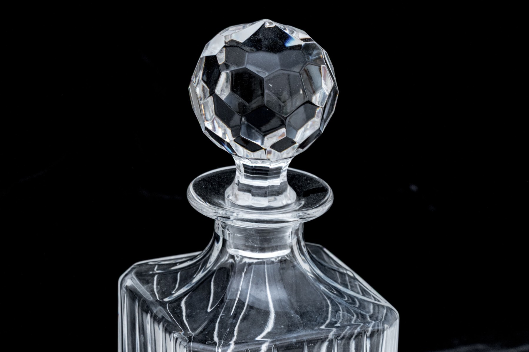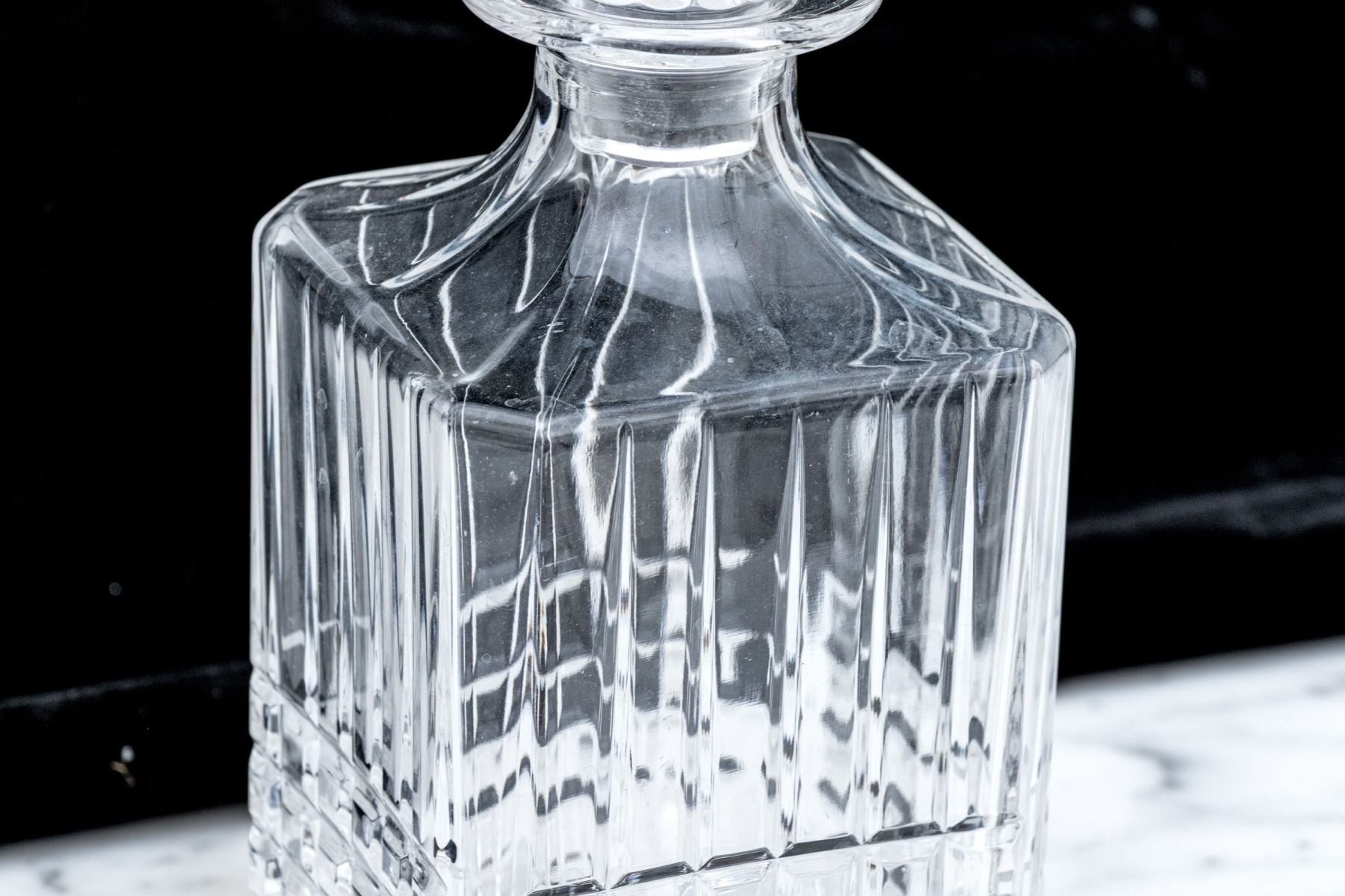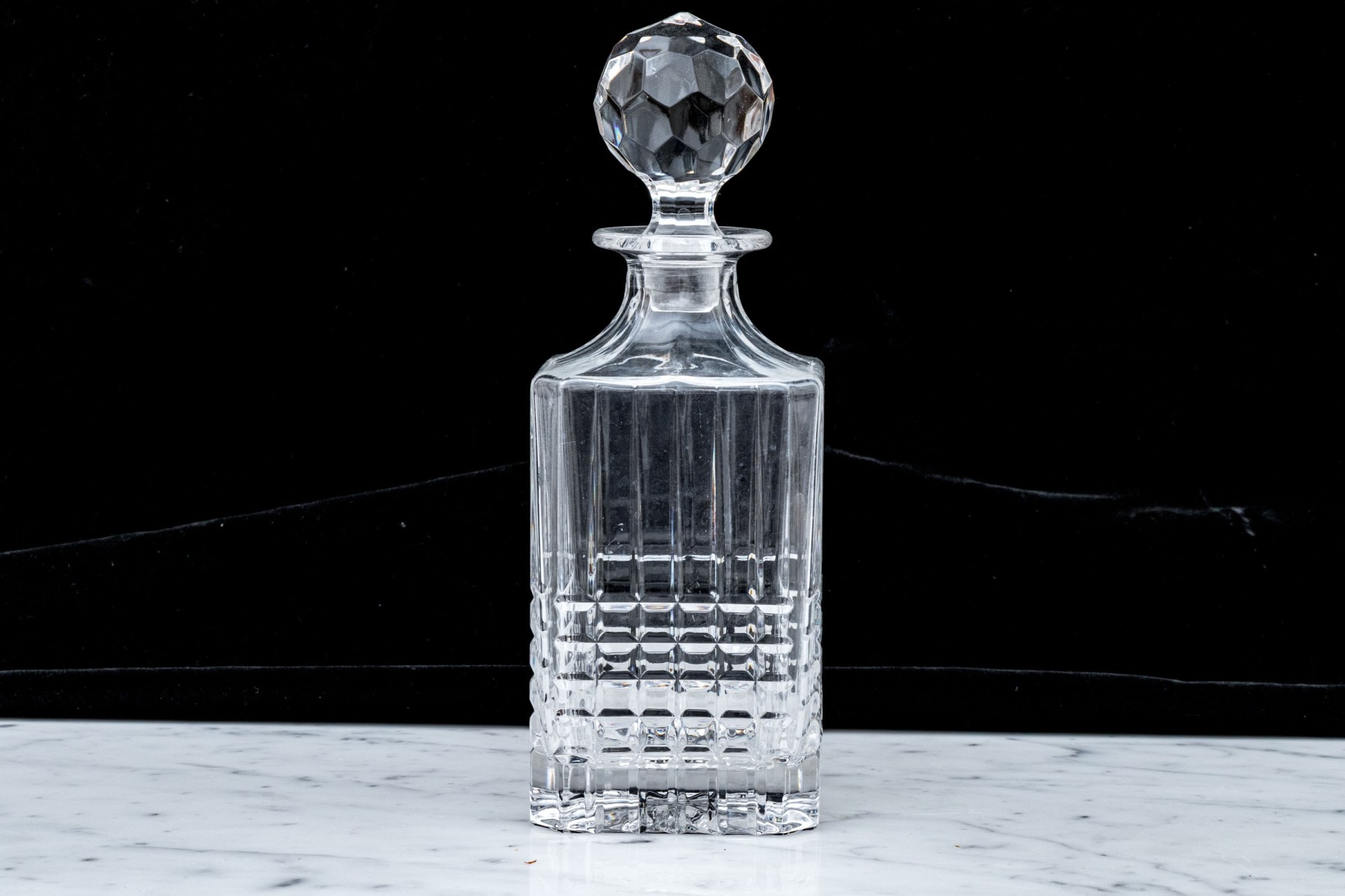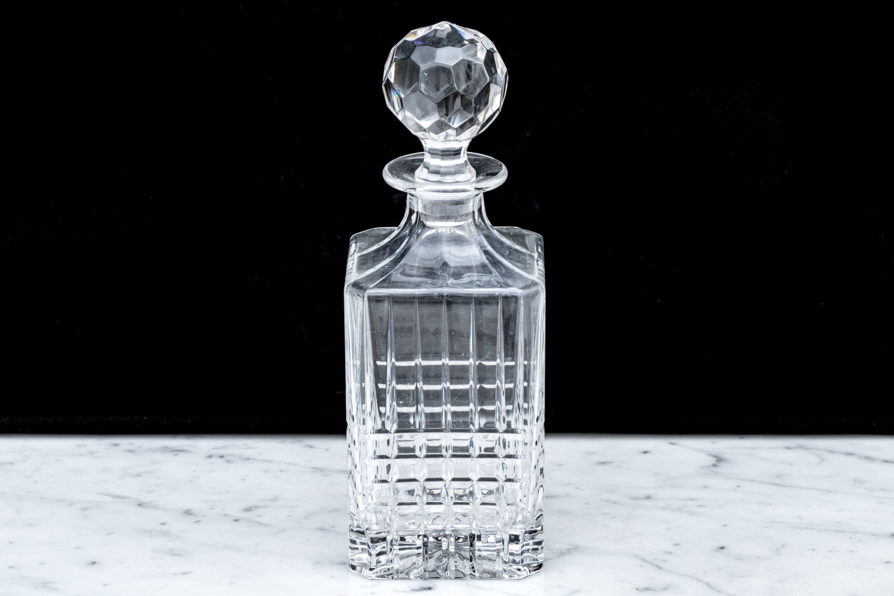 A stylish Tiffany & Co. "Plaid" pattern crystal decanter with a classic rectangular form emphasized by a square gridded design with elongated verticals reaching up towards a tapered and flared mouth topped by a faceted sphere stopper. Marked underfoot.