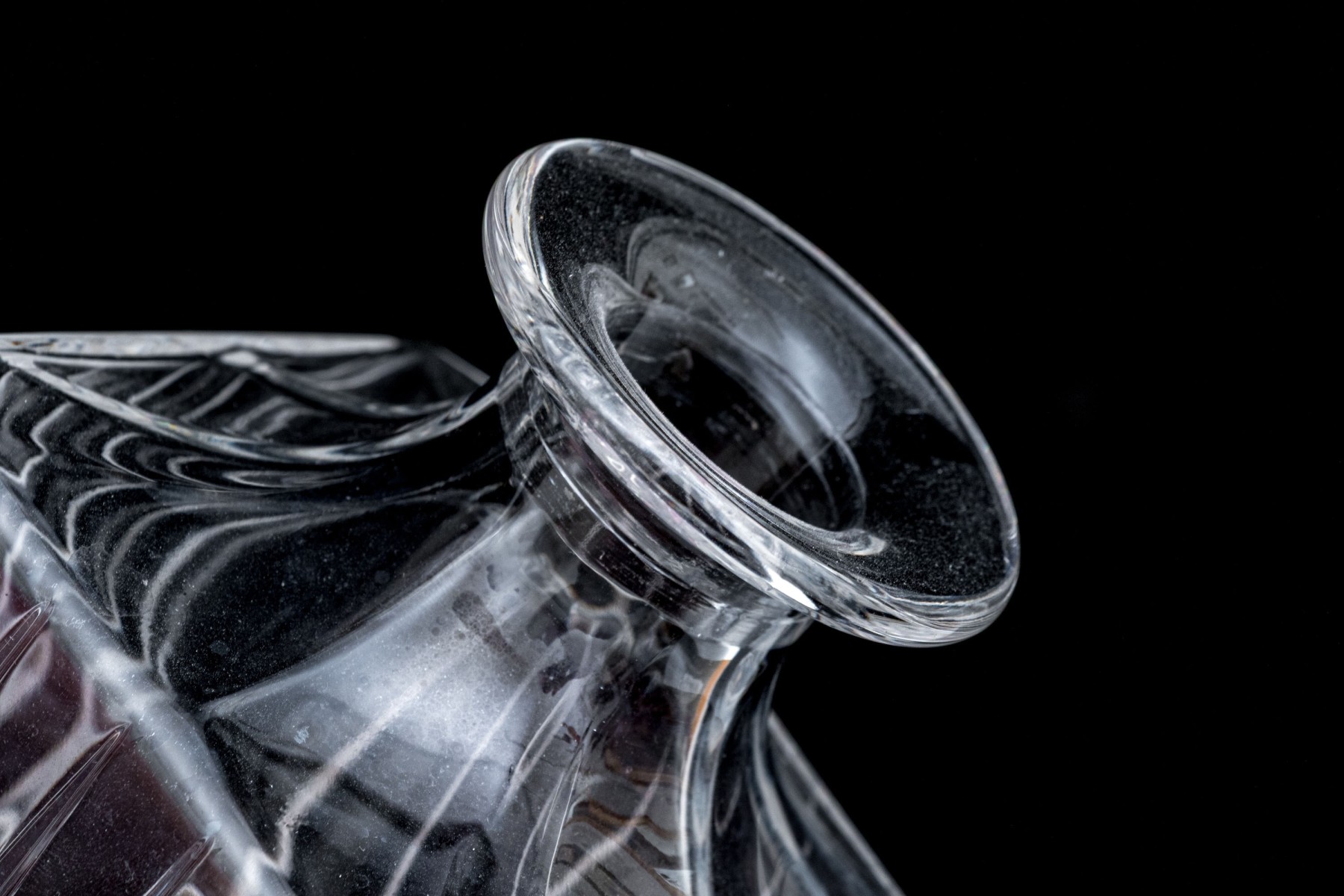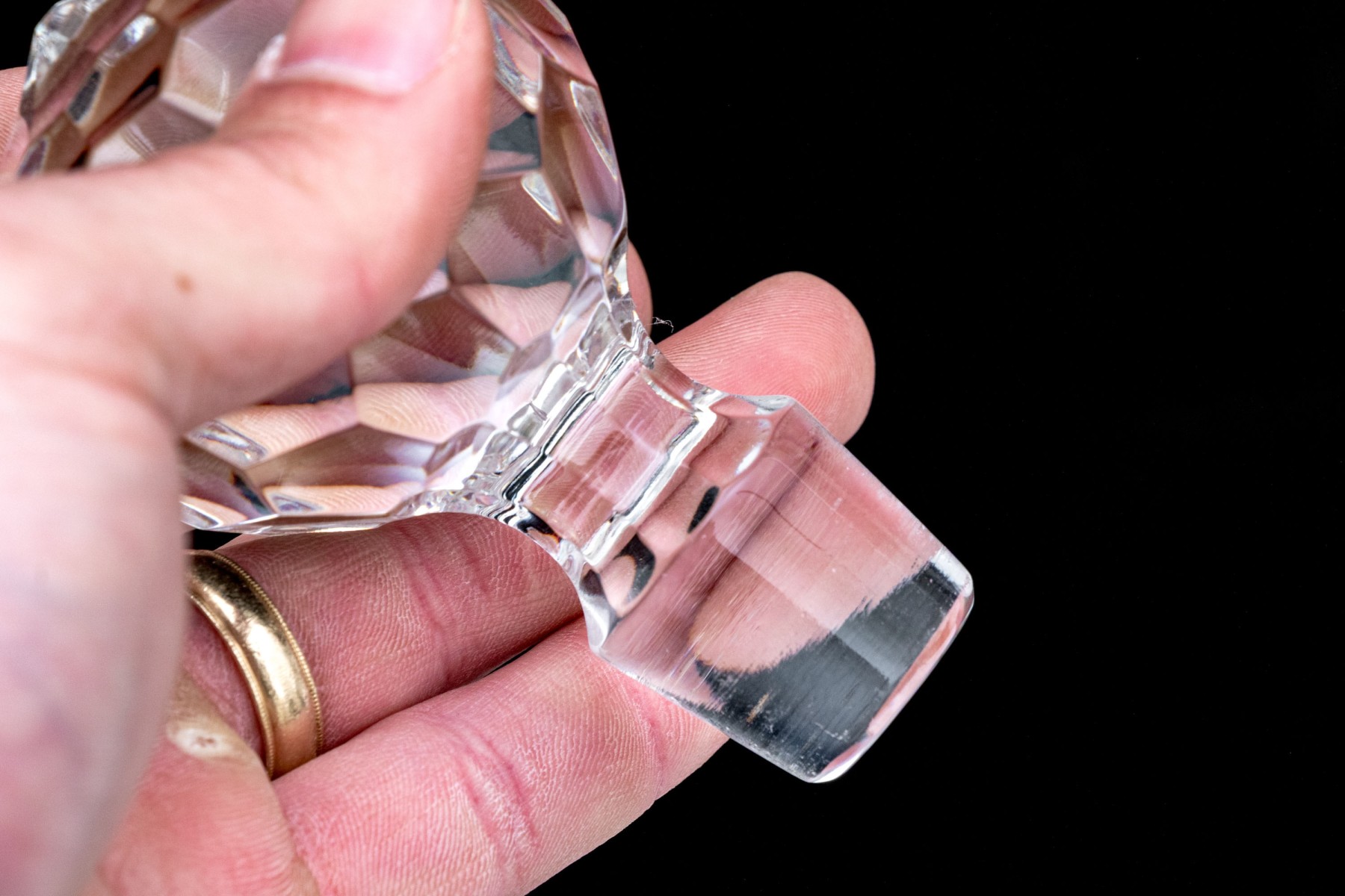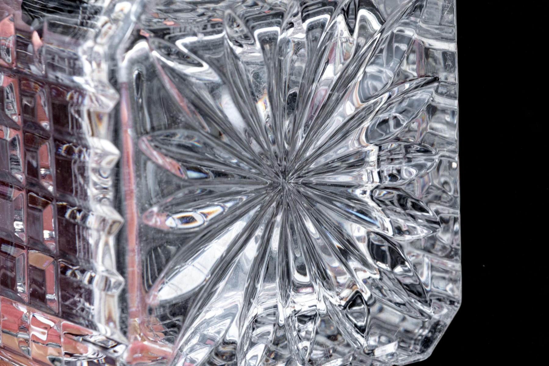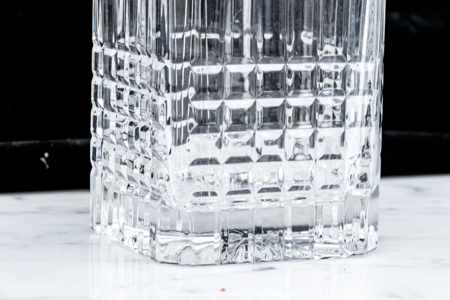 A stylish Tiffany & Co. "Plaid" pattern crystal decanter with a classic rectangular form emphasized by a square gridded design with elongated verticals reaching up towards a tapered and flared mouth topped by a faceted sphere stopper. Marked underfoot.