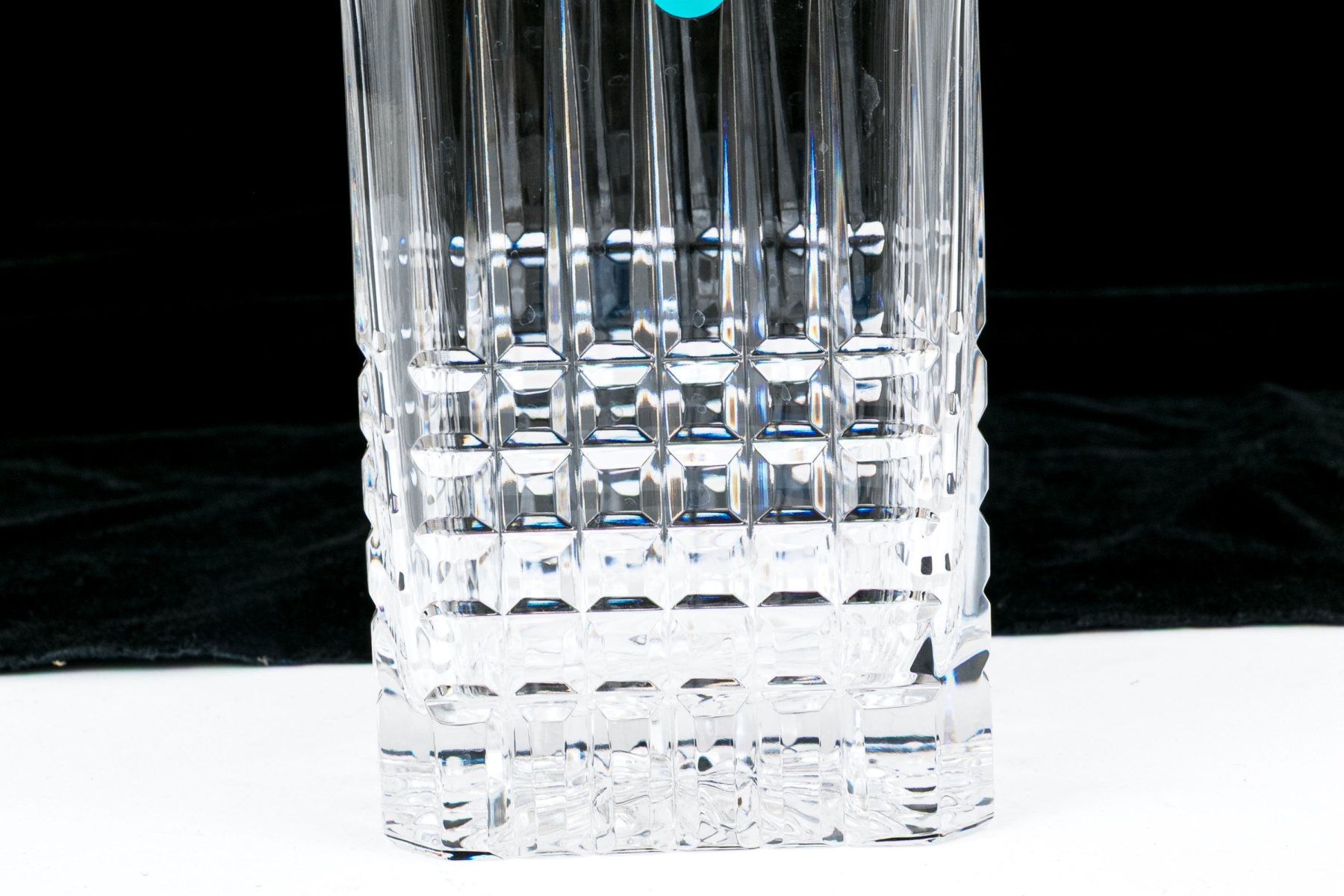 An elegant Tiffany & Co. "Plaid" Italian crystal decanter featuring a large hexagonal faceted sphere stopper fitting in a wide rimmed bottle neck tapering out to a tall, square body. The body is beautifully cut with a beveled grid that catches the light beautifully, making for a timeless and sophisticated design.