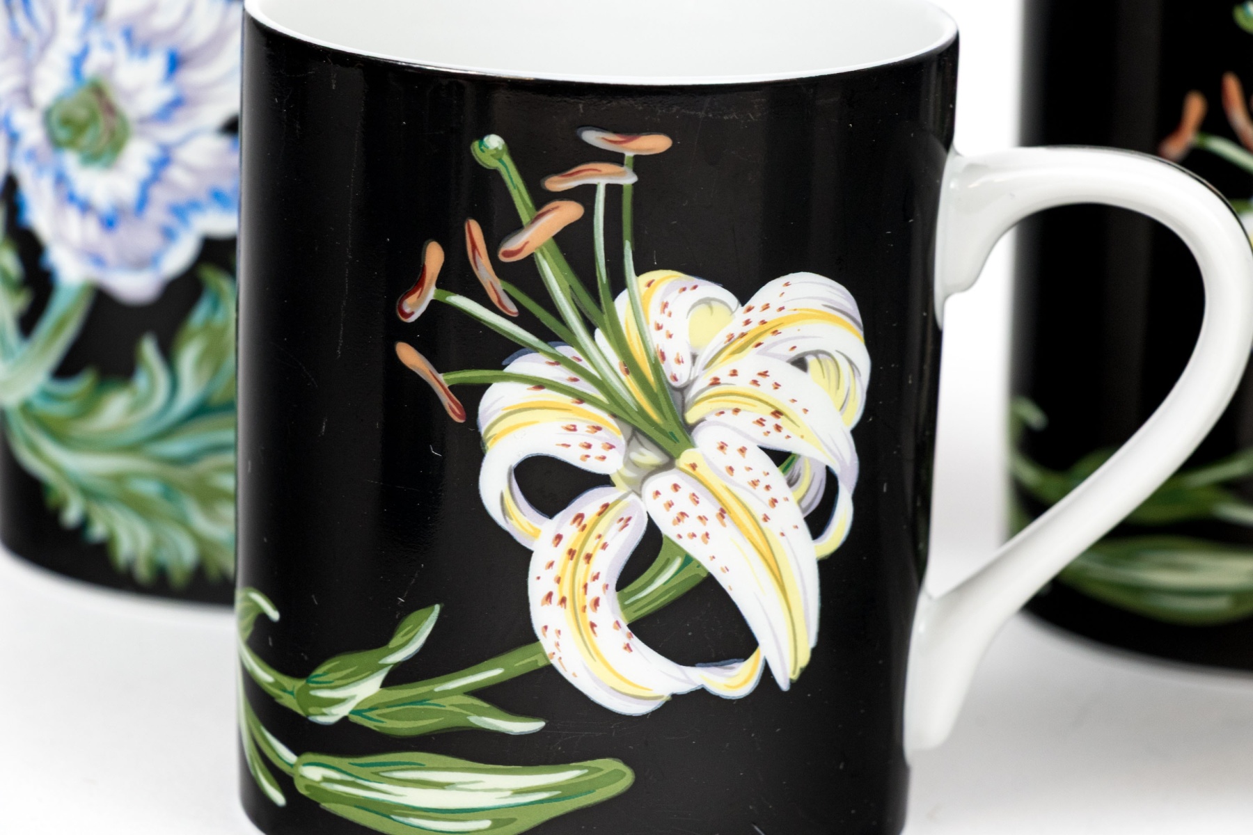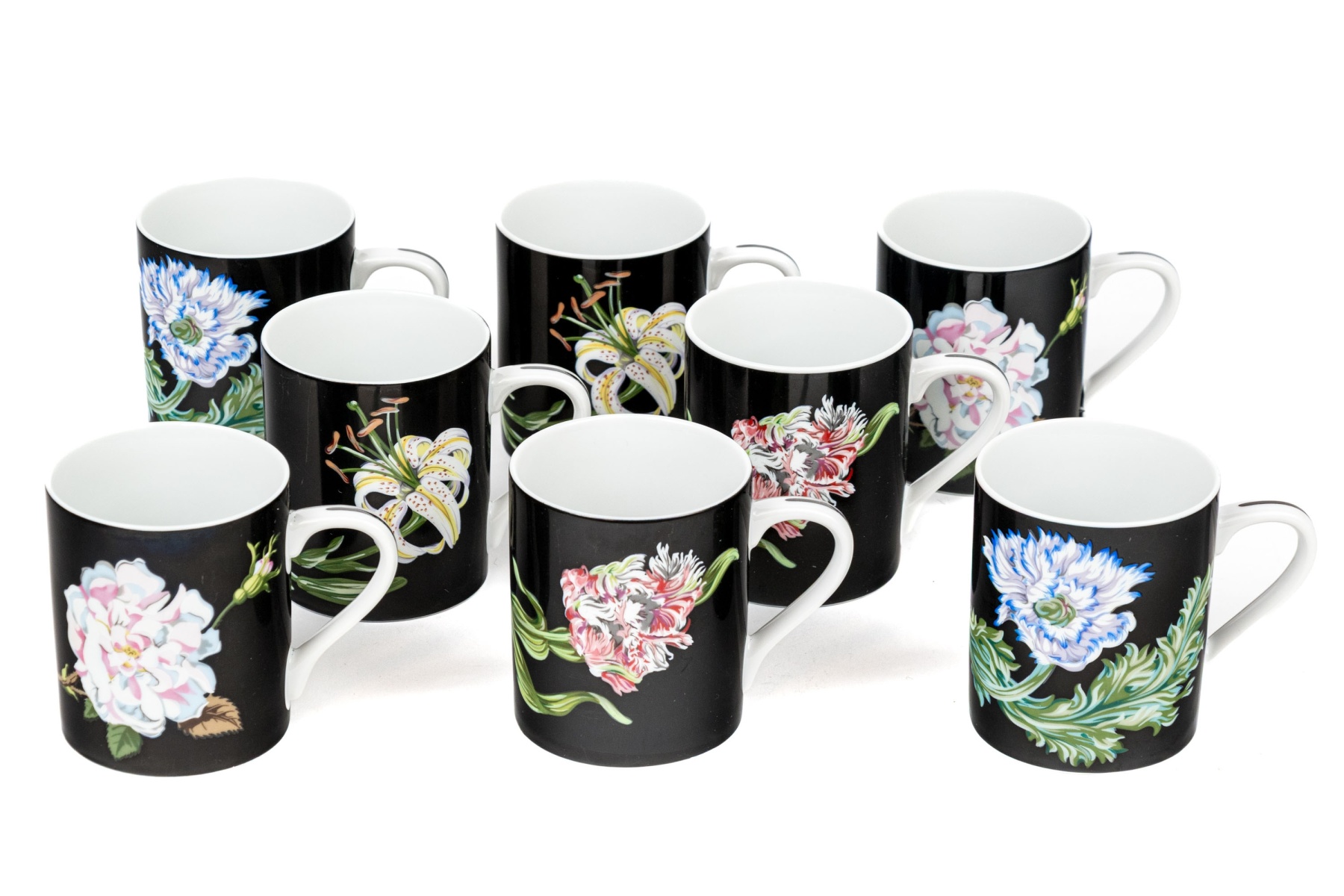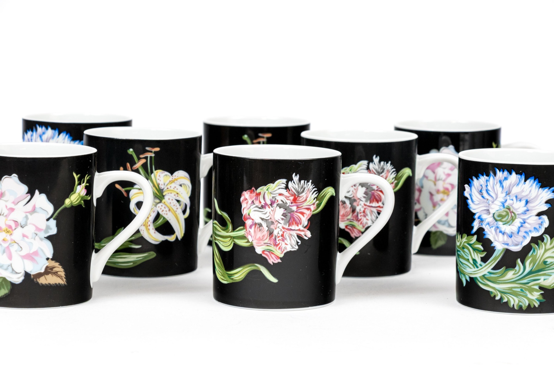 A beautiful set of eight Tiffany & Co. “Mrs. Delany’s Flowers” coffee cups, each decorated with meticulously rendered botanical illustrations inspired by the famed floral collages of Mary Delany. The delicate blooms and crisp porcelain forms create a refined, garden-inspired presentation. An elegant and collectible service from one of Tiffany’s most beloved decorative patterns.