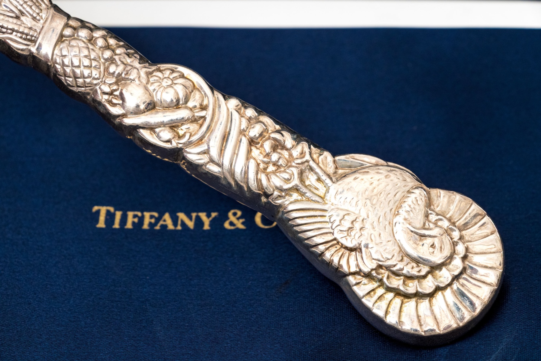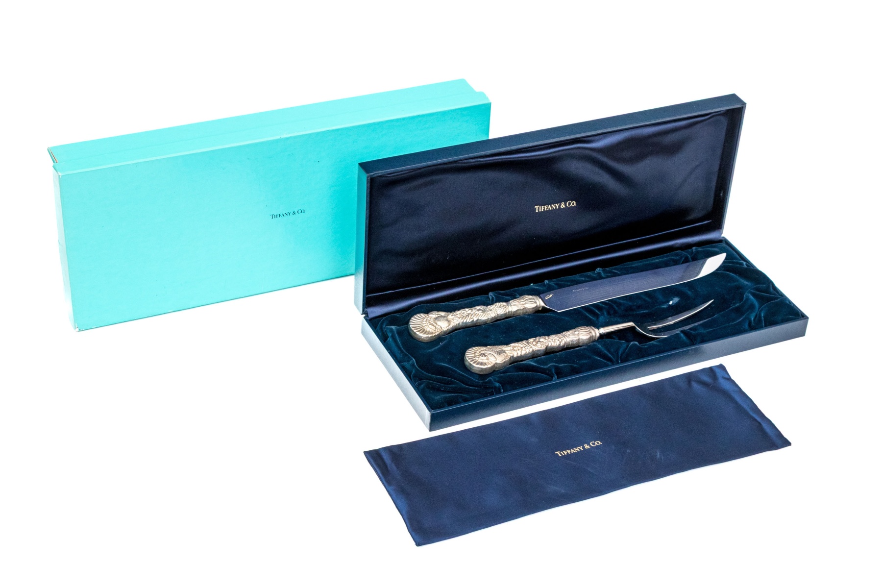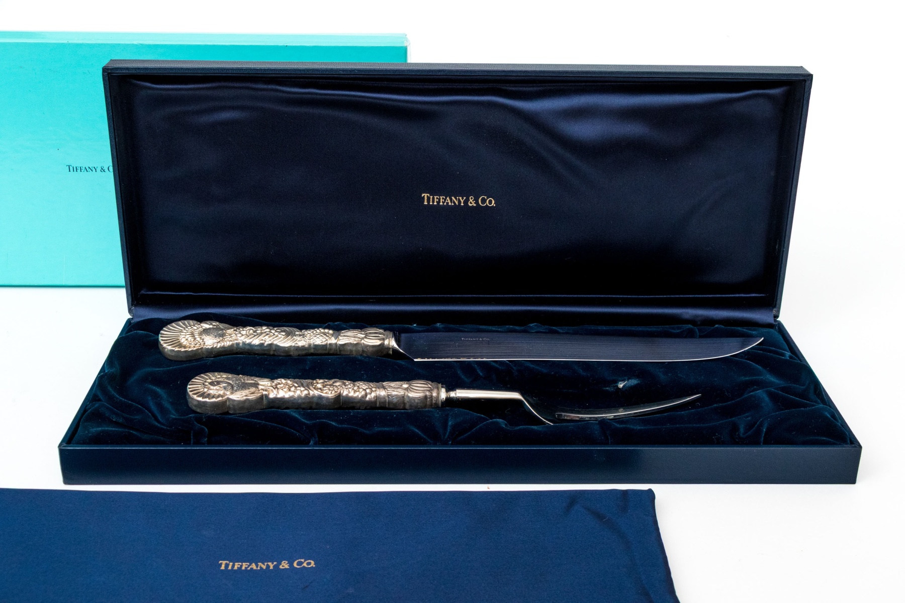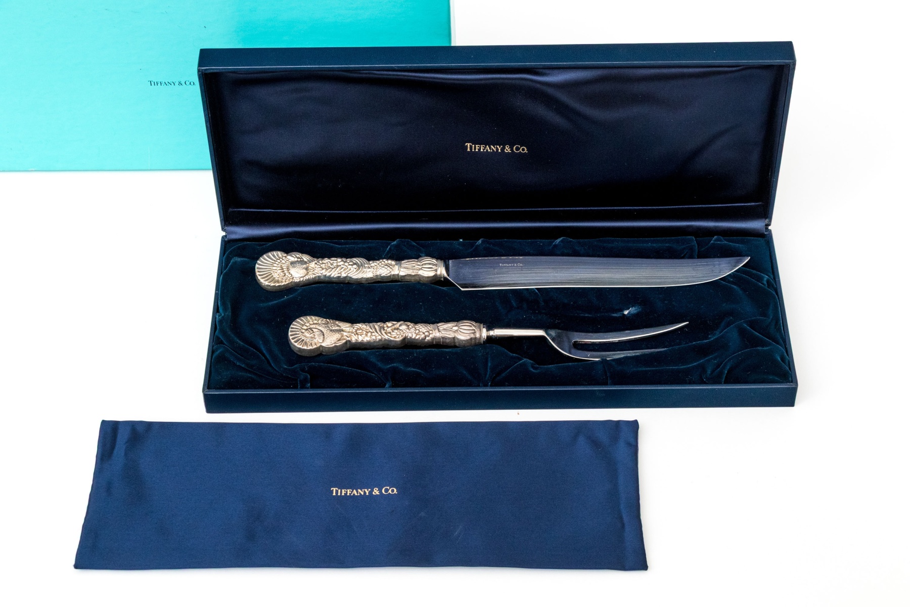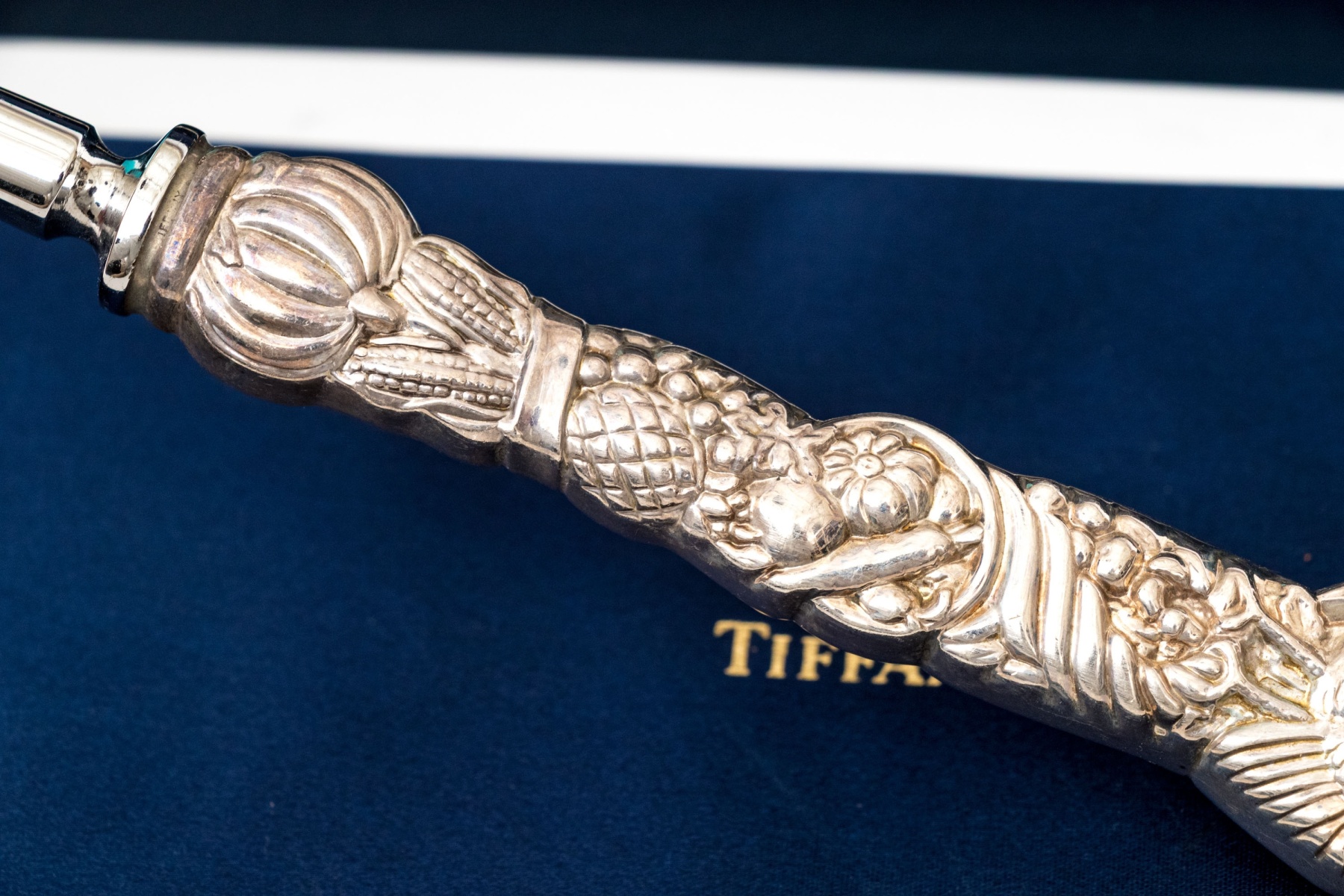 A wonderful Tiffany & Co. meat carving set including a fork and slice in a velvet covered storage case with the original teal blue box and cover.
