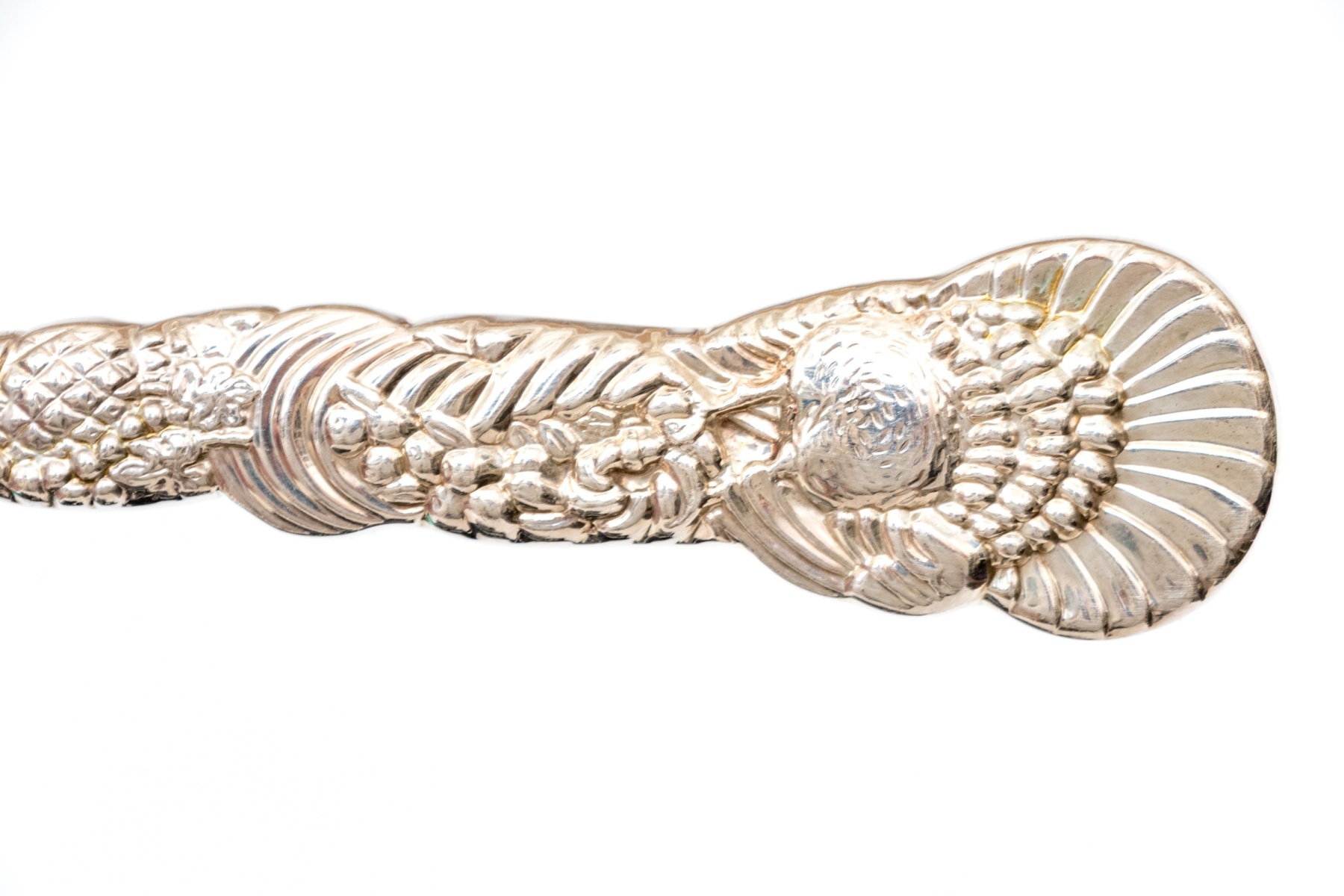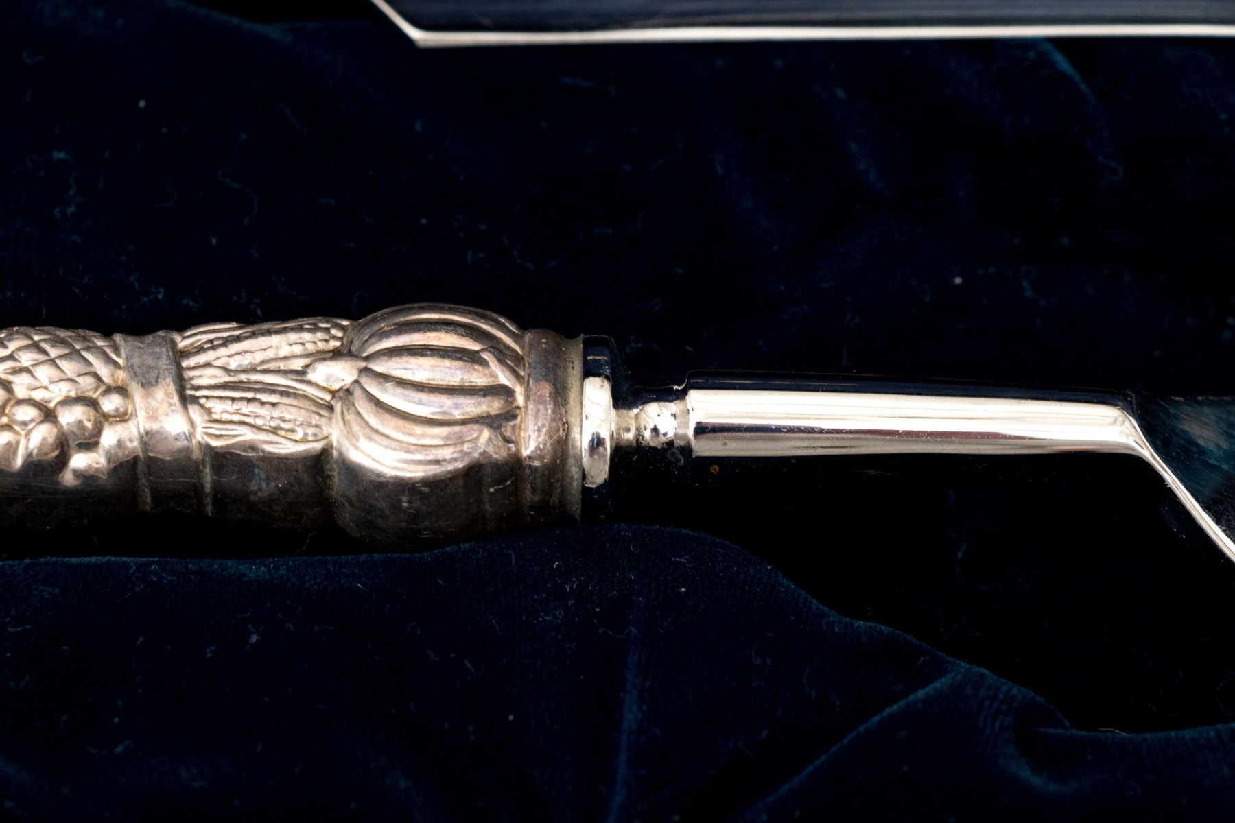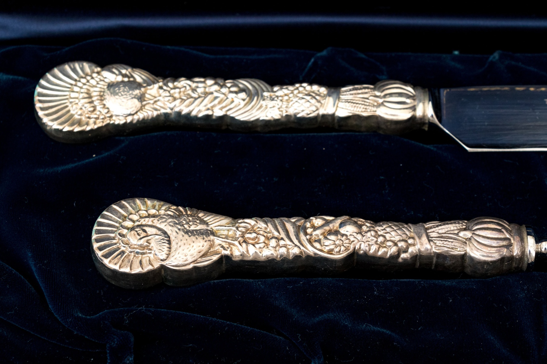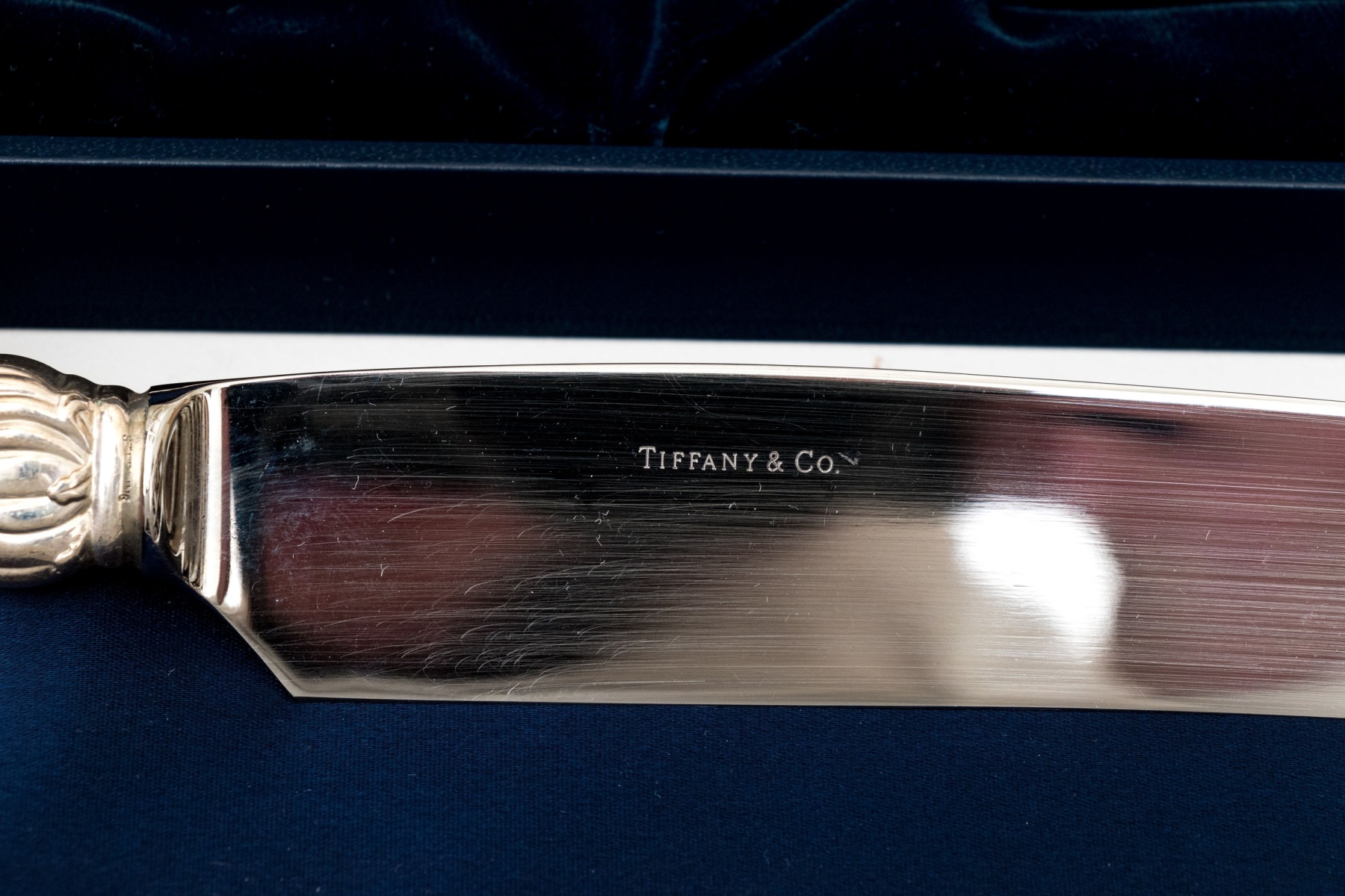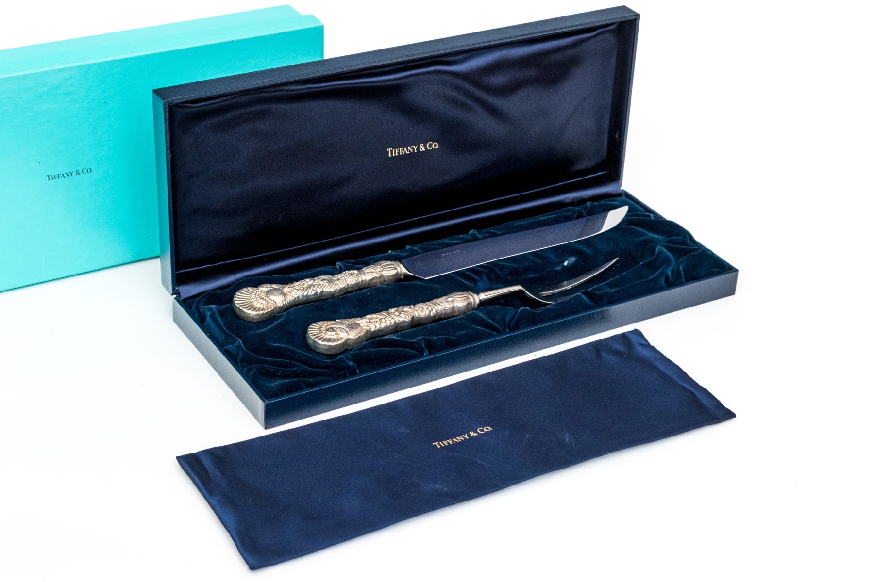 A wonderful Tiffany & Co. meat carving set including a fork and slice in a velvet covered storage case with the original teal blue box and cover.