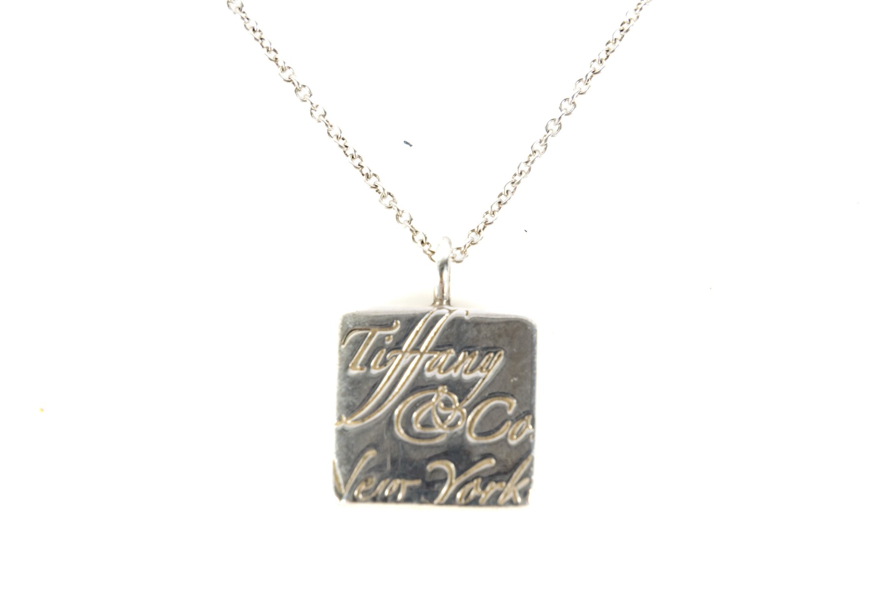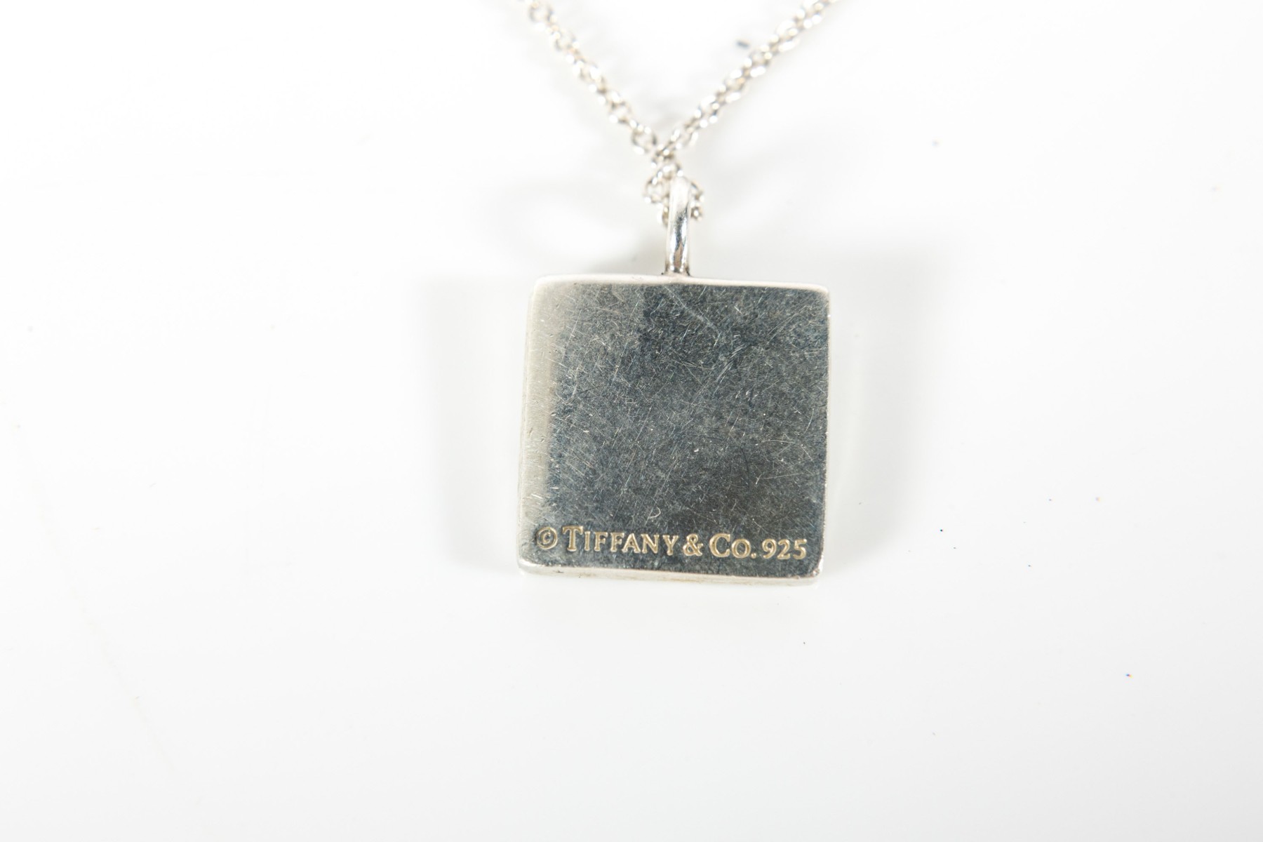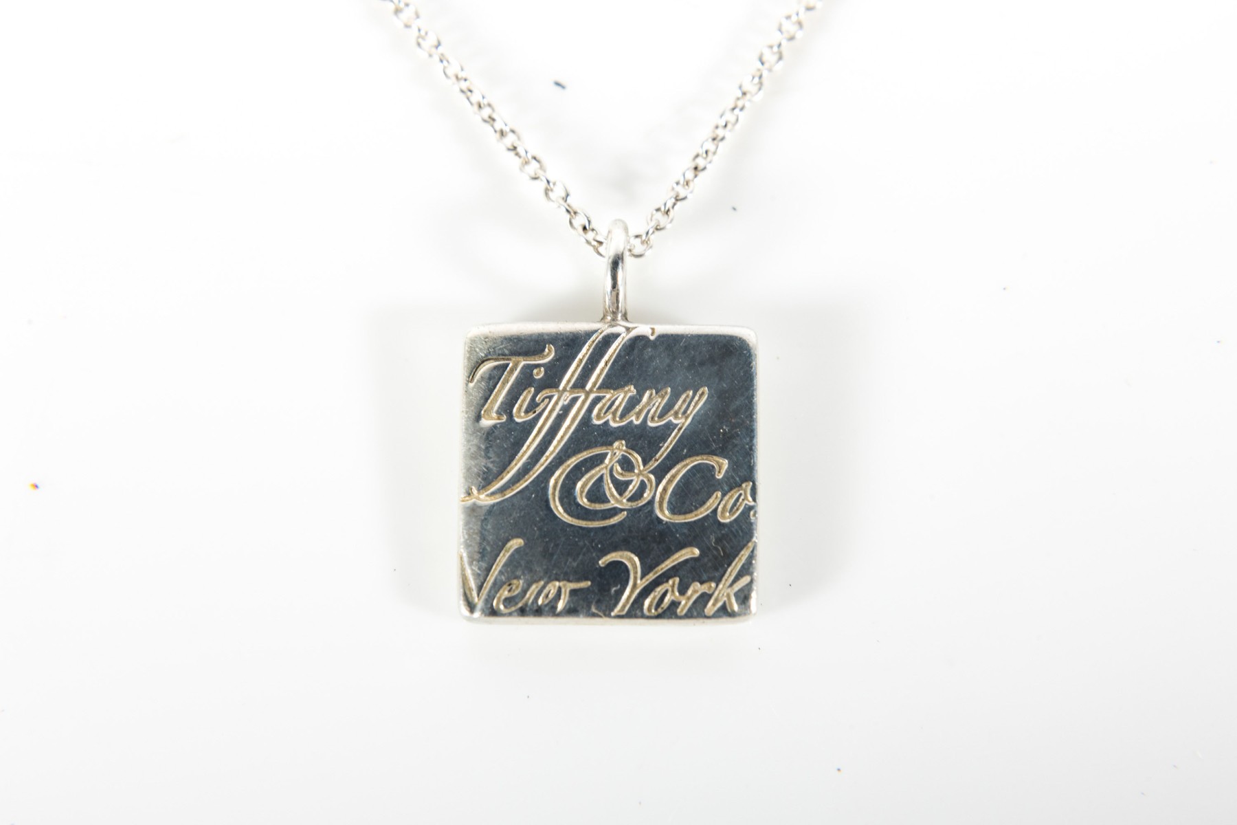 A Tiffany & Company marked sterling silver "Square Notes" pendant and chain inscribed with "Tiffany & Co New York" and on reverse with Tiffany & Co. 925. Original Tiffany jewelry bag included.