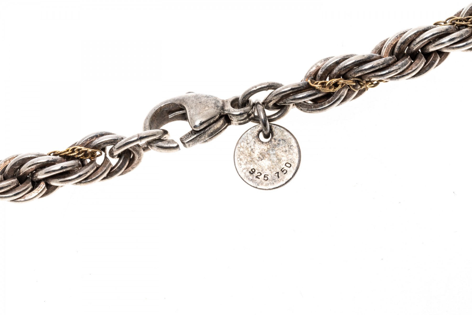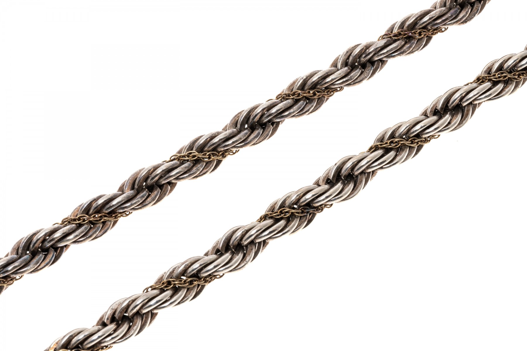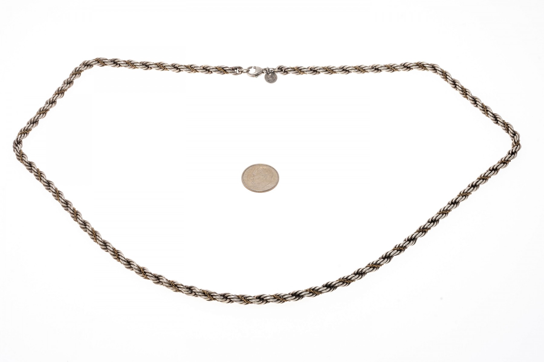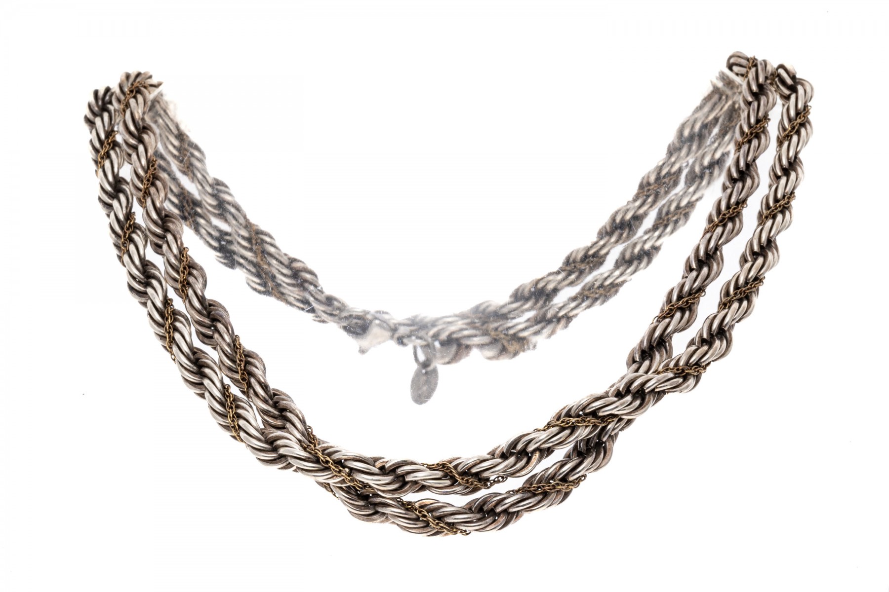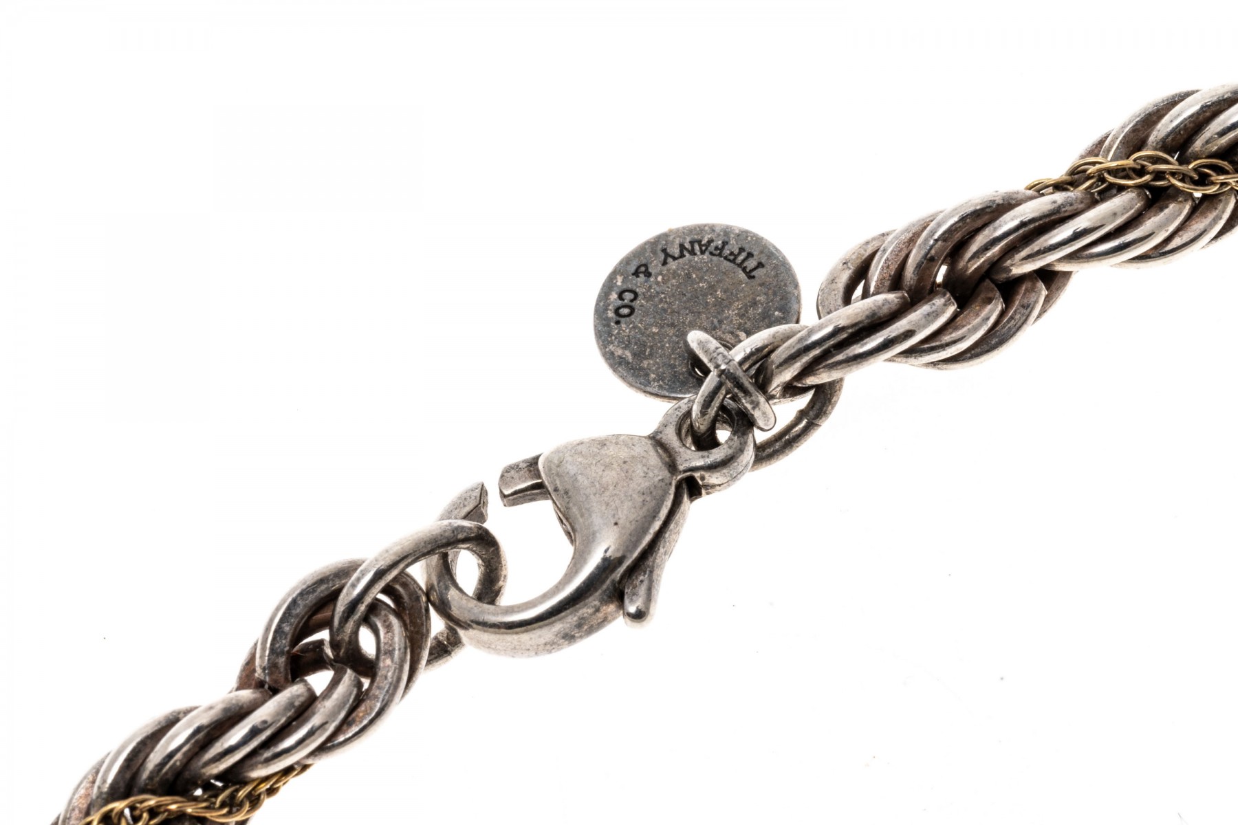 A Tiffany & Company sterling silver helix style chain necklace. Wrapped around the chain is an 18K yellow gold accent chain. Lobster claw clasp.