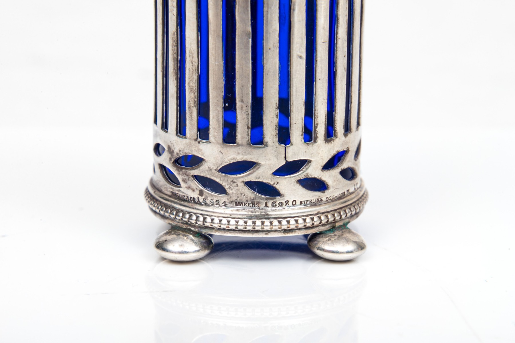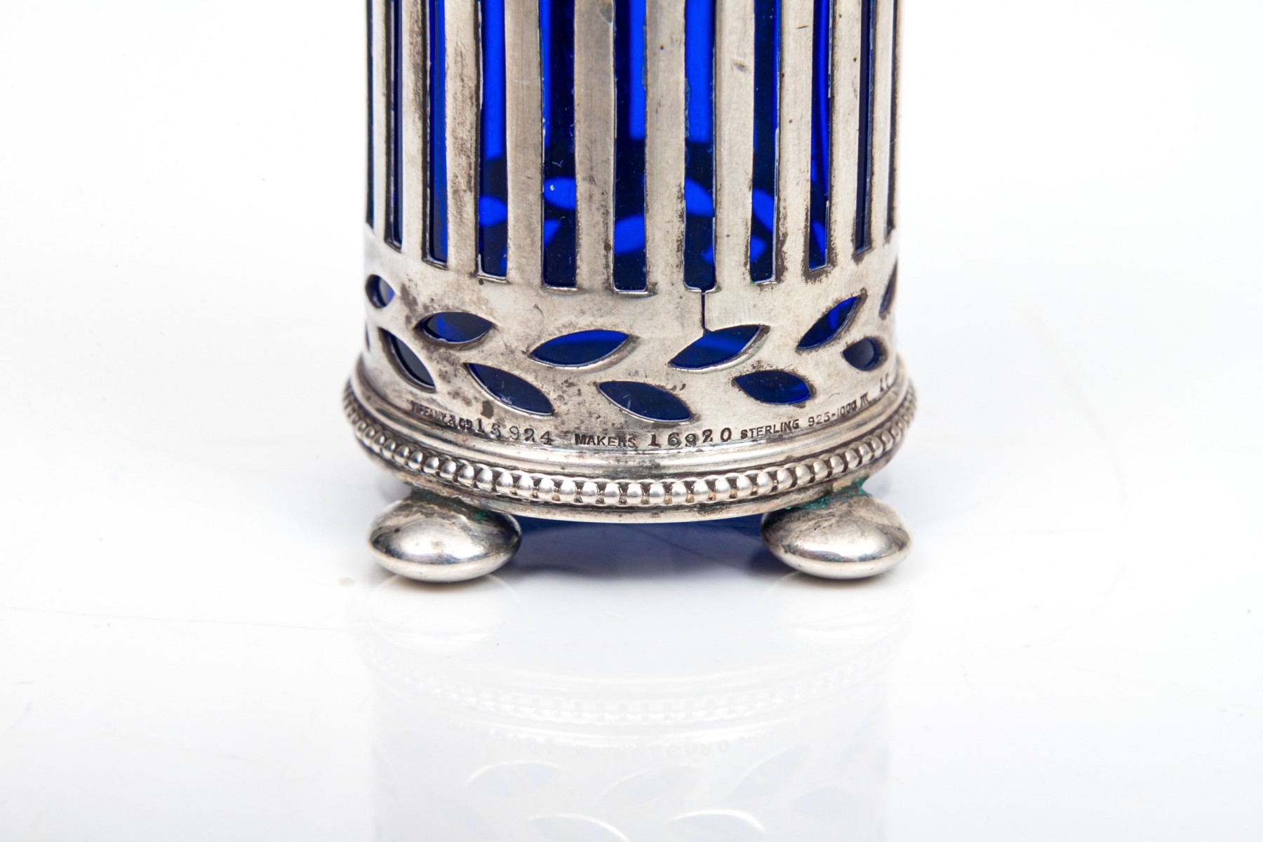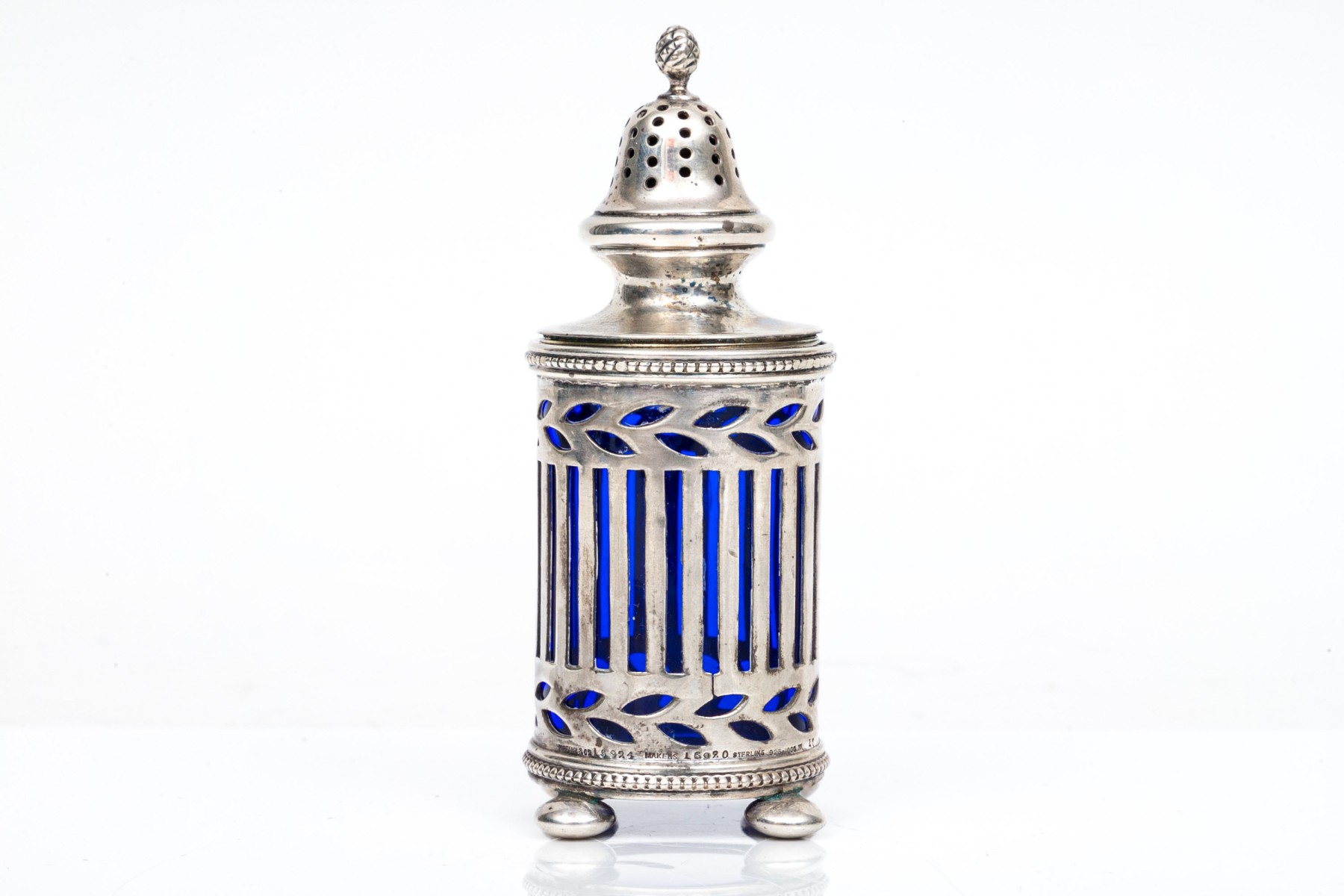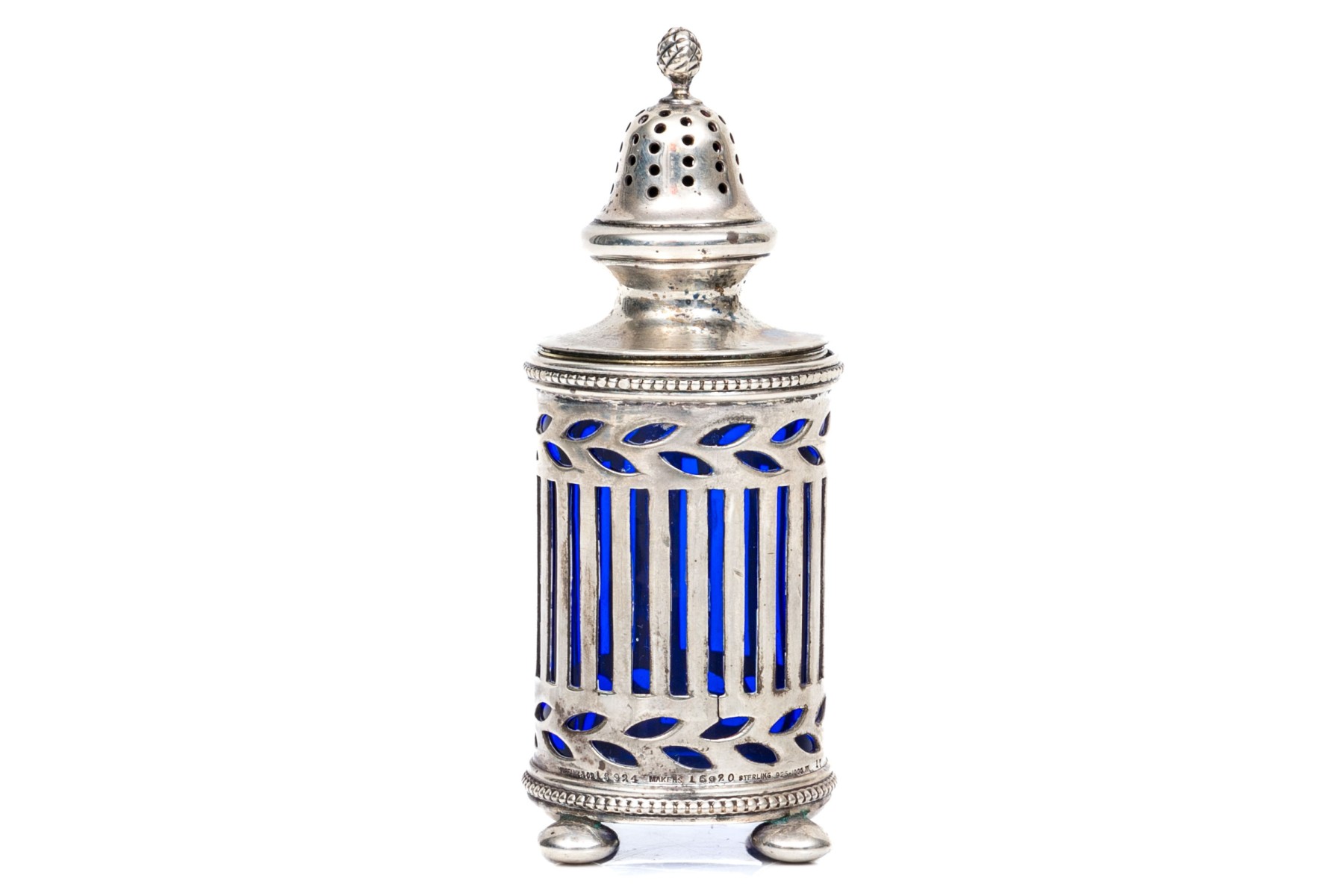 A sterling silver and cobalt blue glass spice shaker by Tiffany & Company.