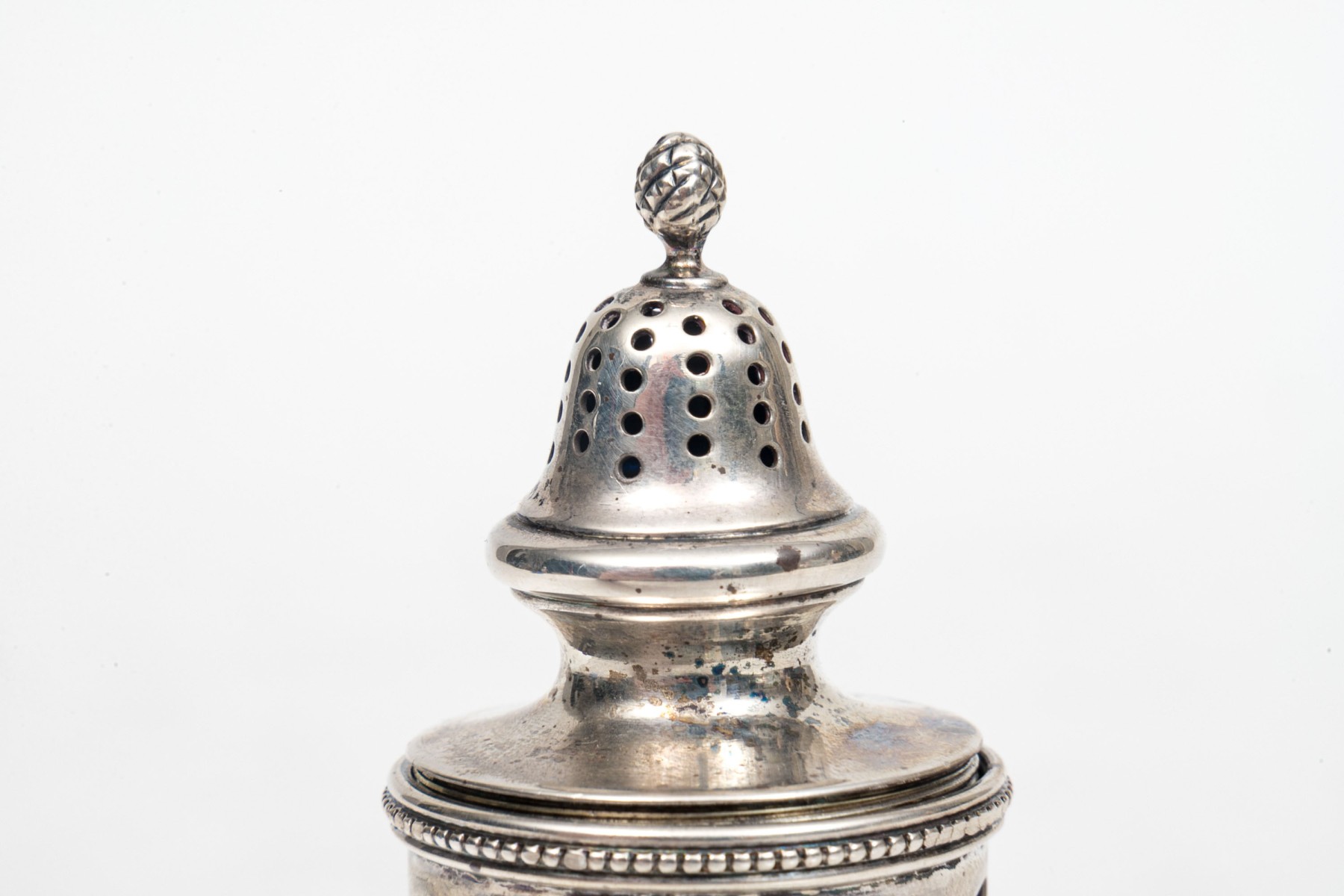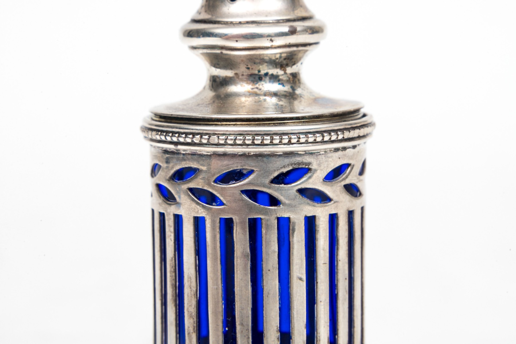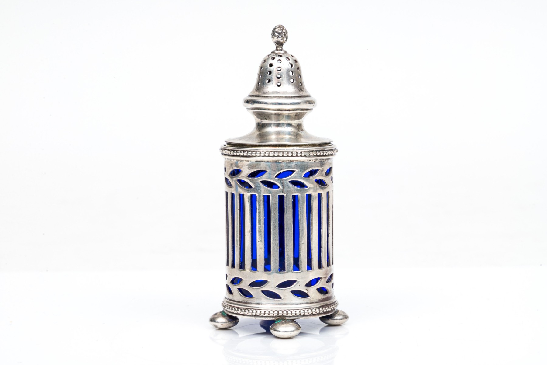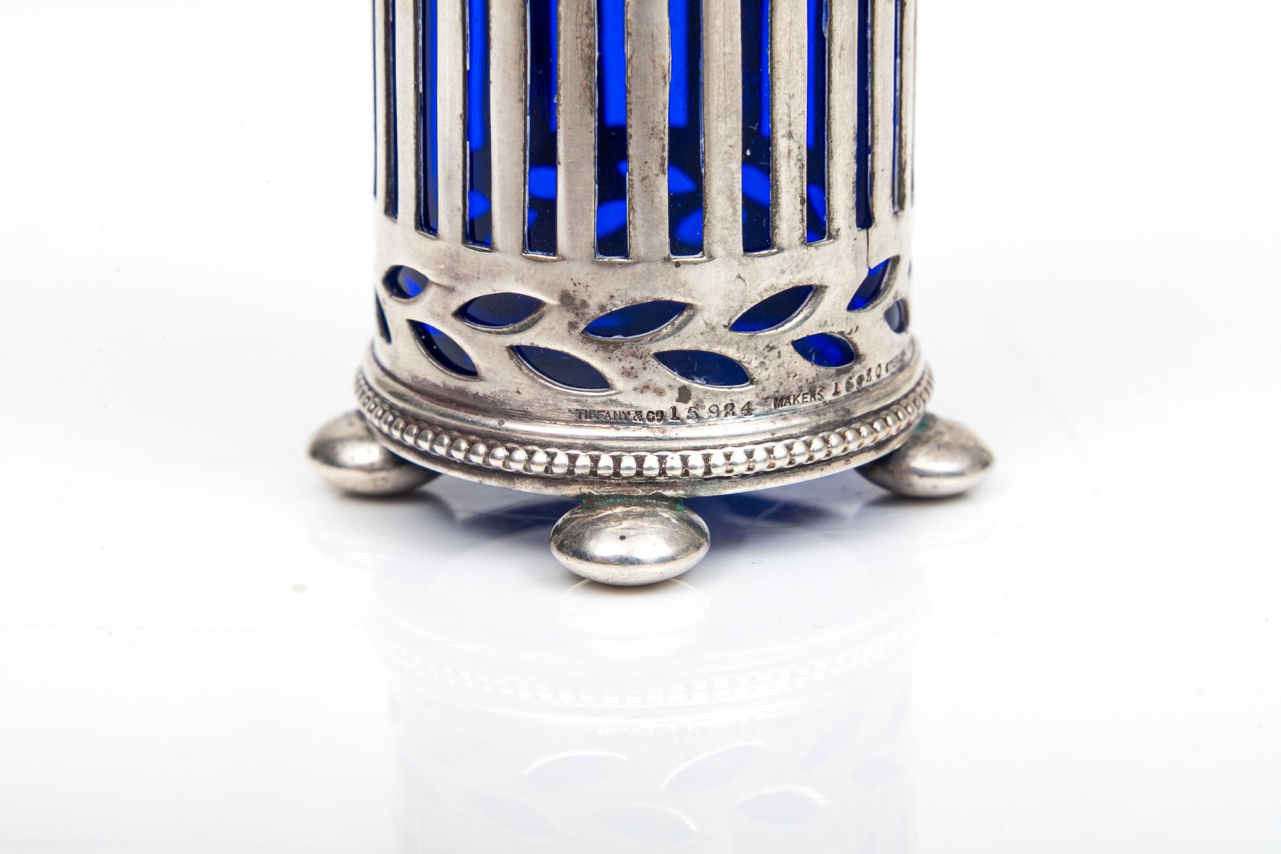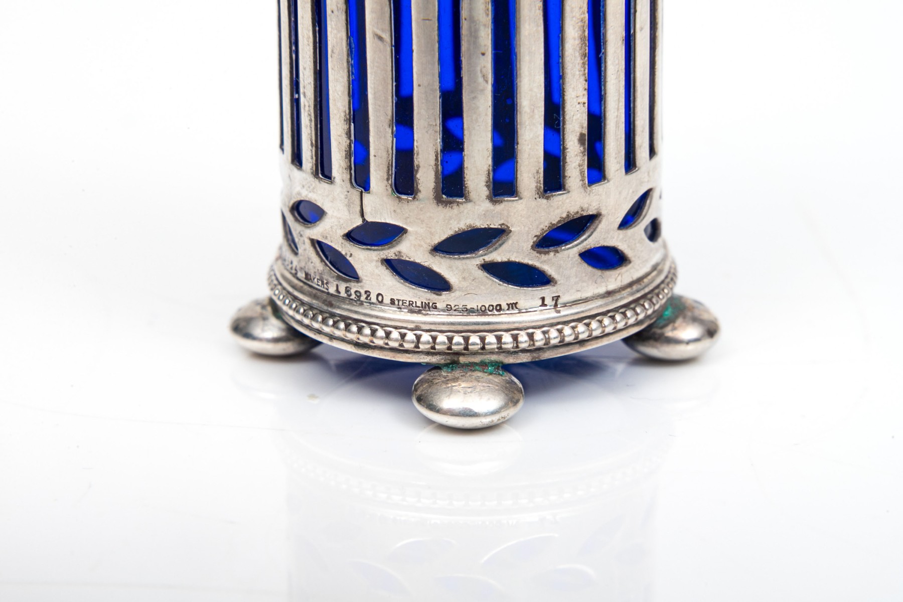 A sterling silver and cobalt blue glass spice shaker by Tiffany & Company.