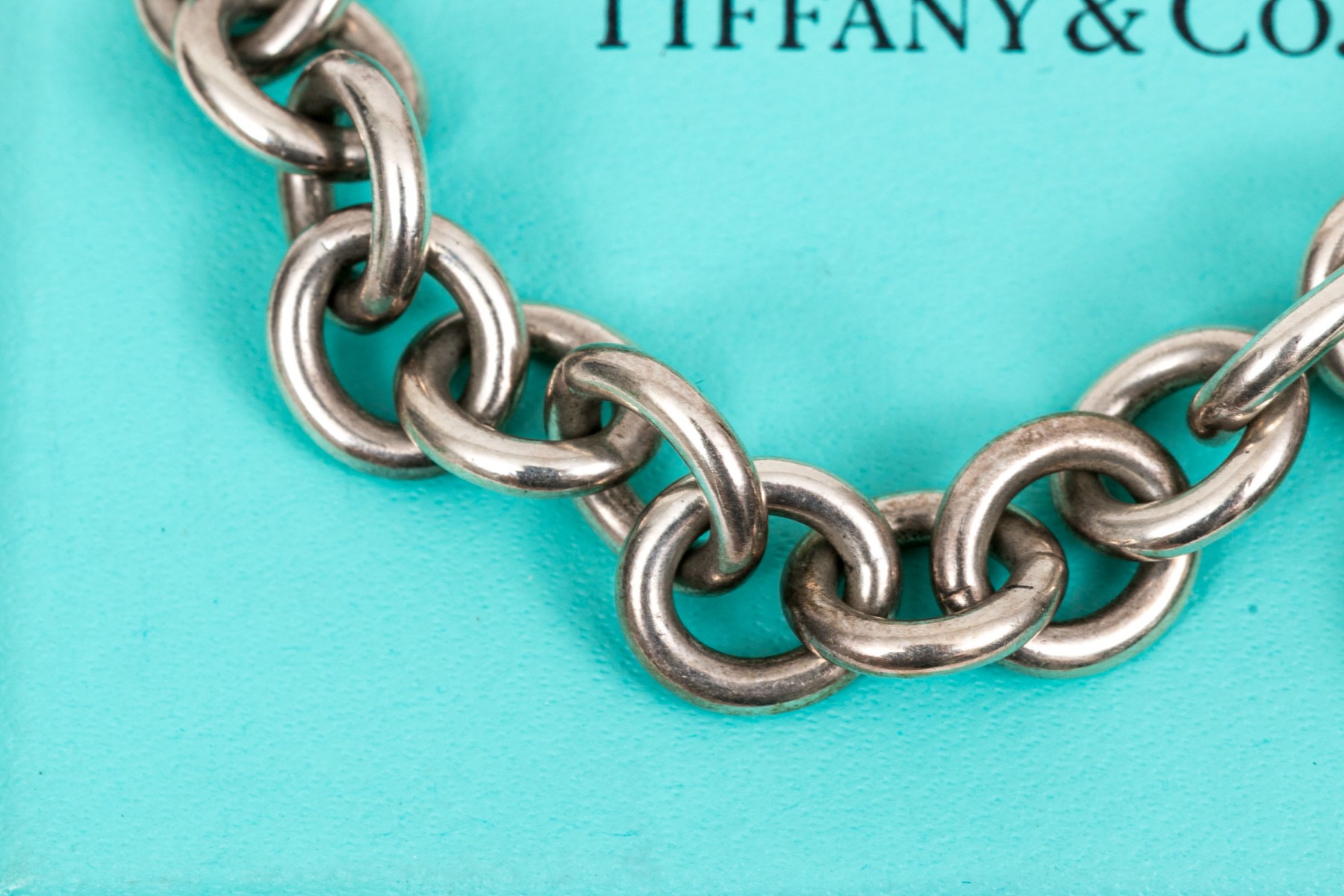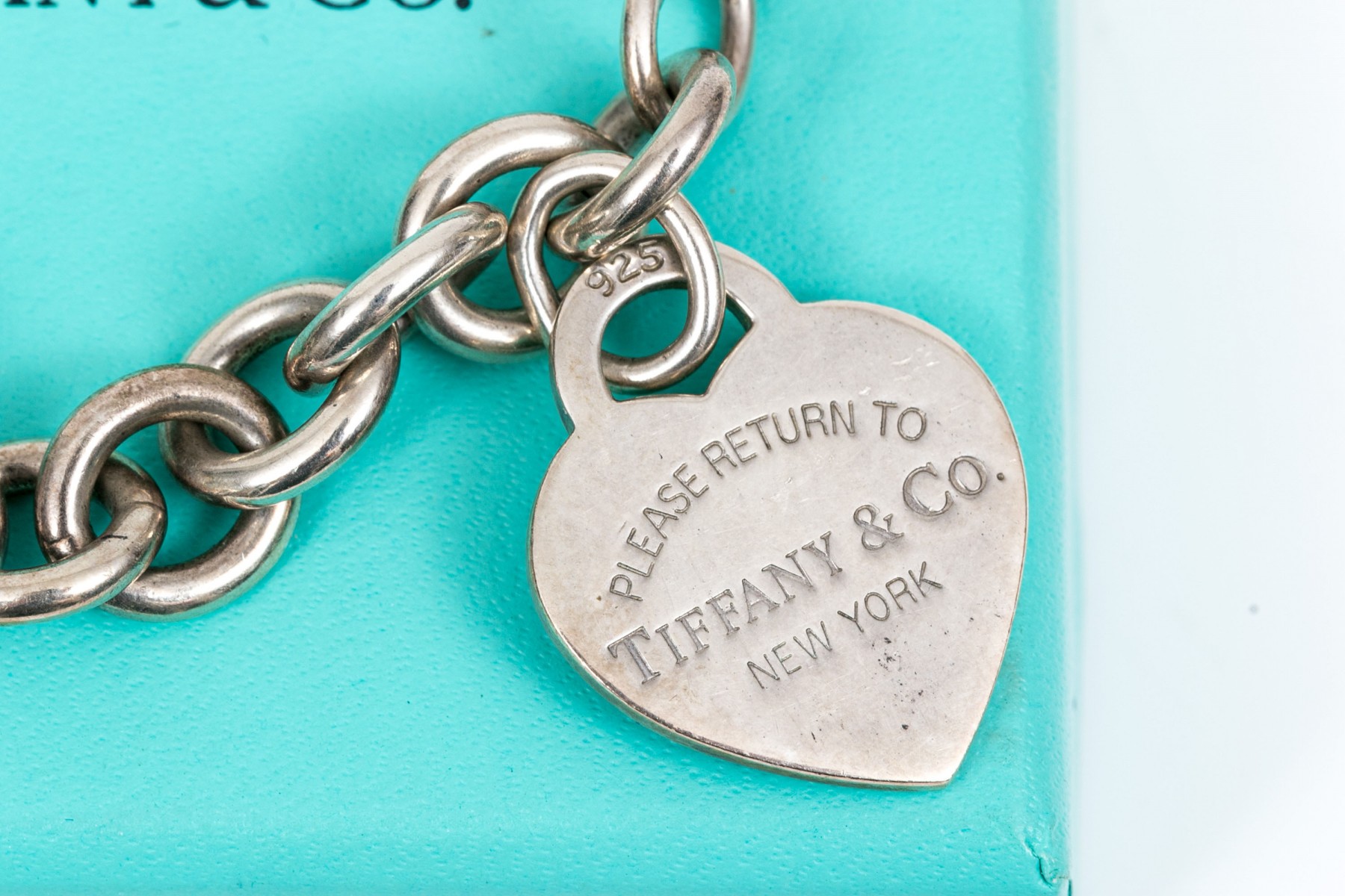 Sterling silver cable link chain bracelet by Tiffany & Company. Suspended from the chain is a heart charm marked 'Please Return to Tiffany & Co. New York'. Lobster claw clasp.