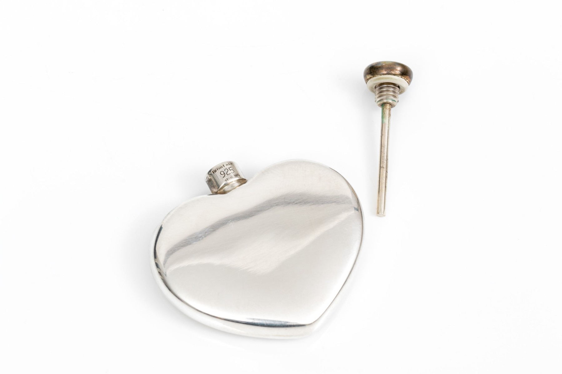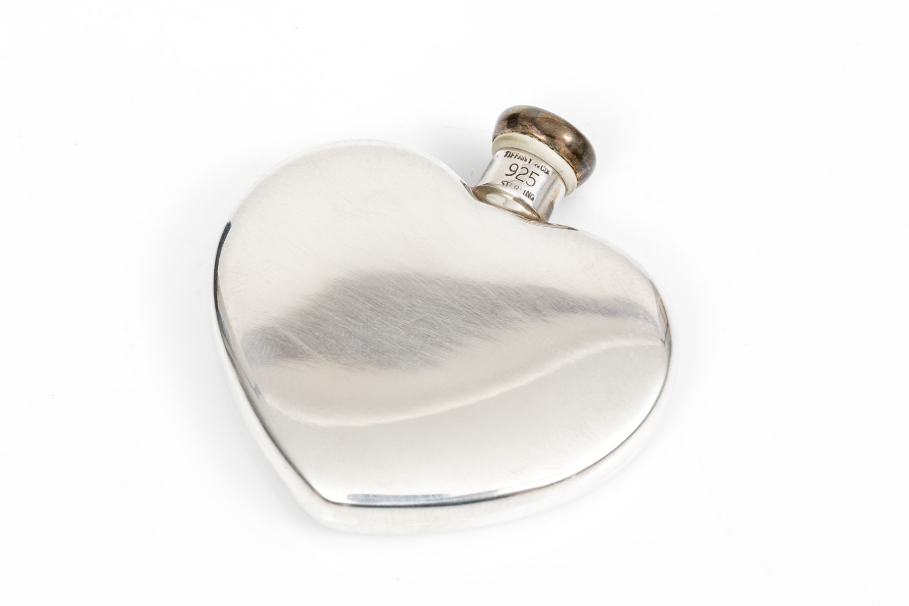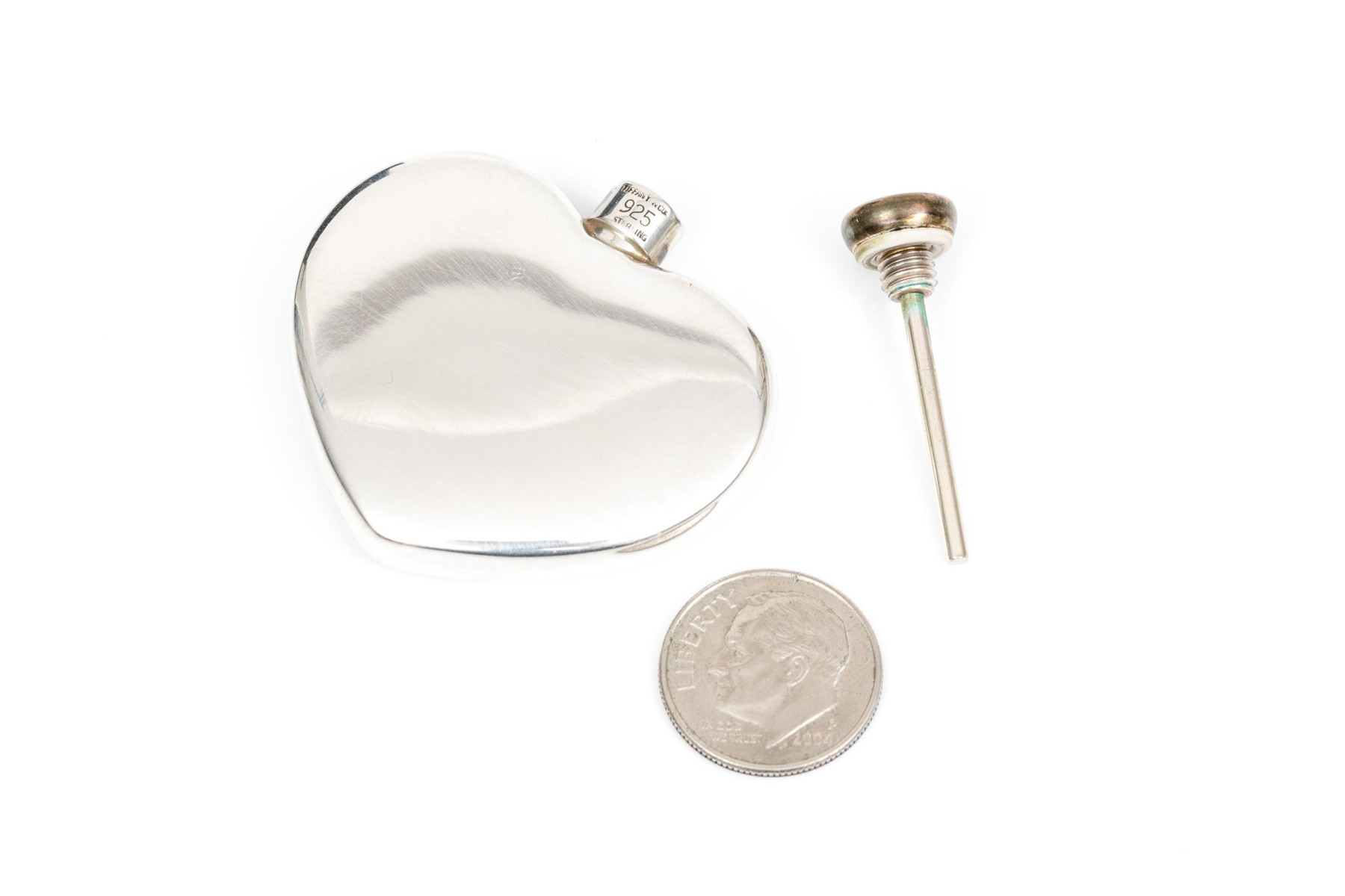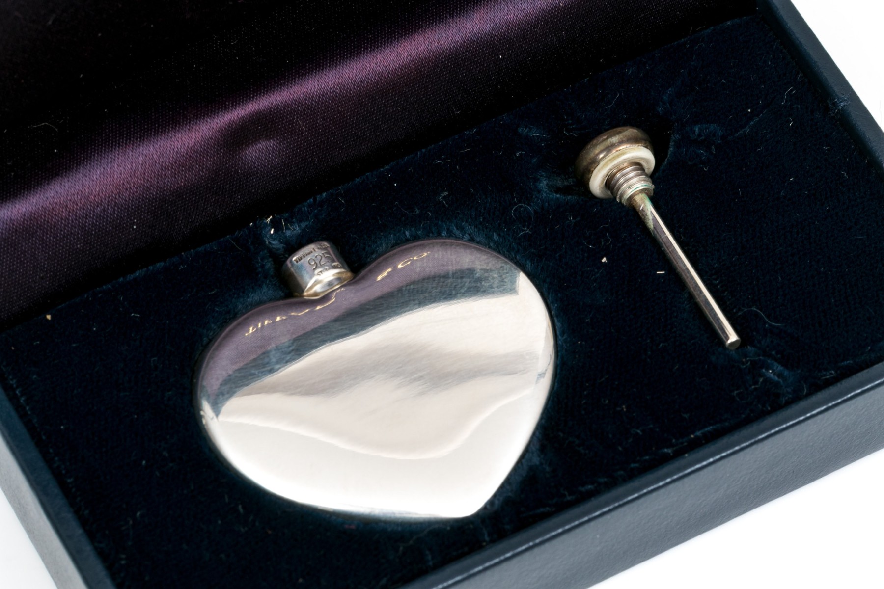 A sterling silver perfume bottle by Tiffany and Company. The small heart shaped bottle has a bright polished finish and a screw top, with box