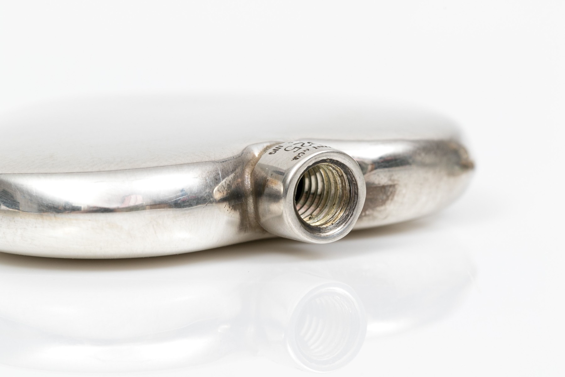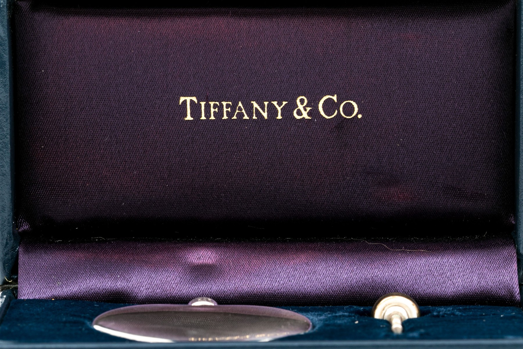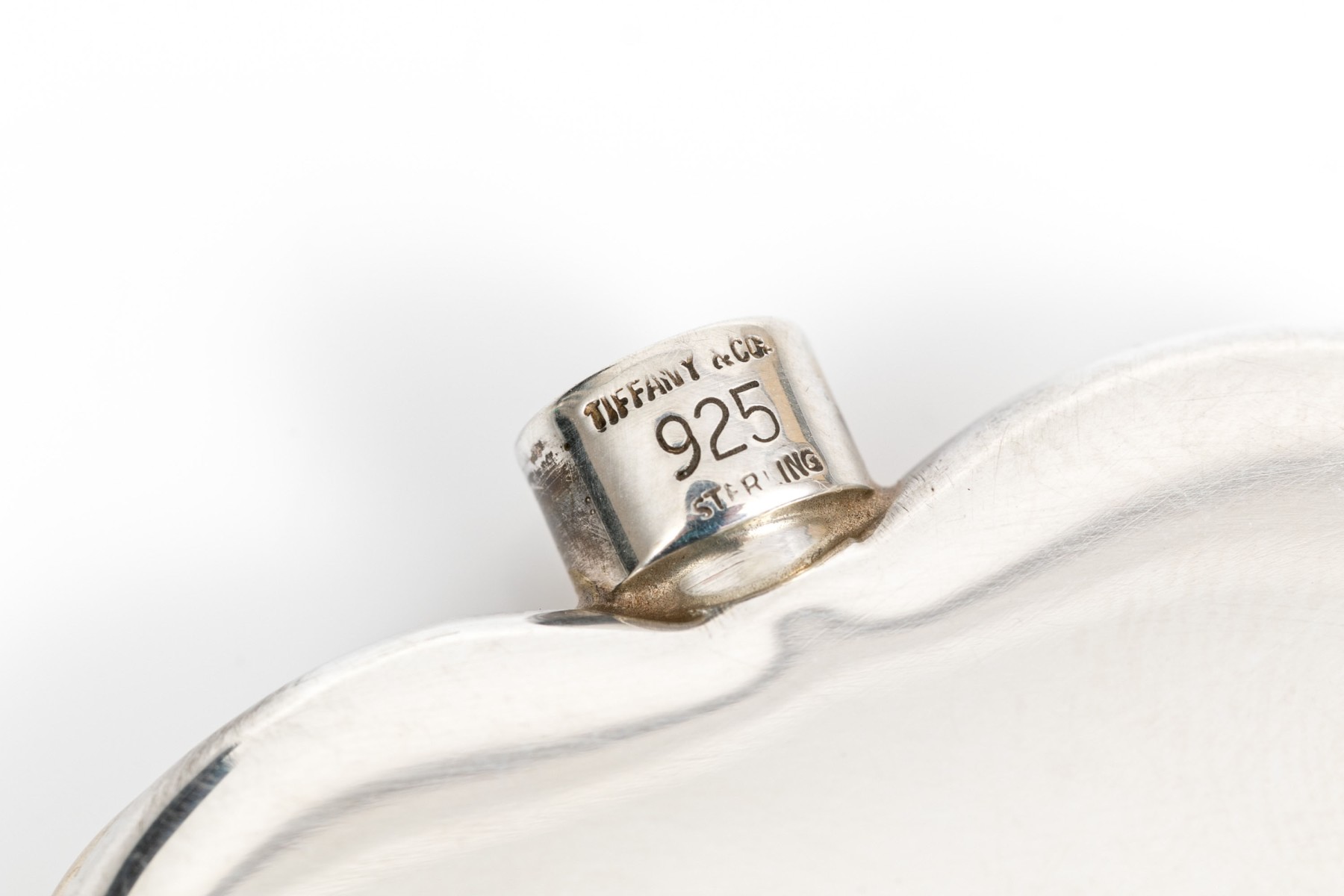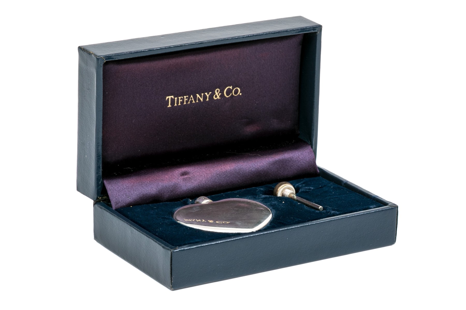 A sterling silver perfume bottle by Tiffany and Company. The small heart shaped bottle has a bright polished finish and a screw top, with box