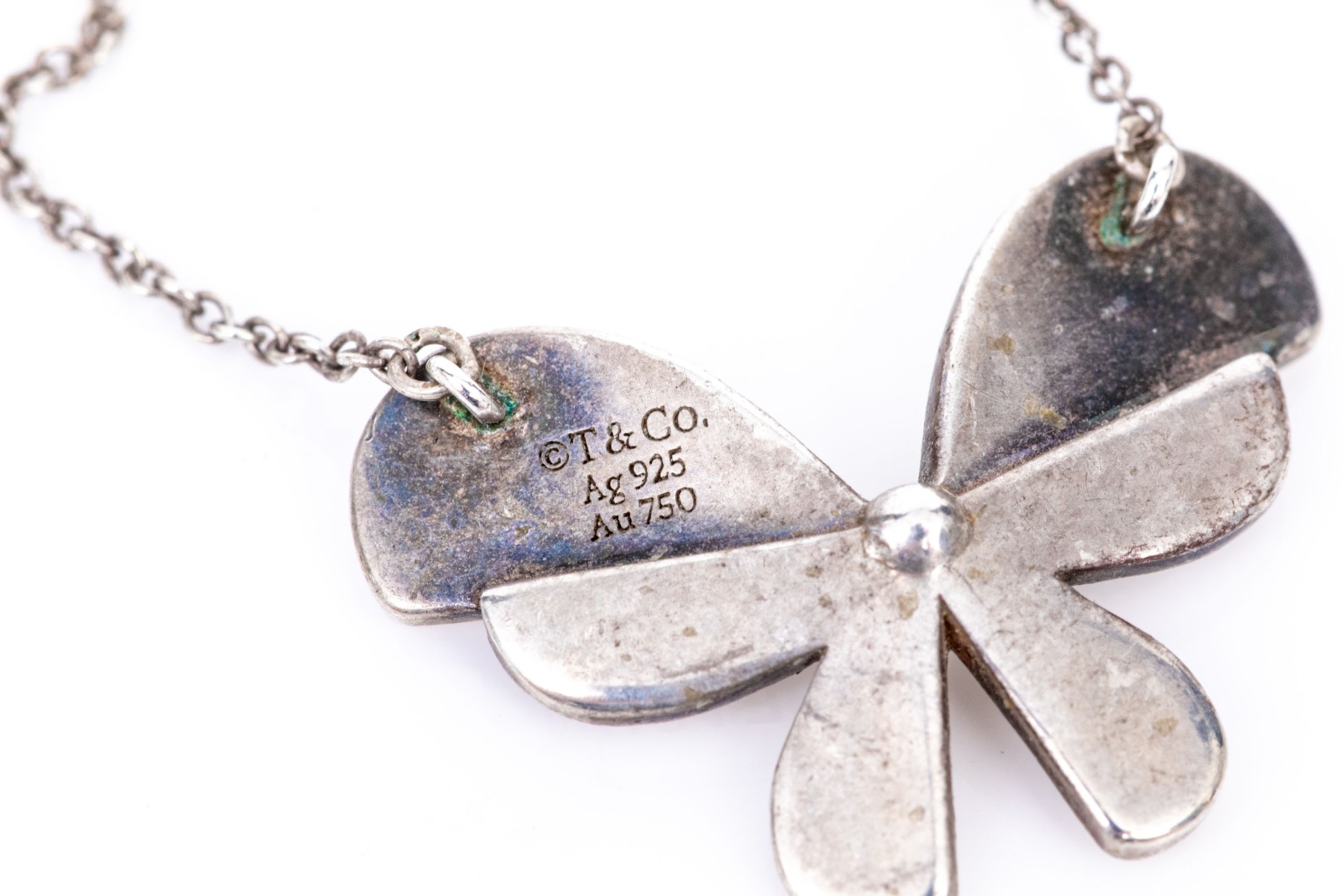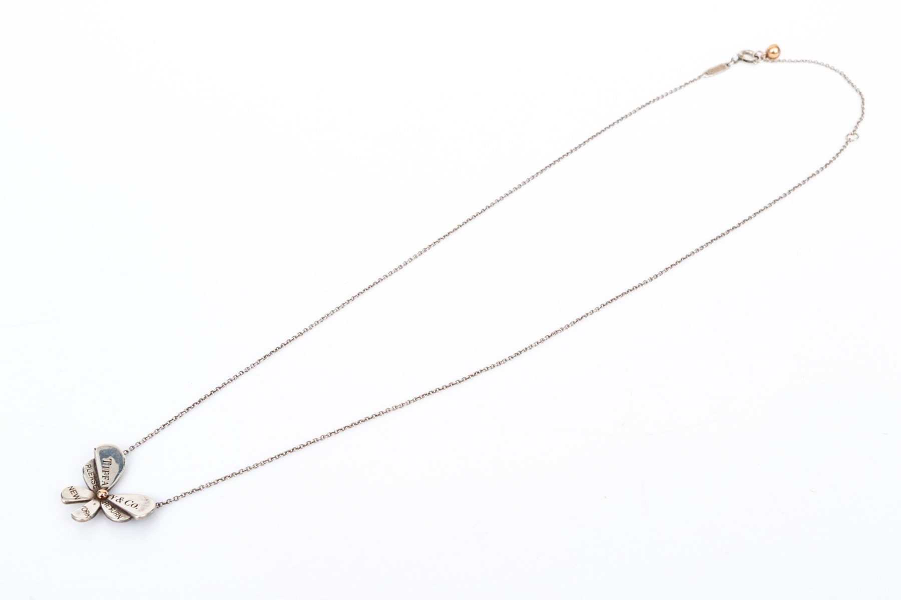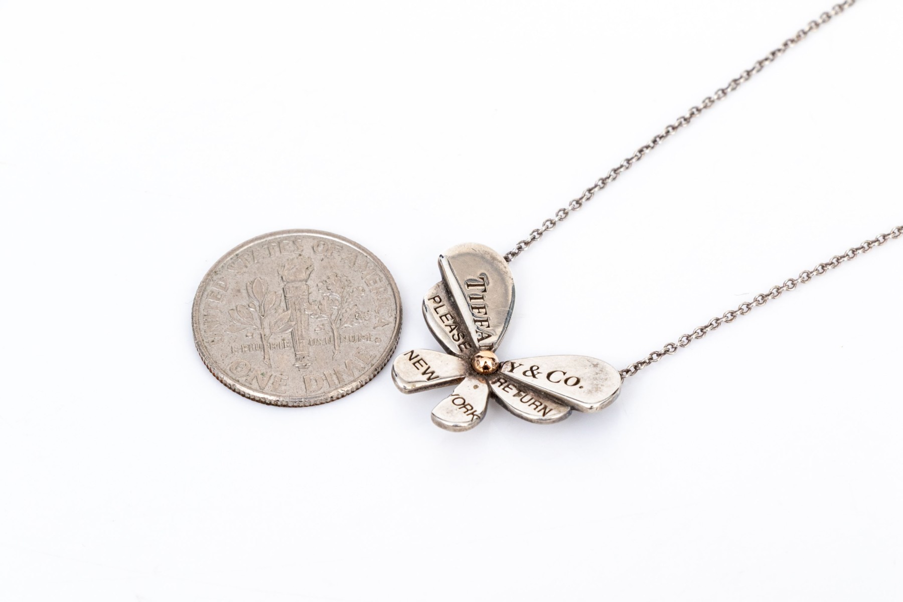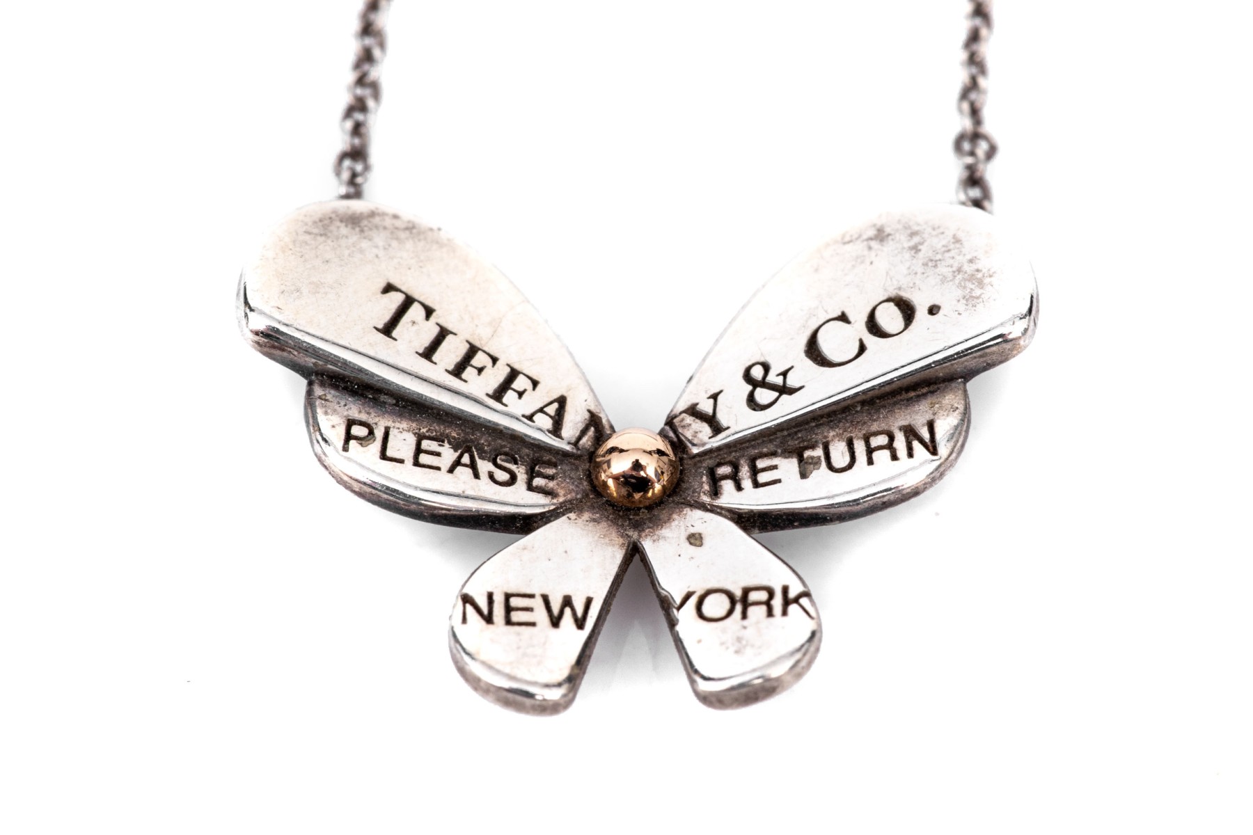 Tiffany & Co. sterling silver and 18k yellow gold "Return to Tiffany" butterfly motif necklace. This fun necklace features a high polished finished butterfly, with an 18k highlighted decoration, and is displayed on a curb link chain and finished with a spring ring style clasp and an 18k yellow gold ball end