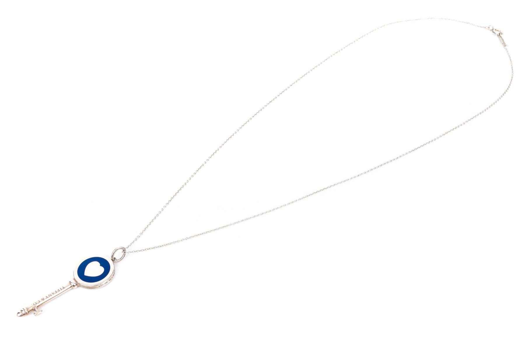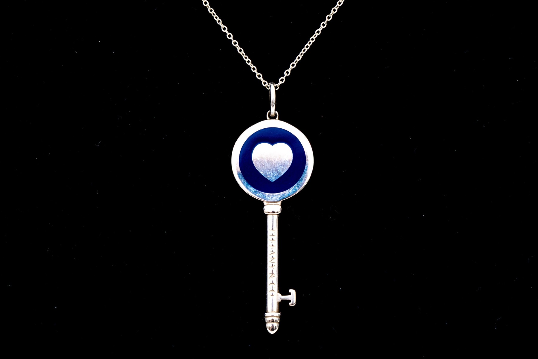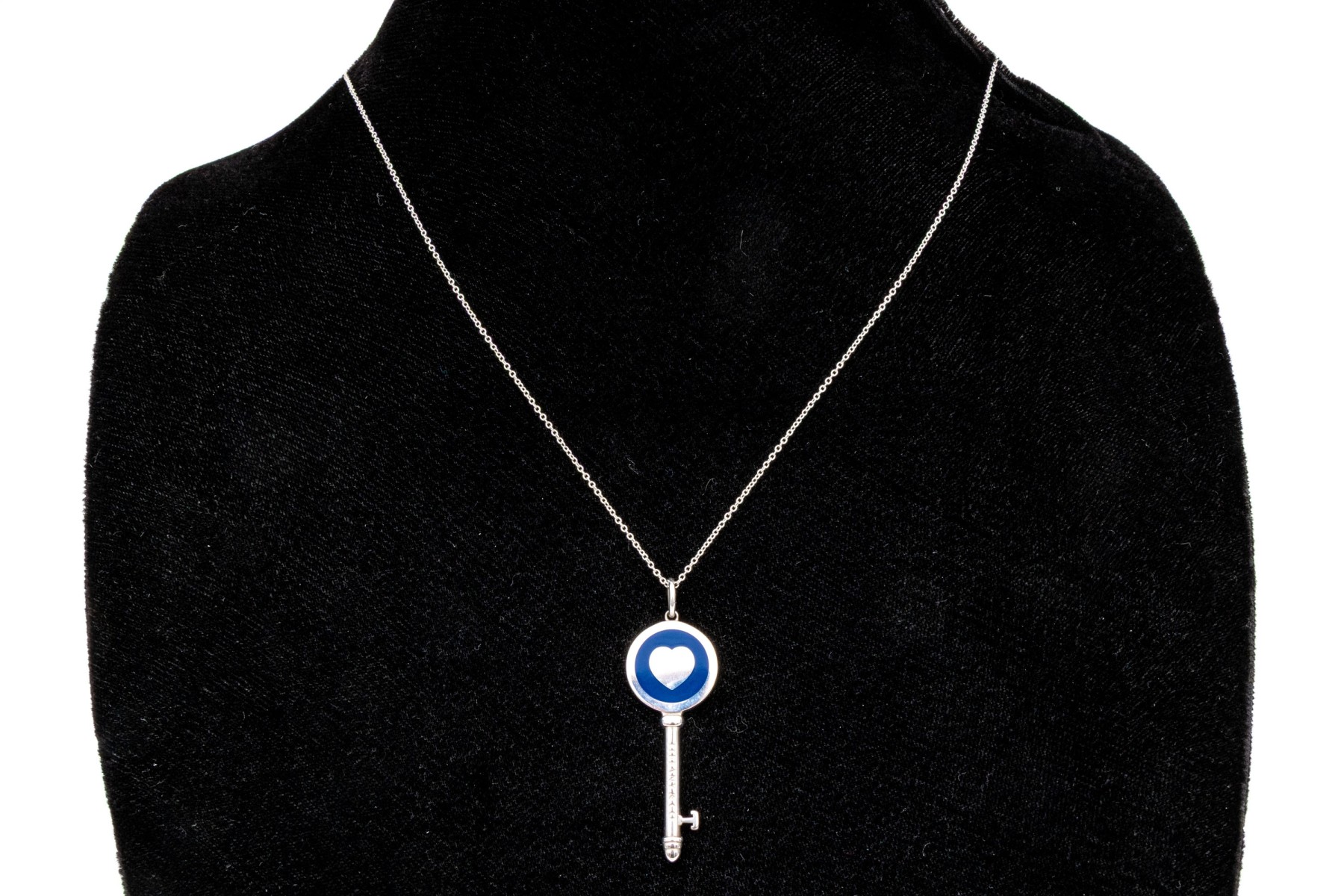 Tiffany & Co. sterling silver blue enamel decorated heart Tiffany Key, with chain. This pretty key pendant is displayed on an cable chain and finished with a spring ring style clasp