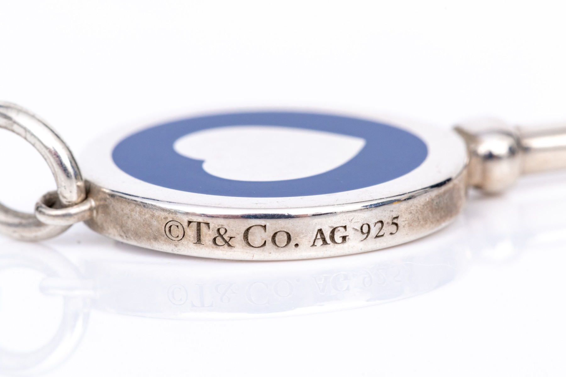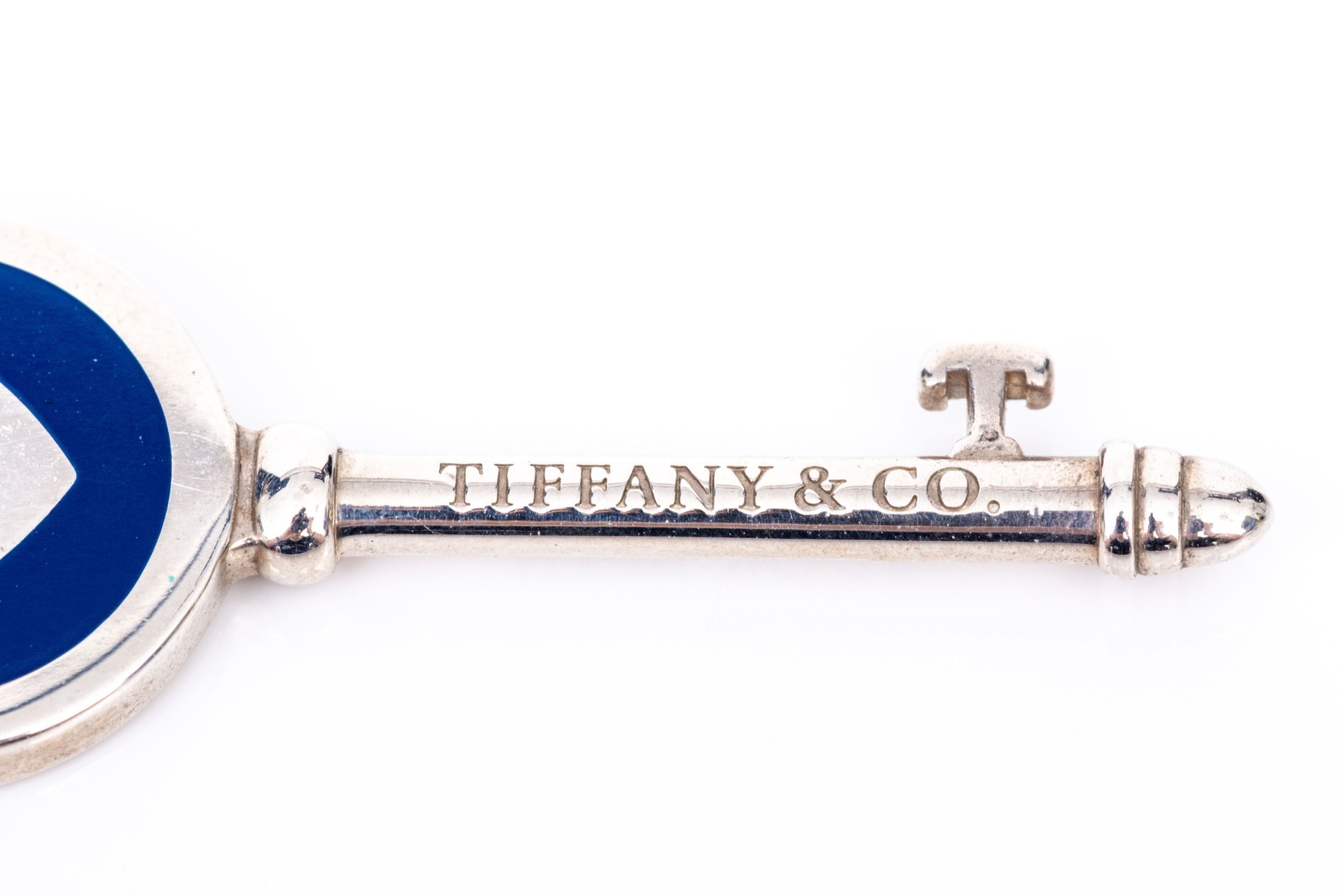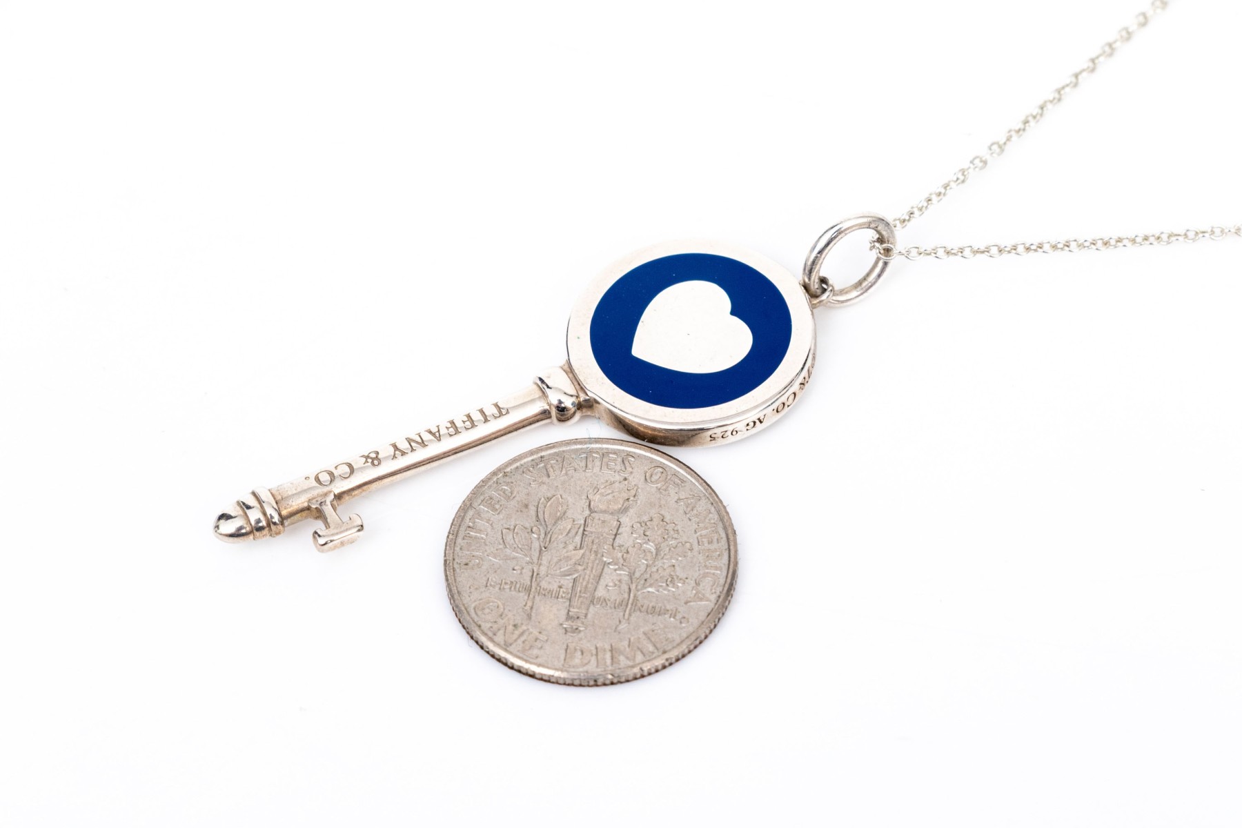 Tiffany & Co. sterling silver blue enamel decorated heart Tiffany Key, with chain. This pretty key pendant is displayed on an cable chain and finished with a spring ring style clasp
