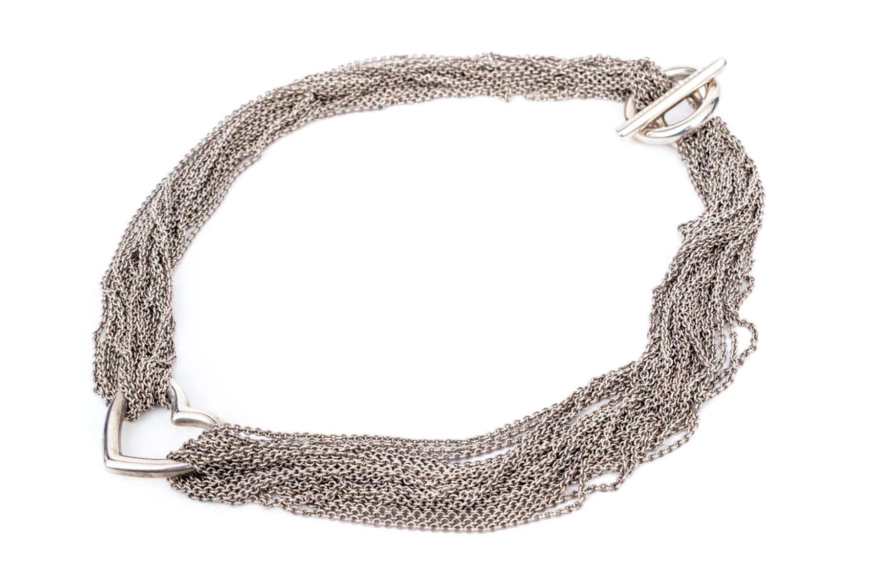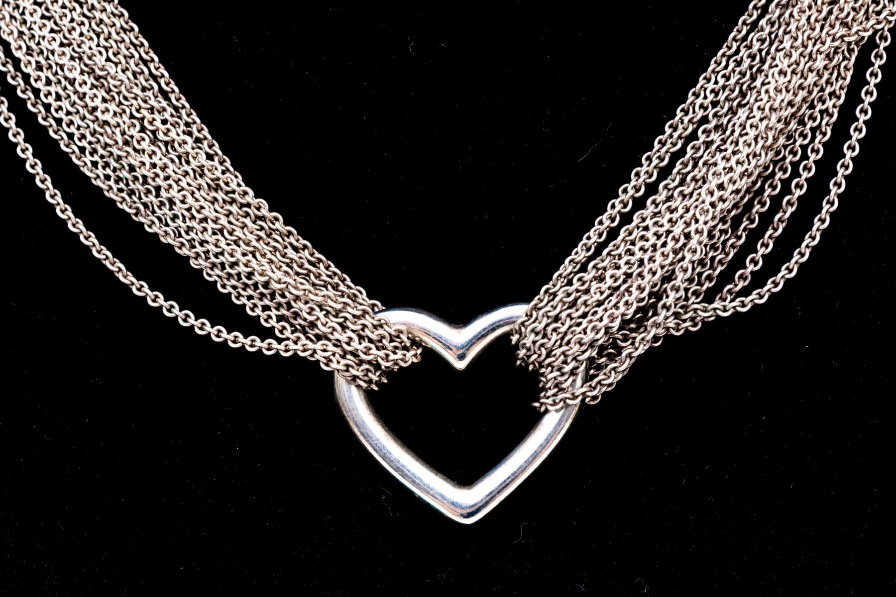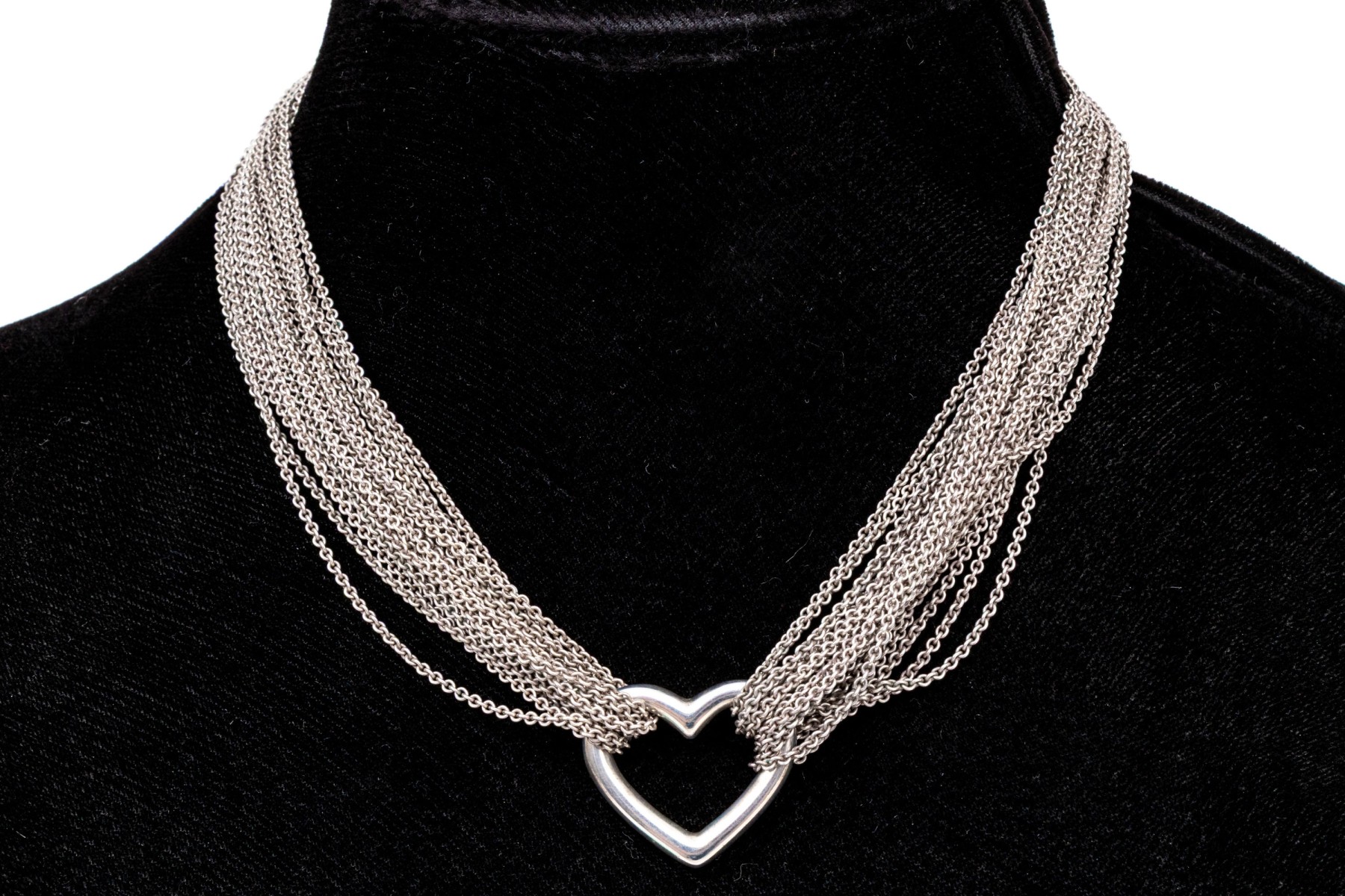 Tiffany & Co. sterling silver chunky multi strand curb link open heart choker. This striking necklace features a center open heart, and is displayed on ten strands of curb link chain and finished with a toggle style clasp