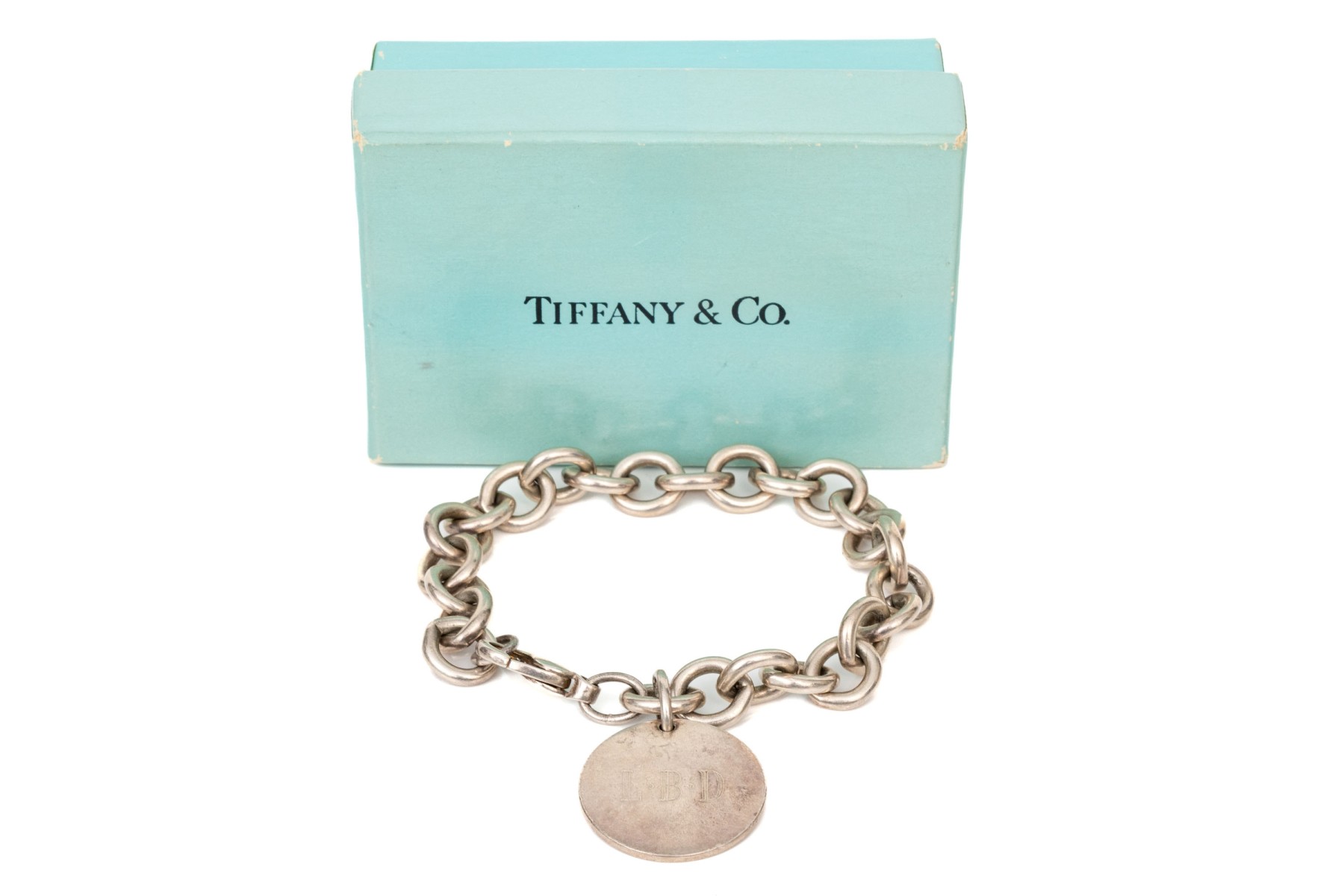 Tiffany & Co. sterling silver classic chunky link bracelet with disc charm, finished with a lobster claw style clasp, with outer box