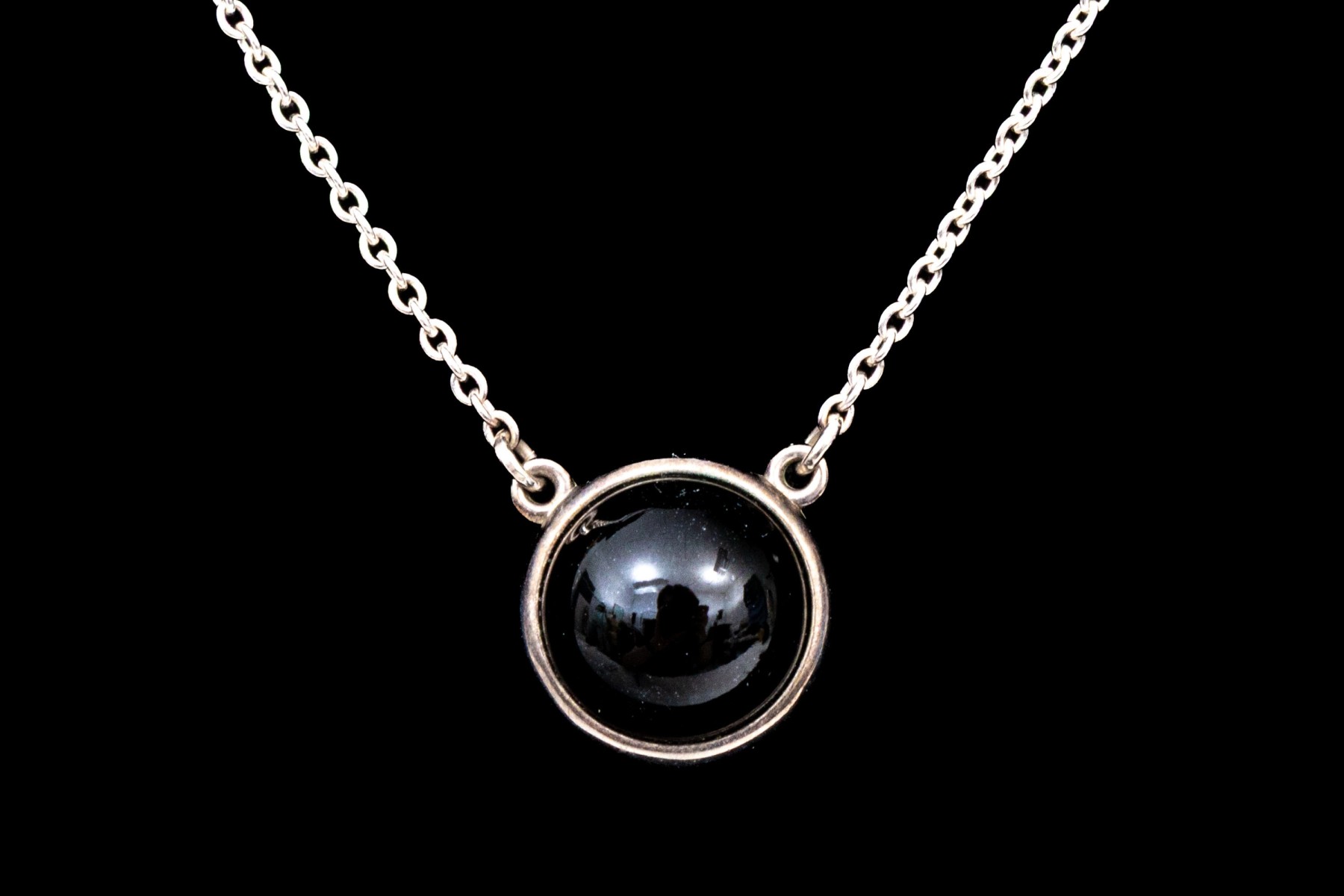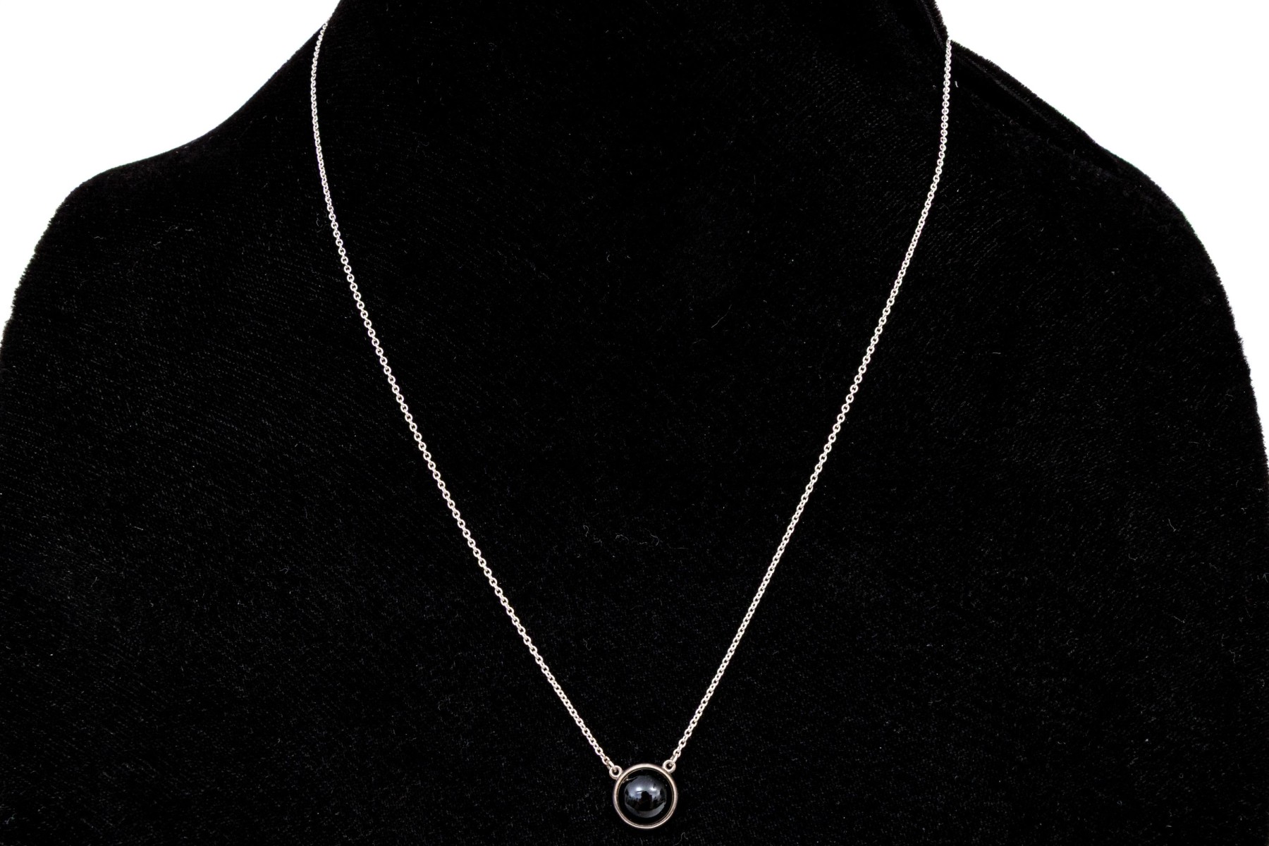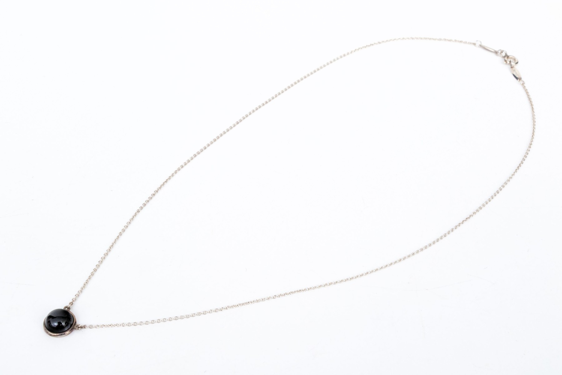 Tiffany & Co. sterling silver Elsa Peretti color by the yard black nephrite necklace. This handsome pendant featured a round black nephrite cabachon center, bezel set, and is displayed on a cable link chain and finished with a spring ring style clasp