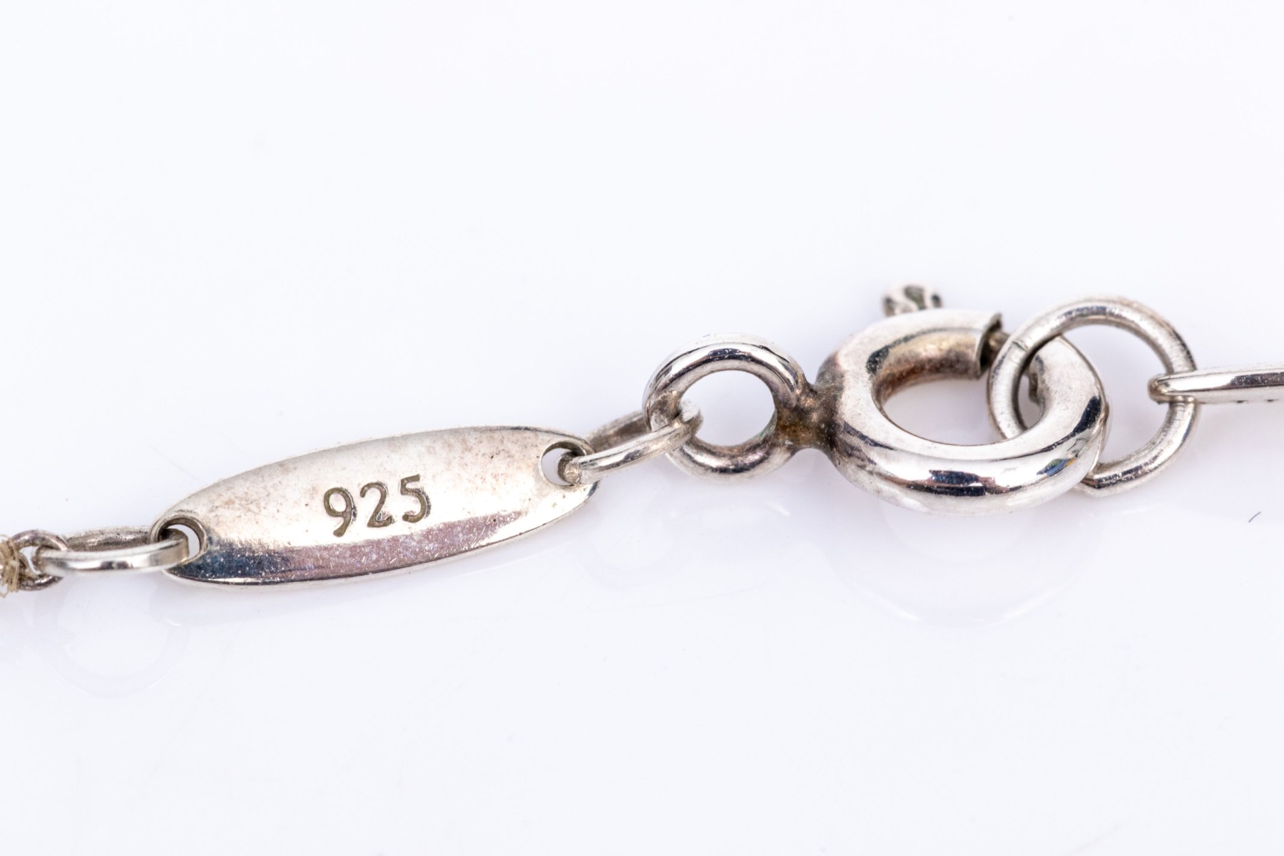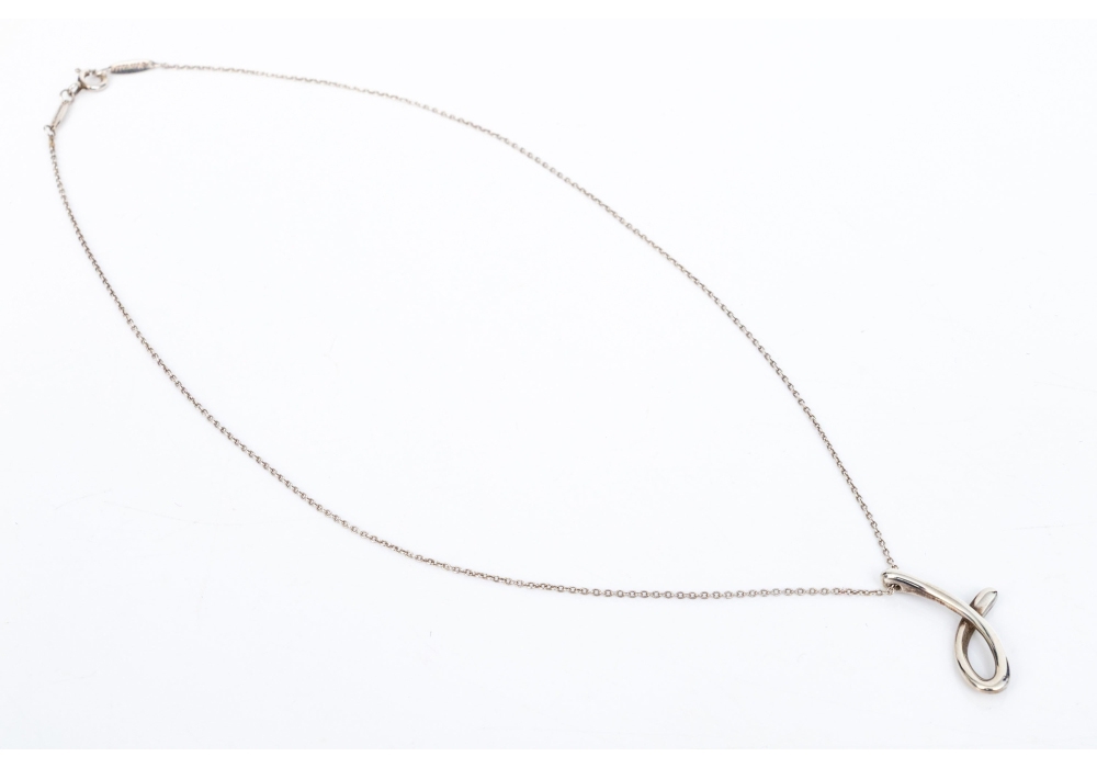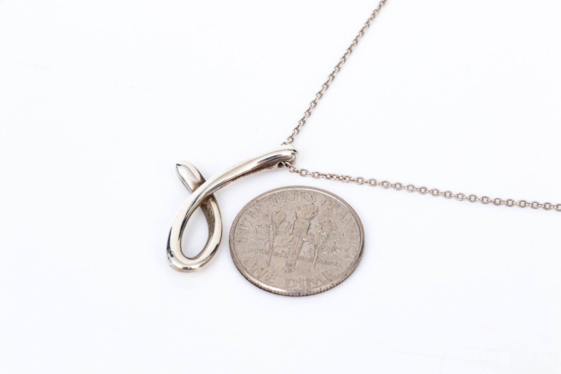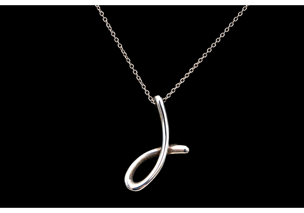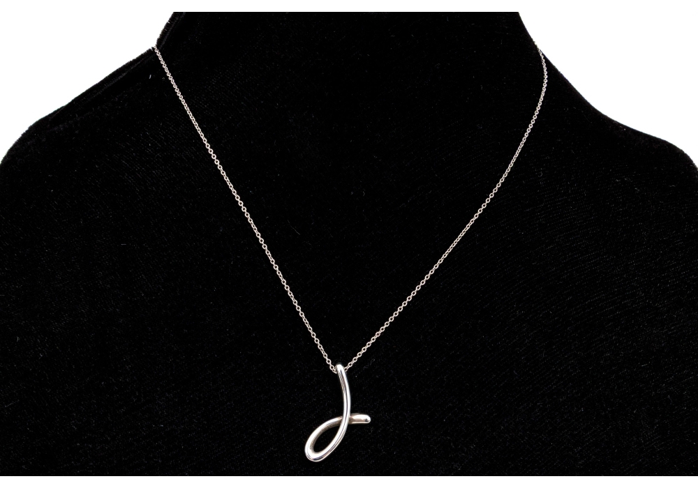 Tiffany & Co. sterling silver Elsa Peretti large script "J" pendant, with chain. This lyrical script letter "J" pendant has a high polished finish, and is displayed on a cable link chain and finished with a spring ring style clasp