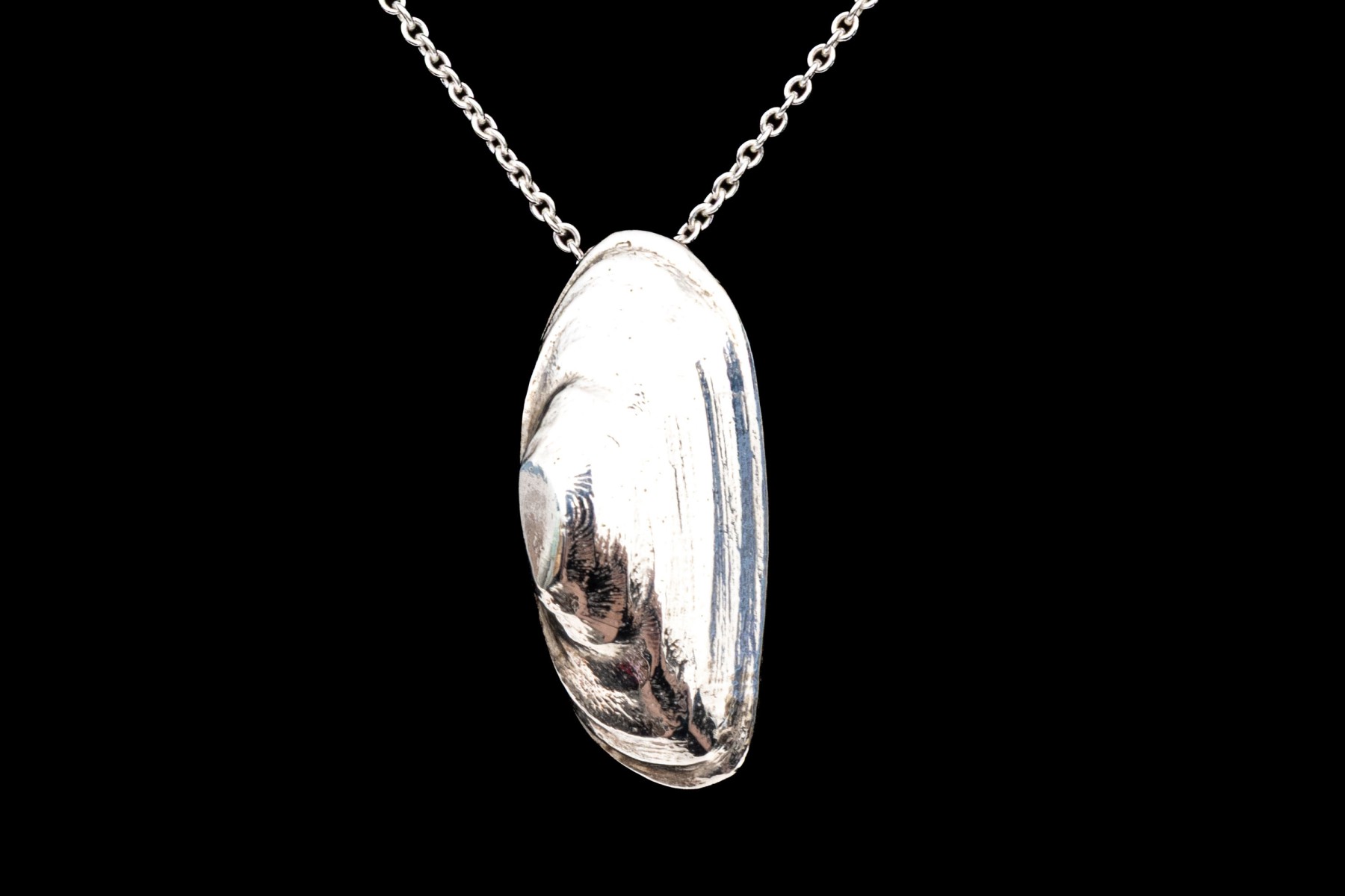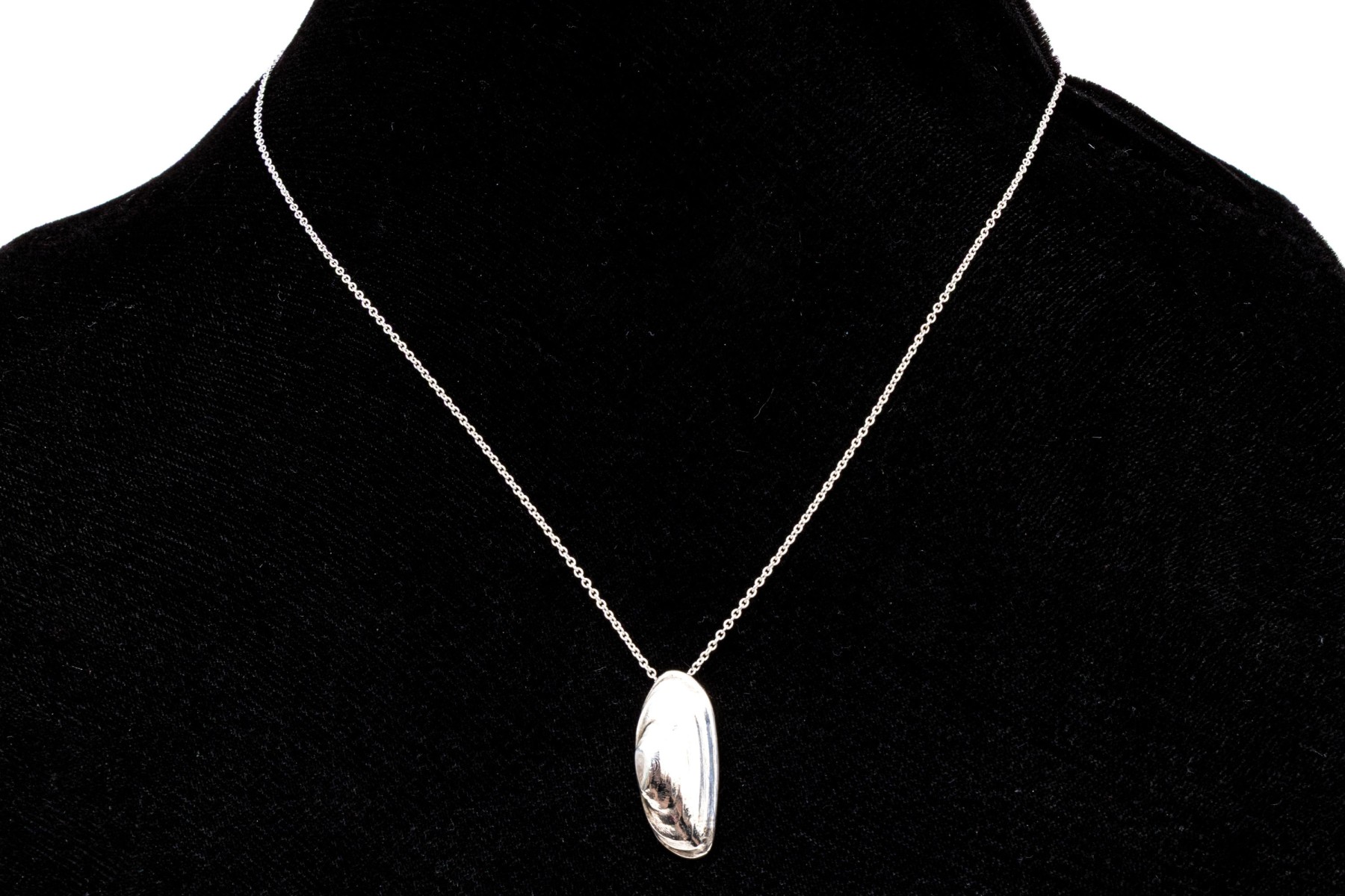 Tiffany & Co. sterling silver Elsa Peretti shell pendant, with chain. This beachy shell pendant has a patterned finish, and is displayed on a cable link chain and finished with a spring ring style clasp
