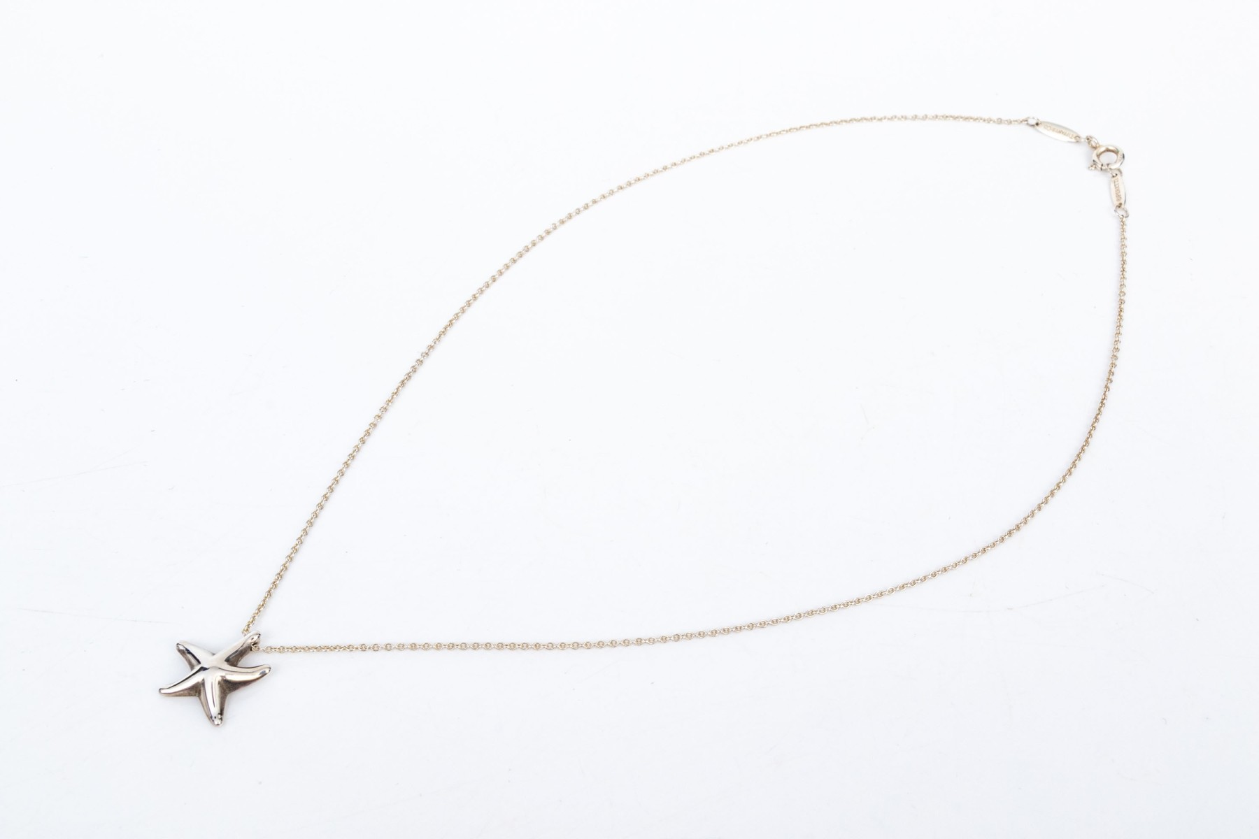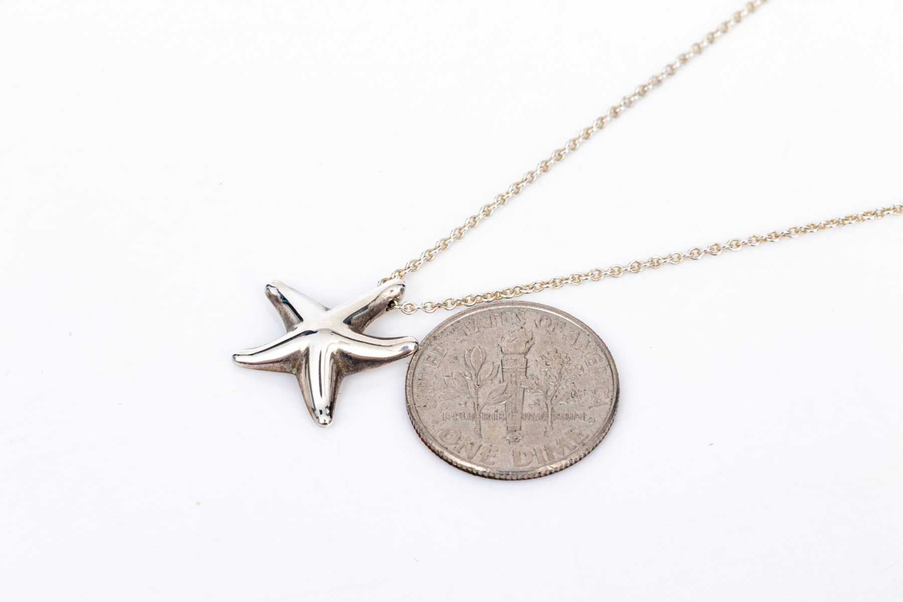 Tiffany & Co. sterling silver Elsa Peretti starfish pendant, with chain. This breezy starfish pendant has a high polished finish, and is displayed on a cable link chain and finished with a spring ring style clasp
