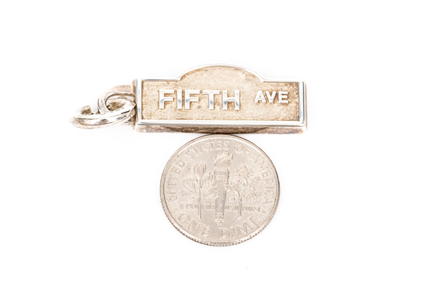 Tiffany & Co. sterling silver iconic Fifth Avenue NYC street sign charm, sandblast and polished finish, and finished with a jumbo spring ring style bale