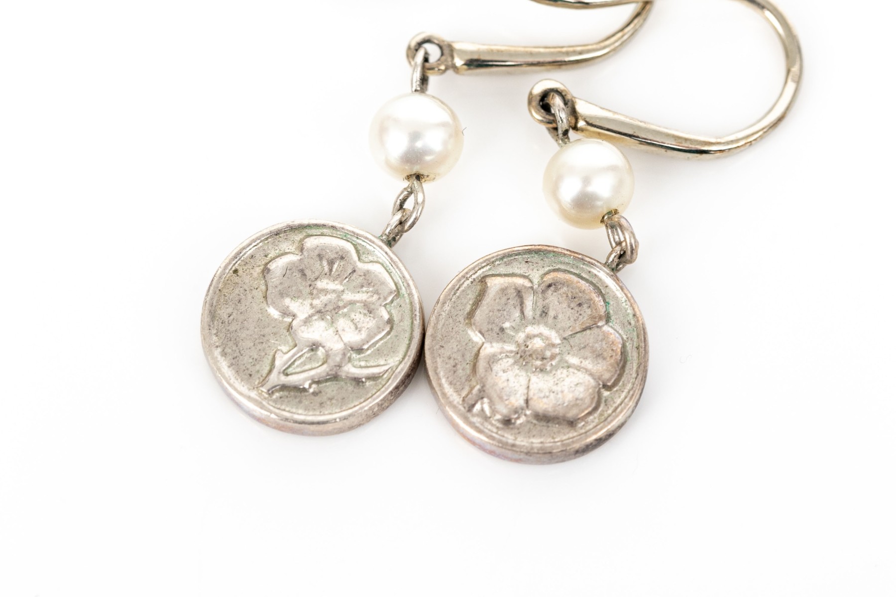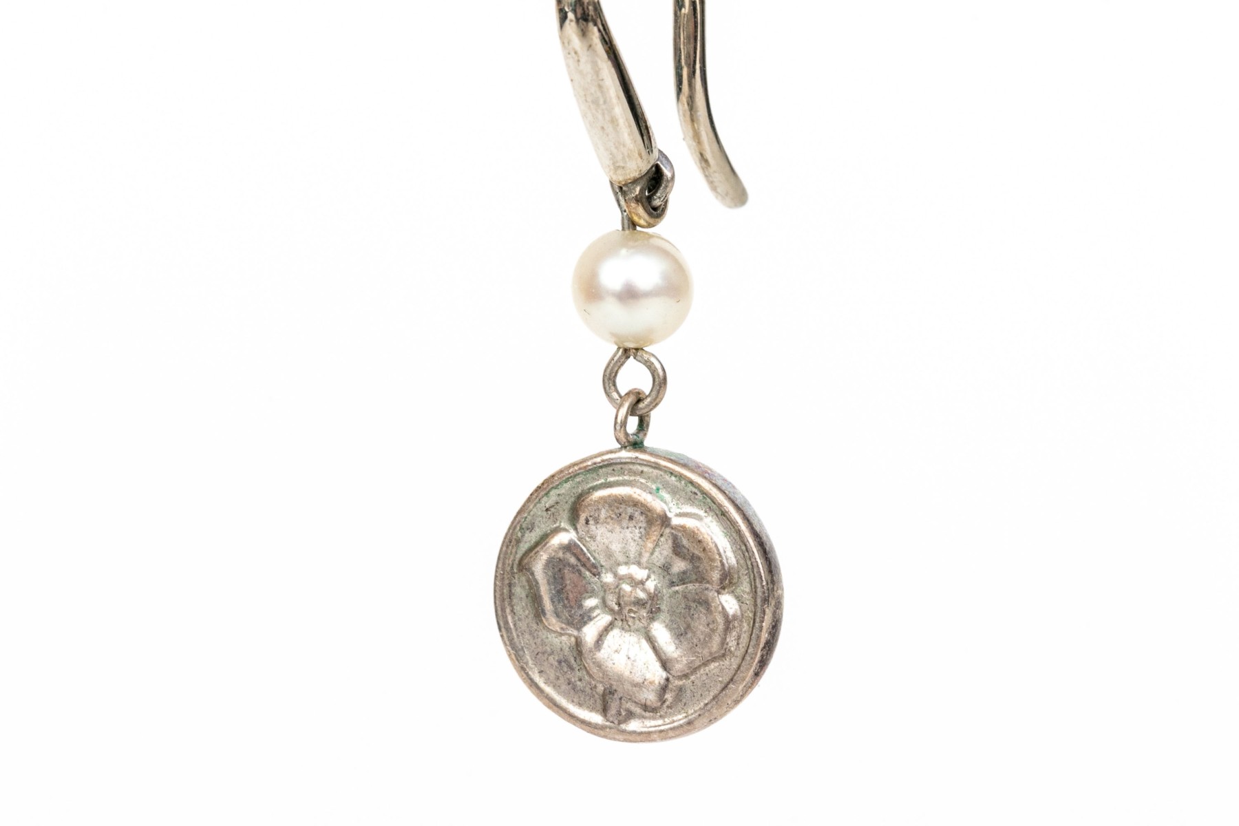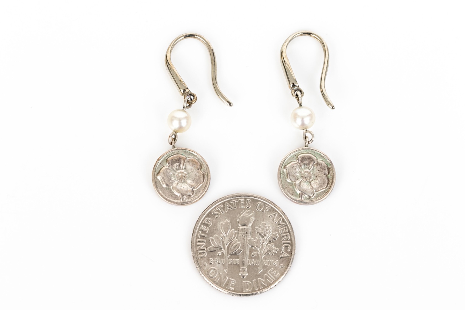 Tiffany & Co. sterling silver lovely "Nature Rose" patterned medallion drop pendant earrings, finished with shepherd's style hooks