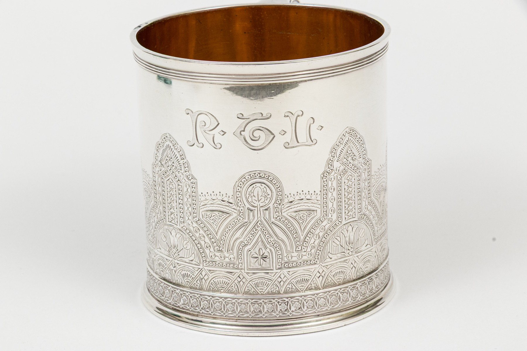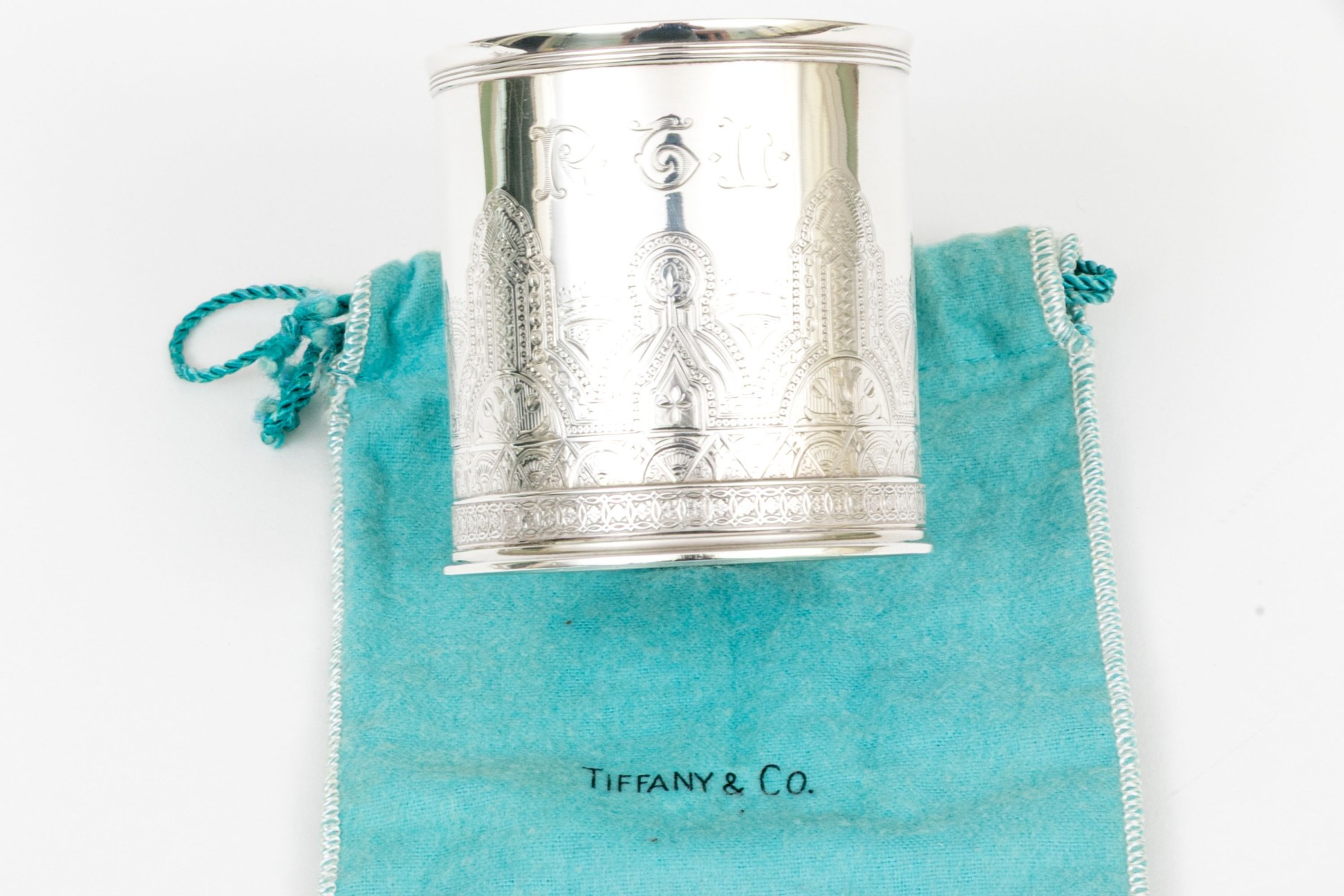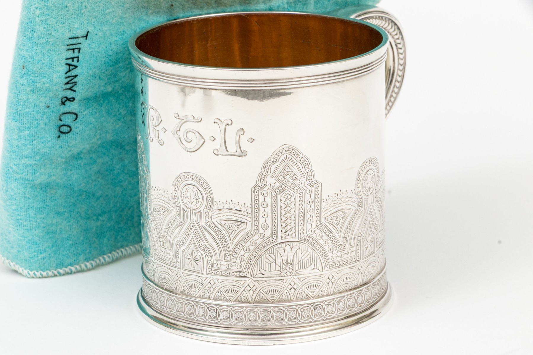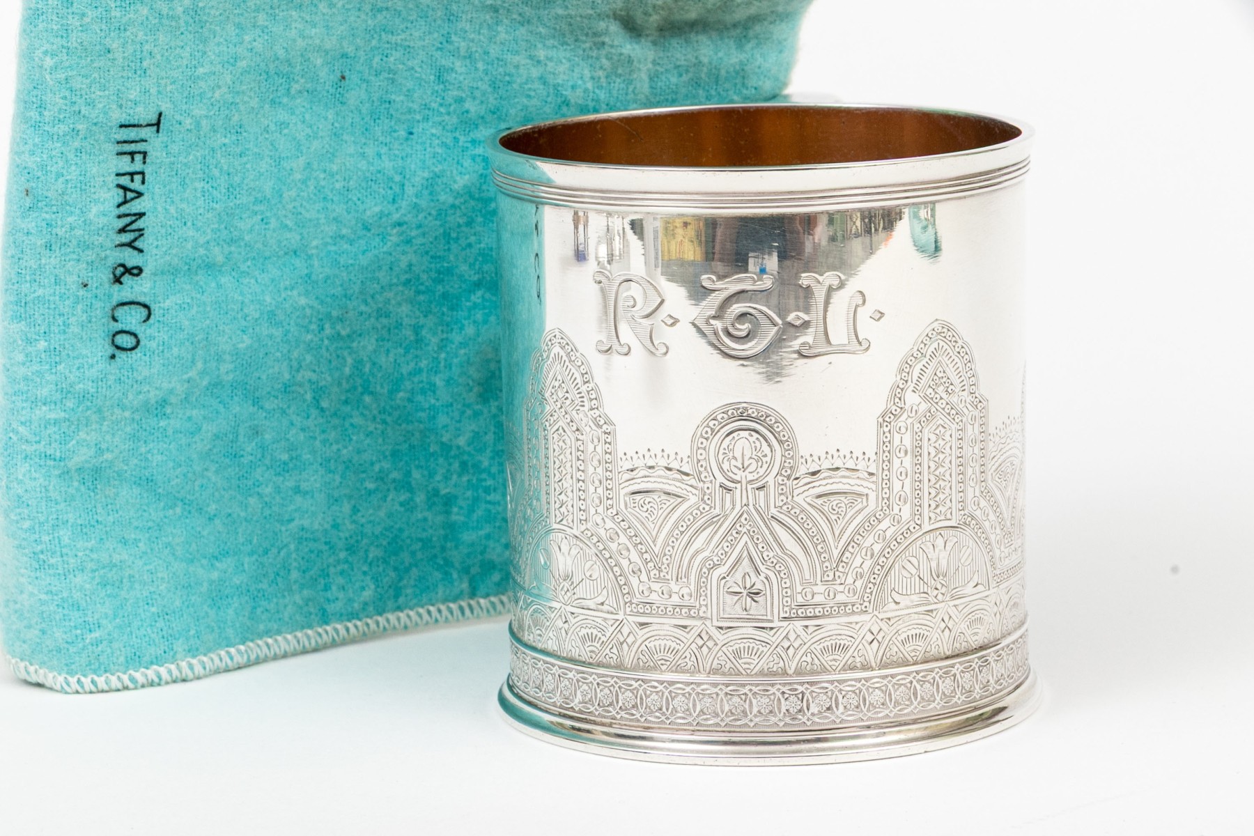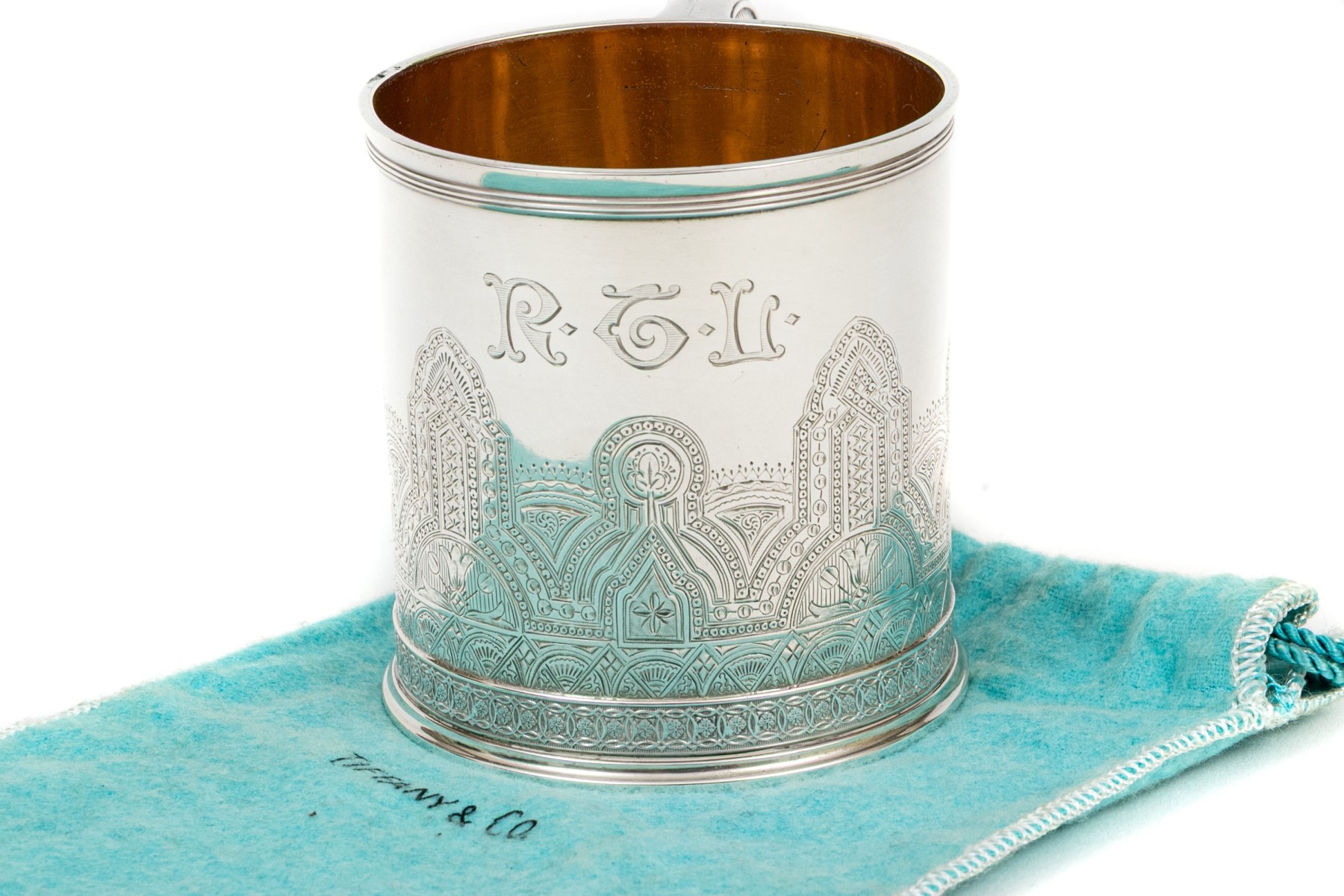 fine Tiffany & Co. sterling silver mug with a sleek, cylindrical form with banded borders around the rim and base. The mug features a gorgeous and ornate engraved Art Deco design of shaped arches and floral motifs with striking geometric borders adding great texture and intrigue. The handle is comfortably thick and detailed with scrolled ends and graduating braided patterns along the sides. Monogrammed RGU center front and marked underfoot.
