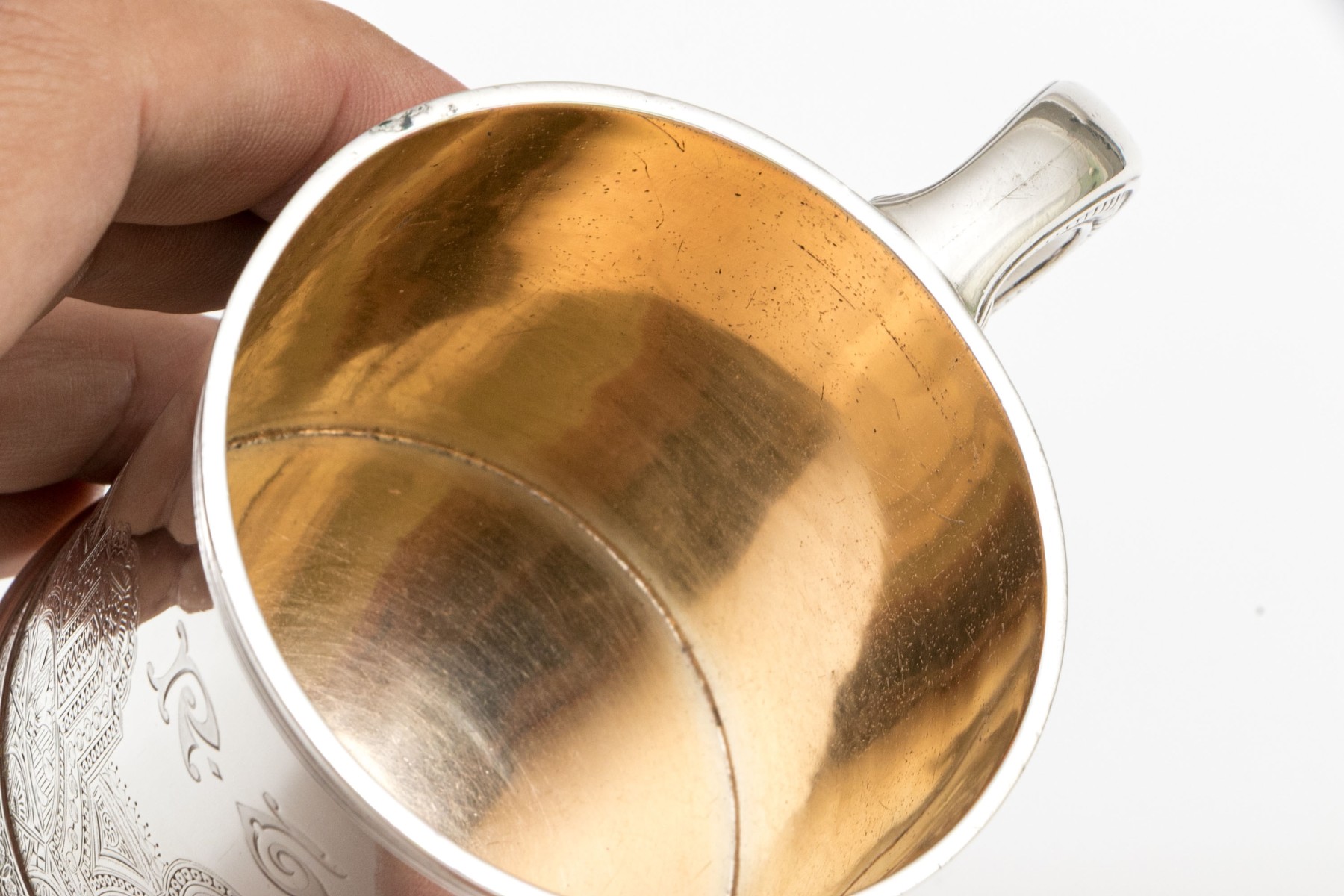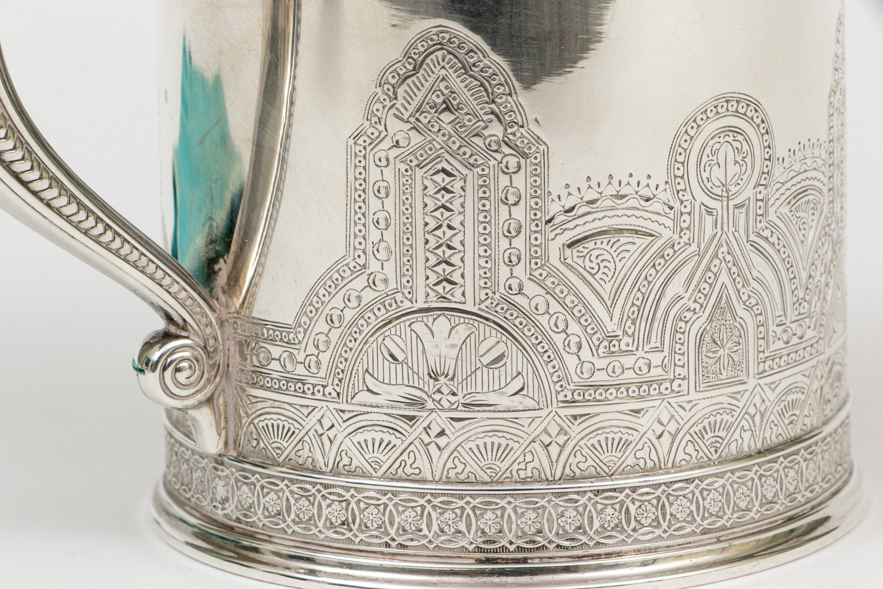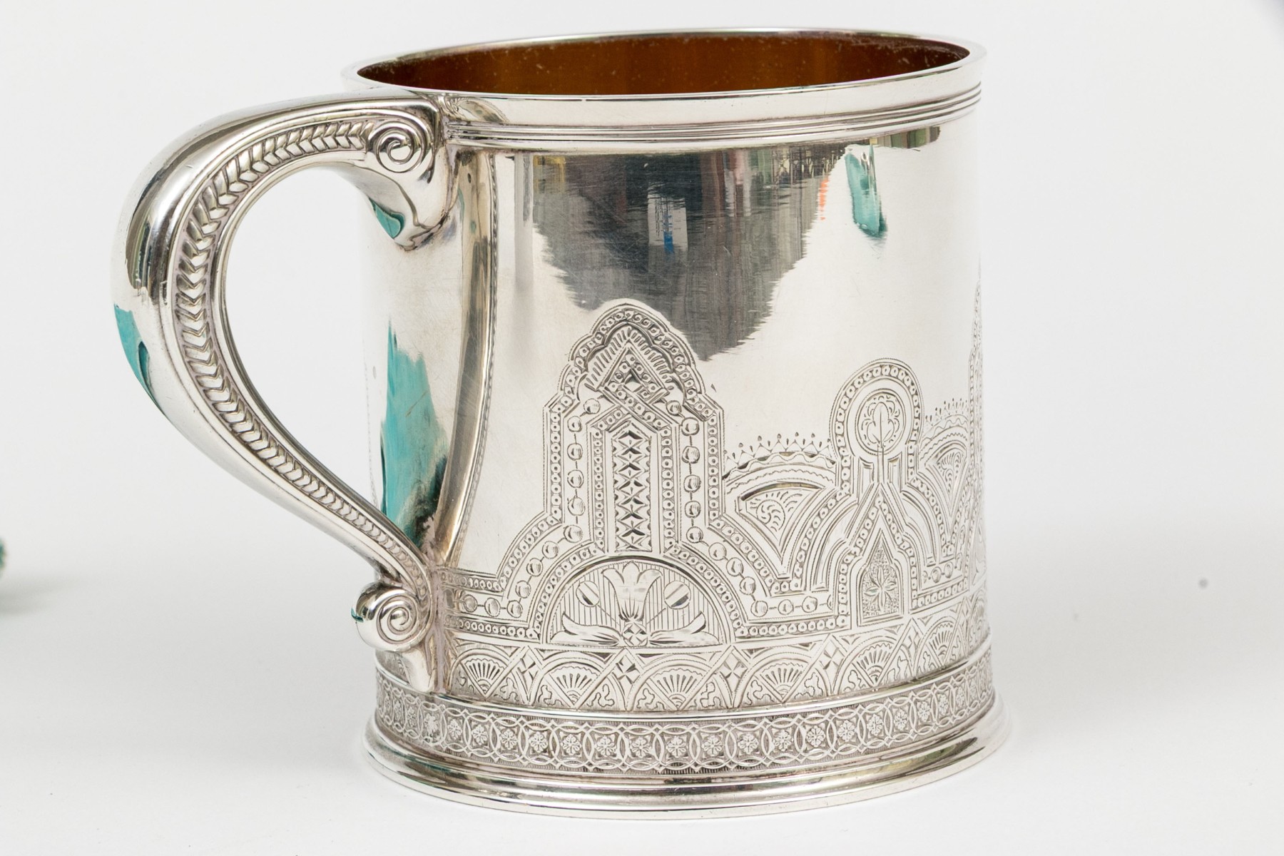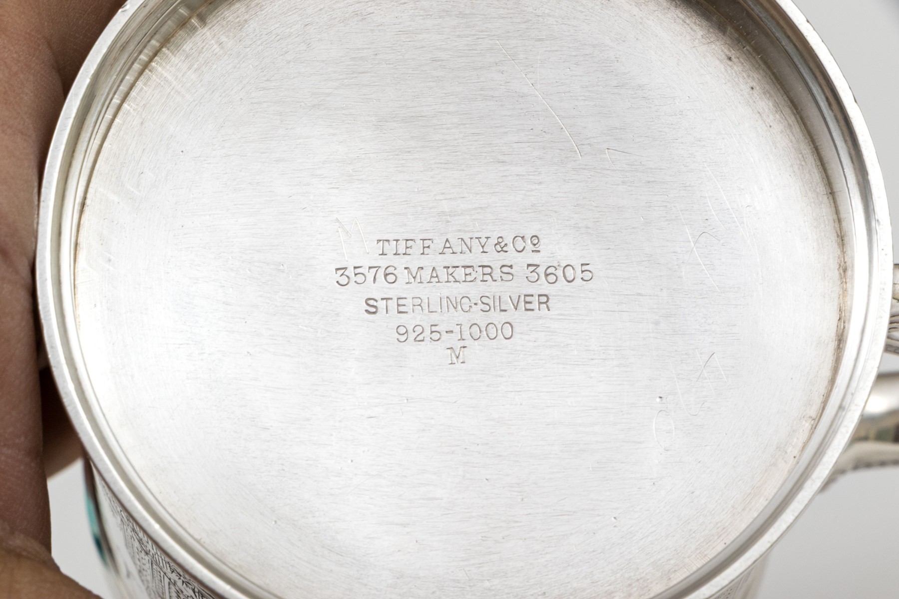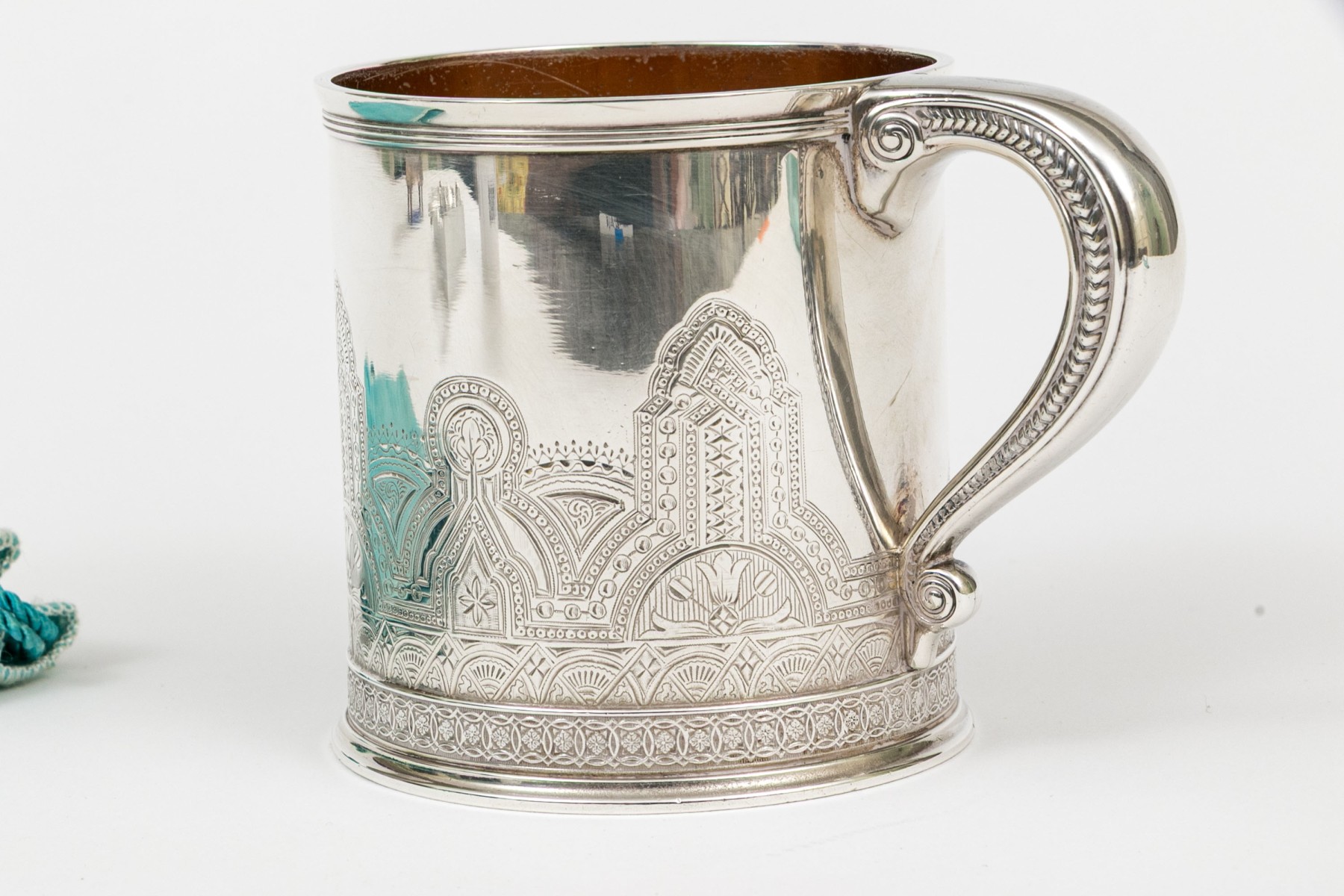 fine Tiffany & Co. sterling silver mug with a sleek, cylindrical form with banded borders around the rim and base. The mug features a gorgeous and ornate engraved Art Deco design of shaped arches and floral motifs with striking geometric borders adding great texture and intrigue. The handle is comfortably thick and detailed with scrolled ends and graduating braided patterns along the sides. Monogrammed RGU center front and marked underfoot.