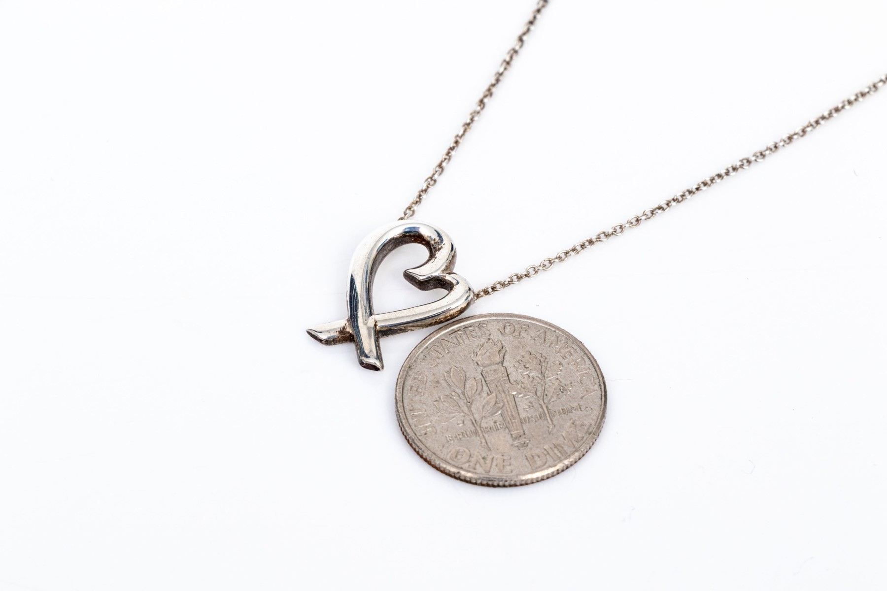 Tiffany & Co. sterling silver Paloma Picasso "Paloma's Graffiti" loving heart necklace. This classic heart and x necklace is displayed on a curb link chain and finished with a spring ring style clasp