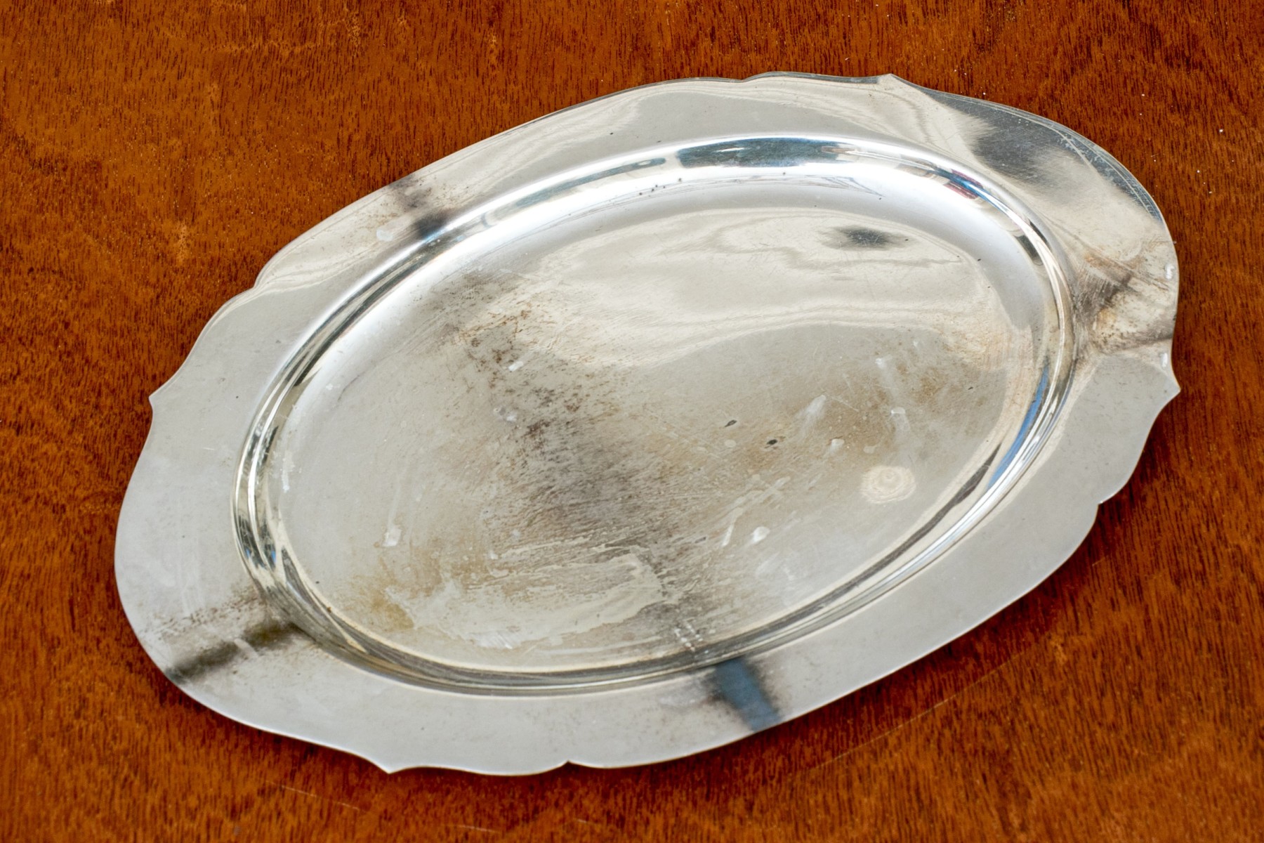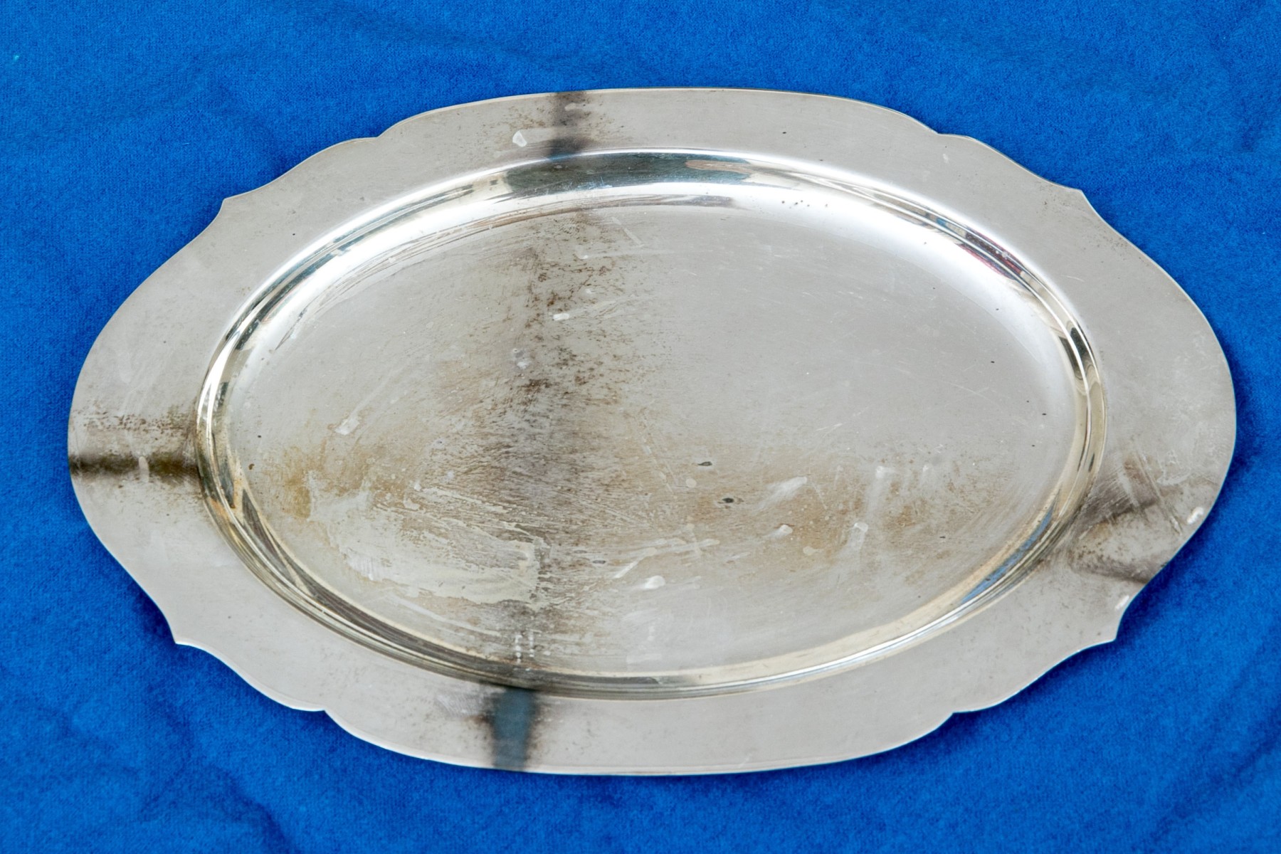 Tarnished, needs polishing. Despite tarnish and gentle wear the plate is in good form.