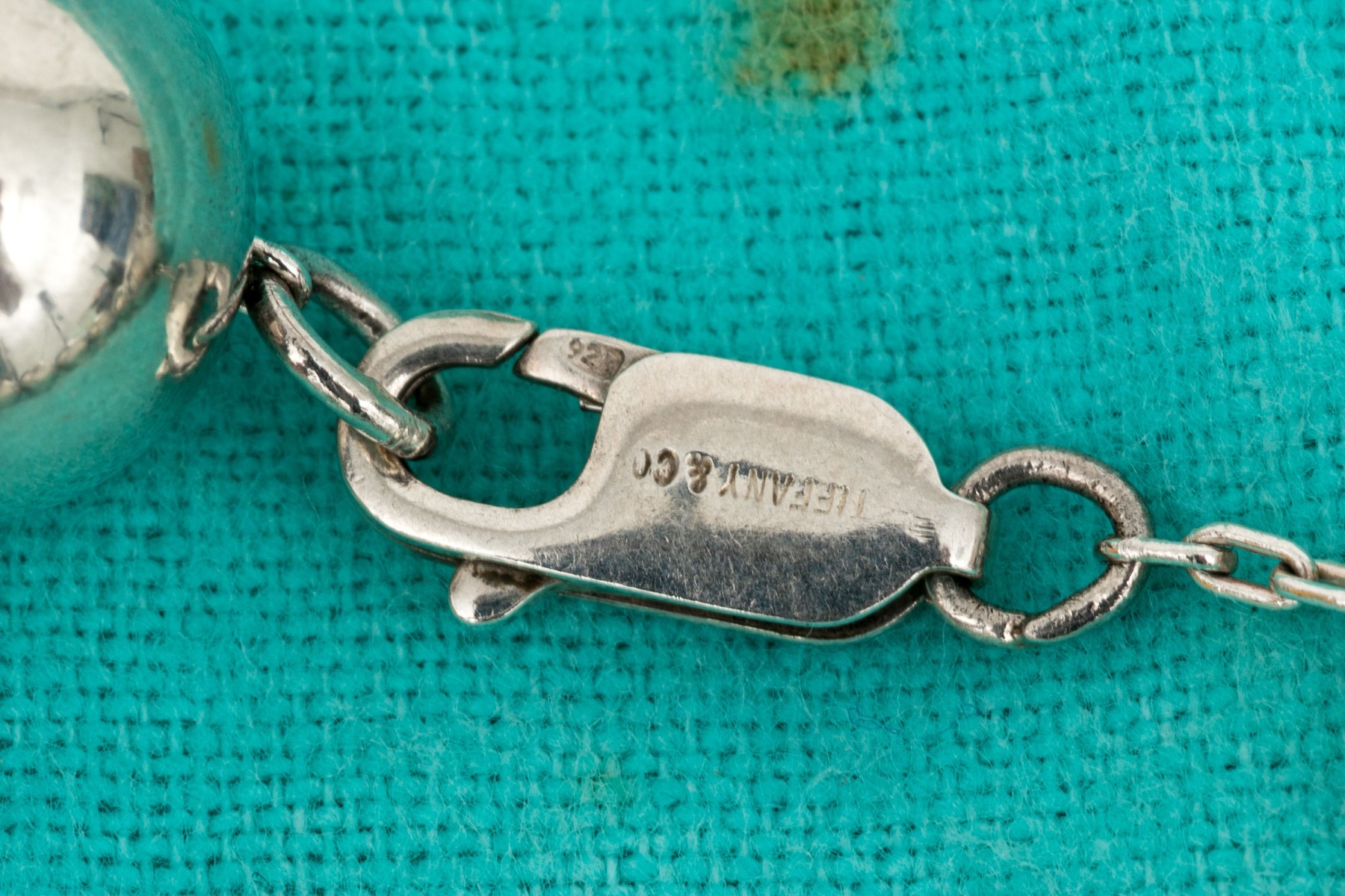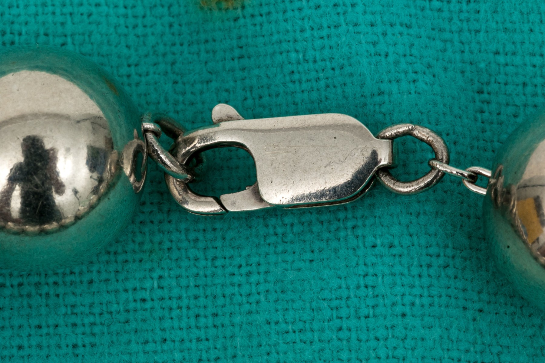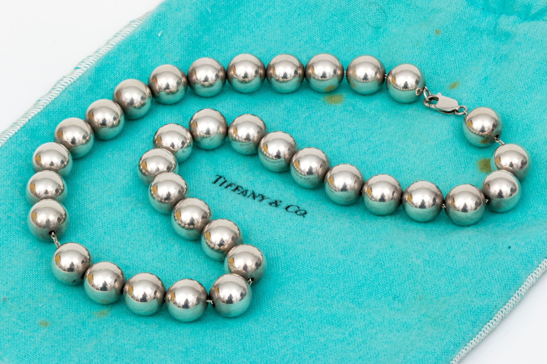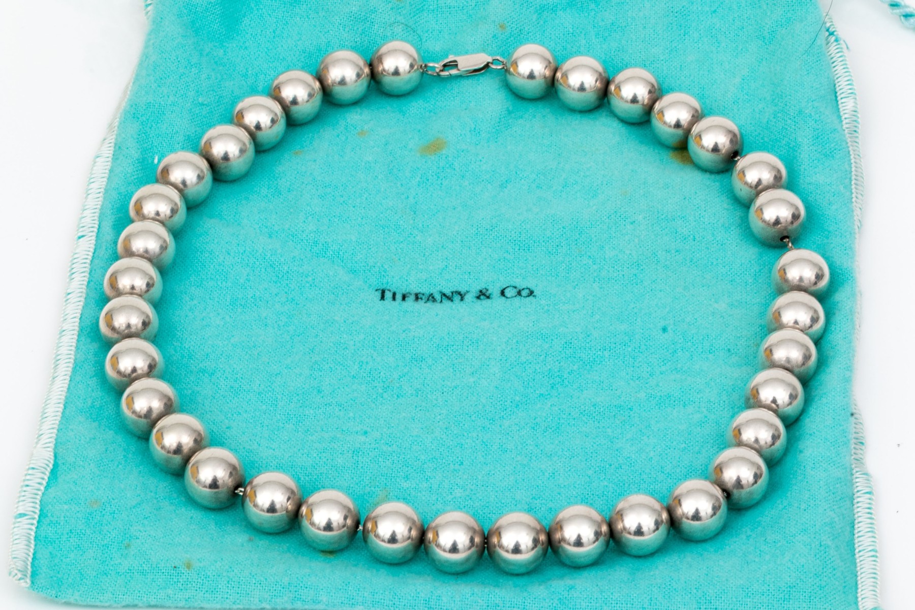 Tiffany & Co. sterling silver striking 12.75 mm bead necklace, finished with a lobster claw style clasp, with pouch.