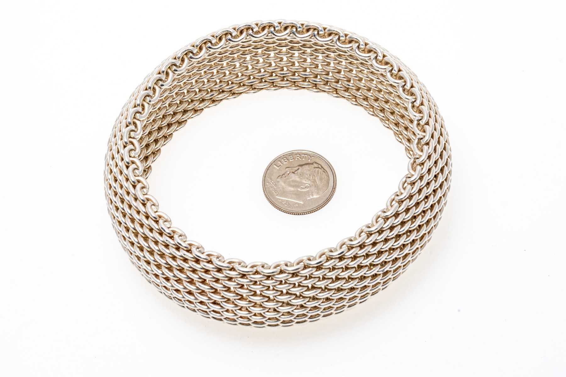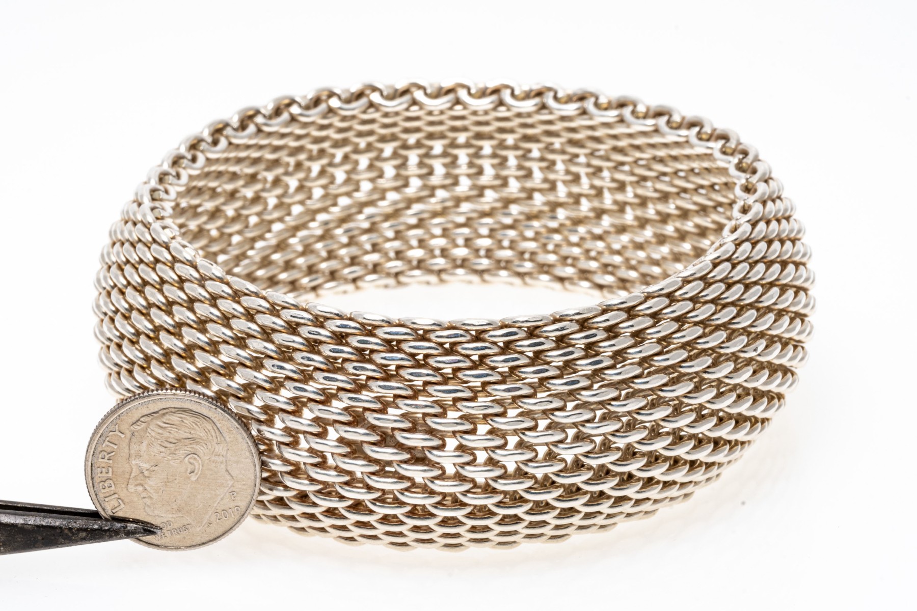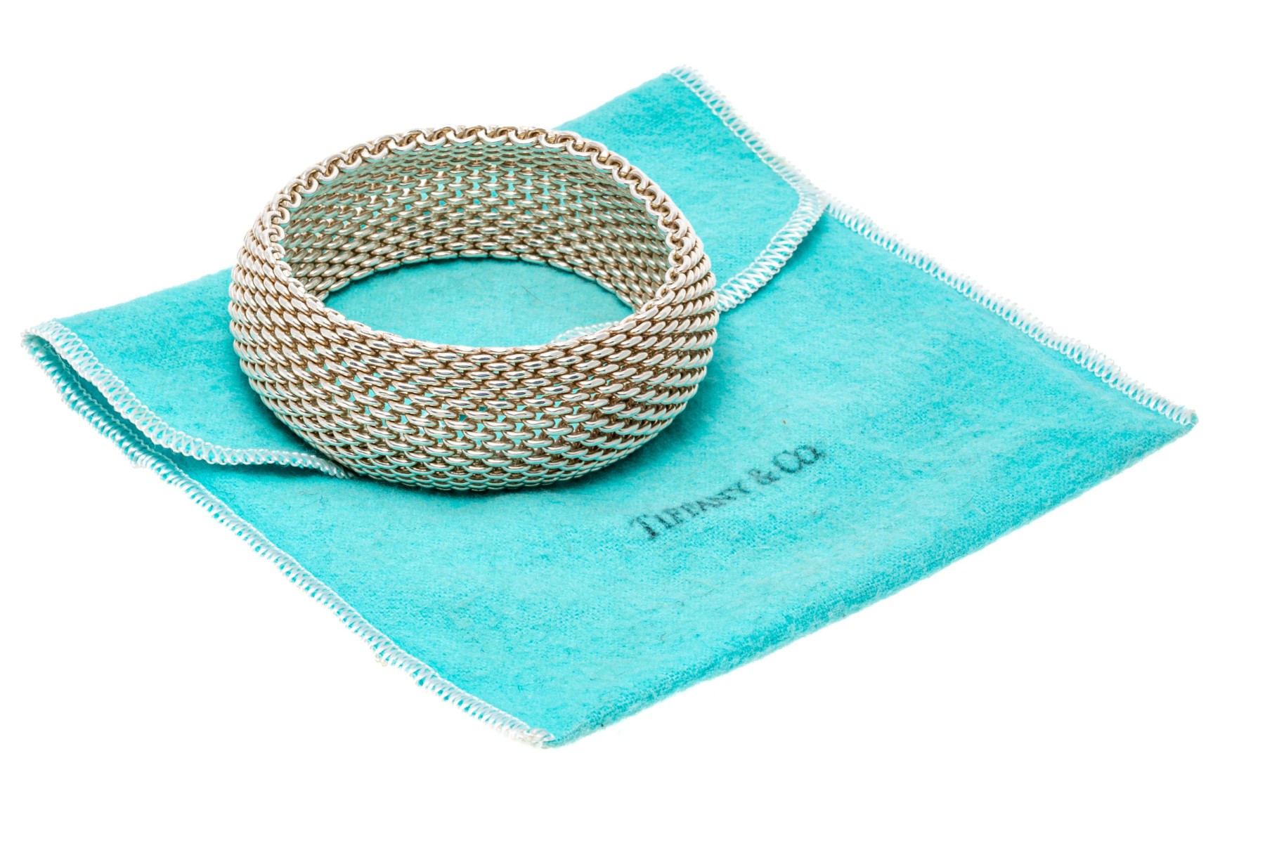 Tiffany & Co. sterling silver striking wide bombe mesh slip on bangle bracelet, with felt