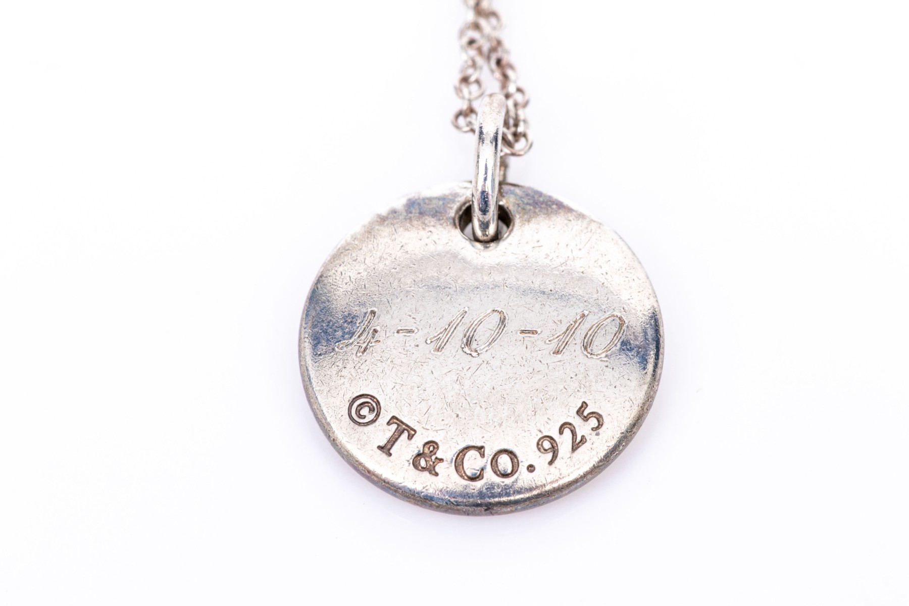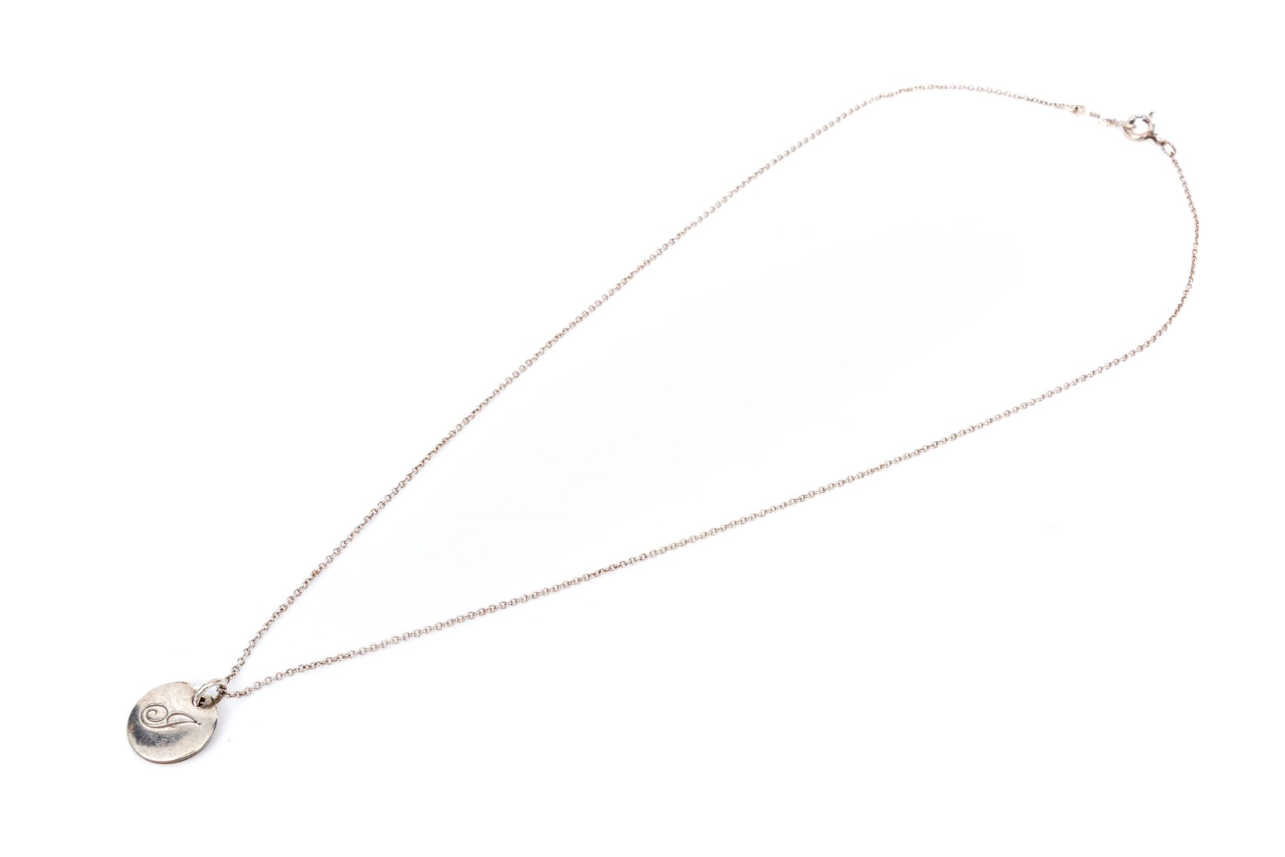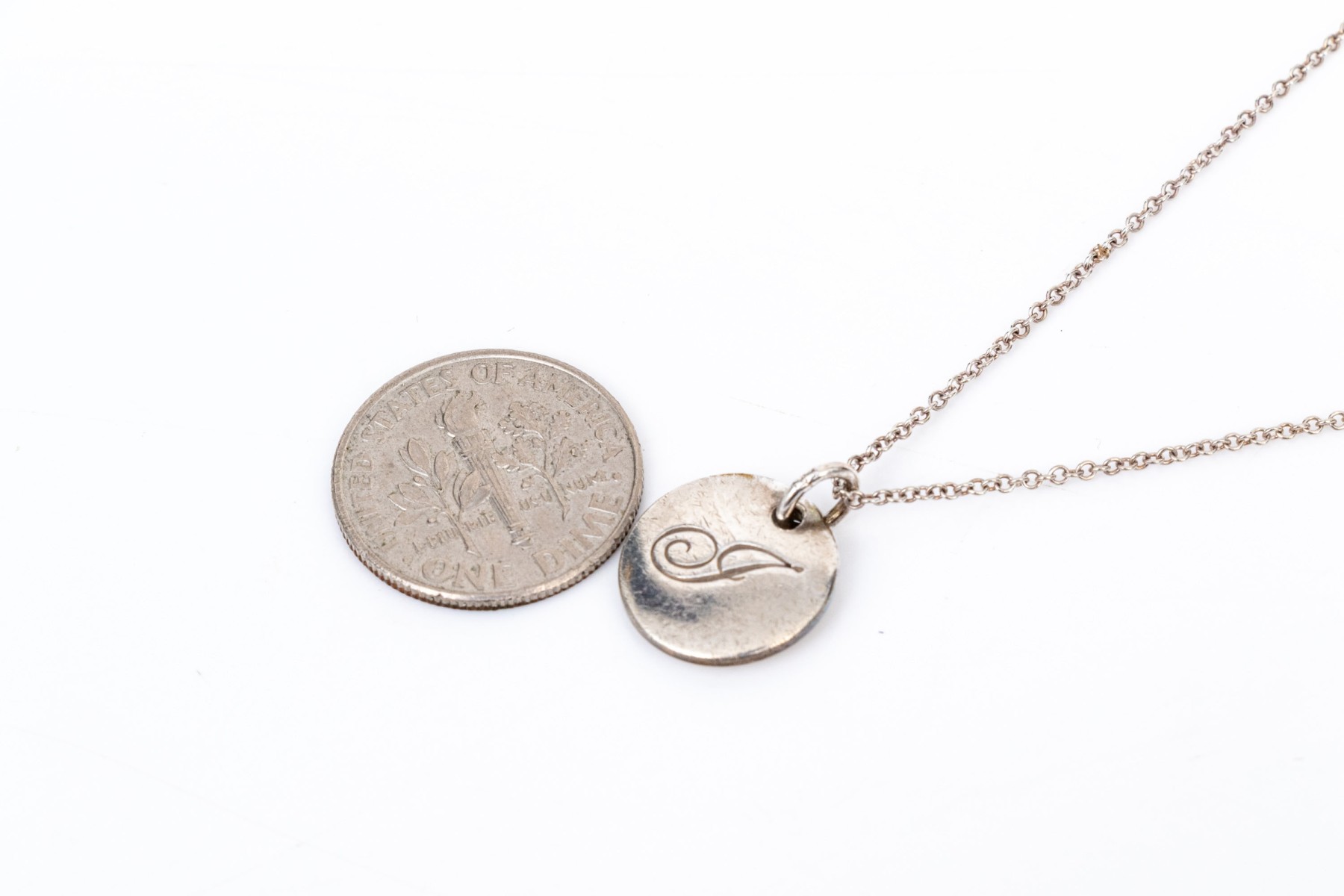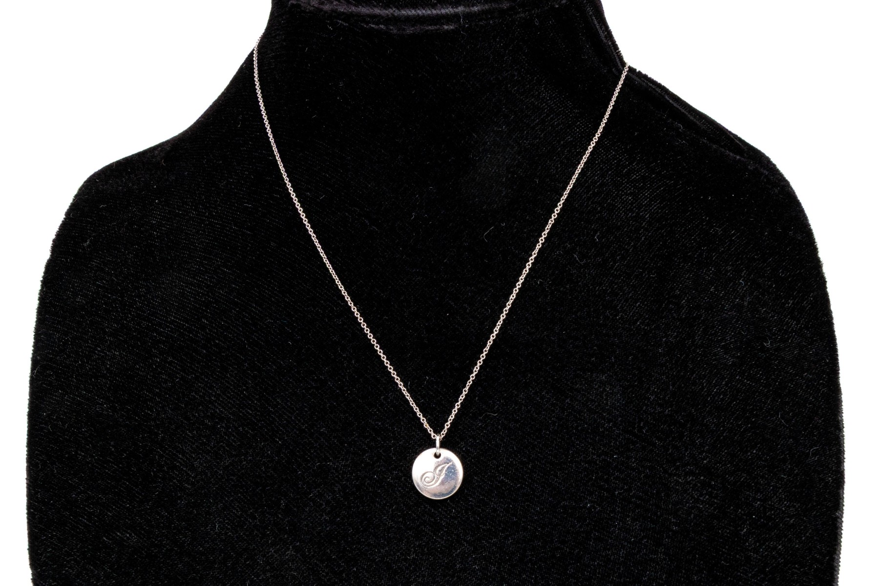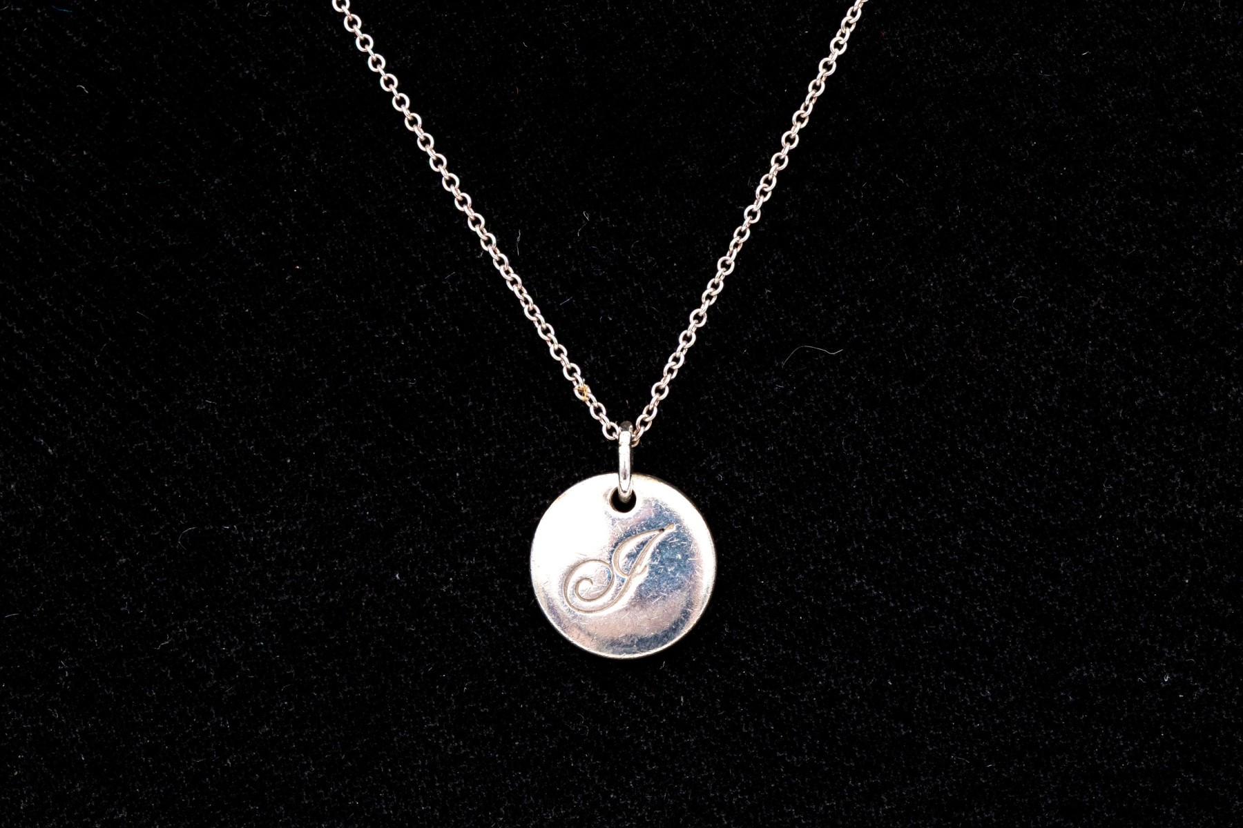 Tiffany & Co. sterling silver "Tiffany Notes" small script letter "J" pendant, with chain. This graceful pendant features a script letter "J", engraved on a round pendant, which is displayed on a cable link chain and finished with a spring ring style clasp