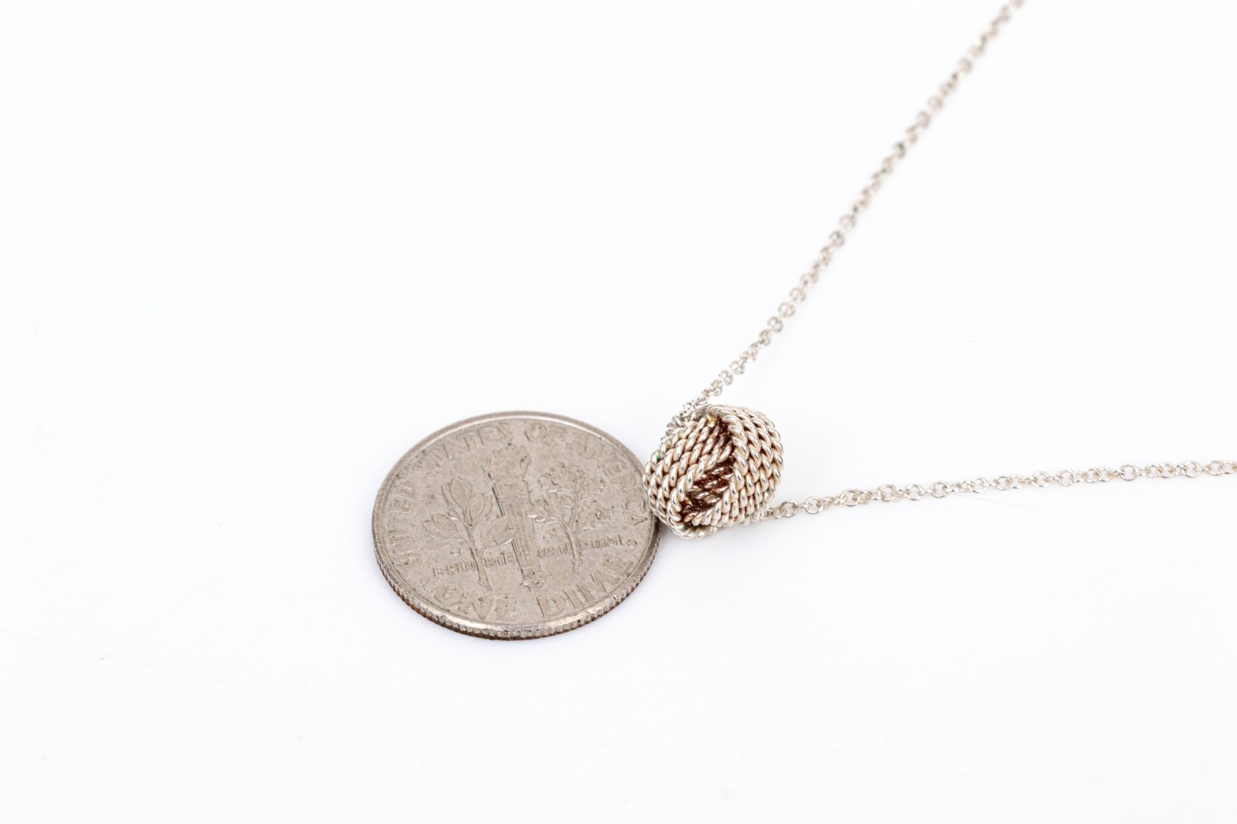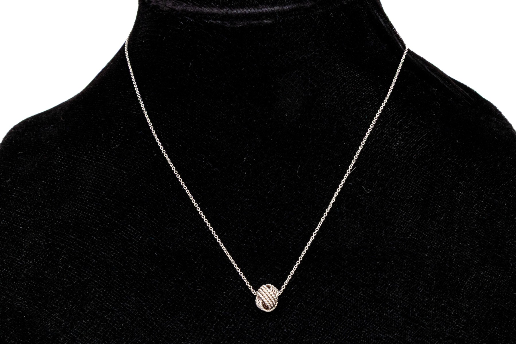 Tiffany & Co. sterling silver "Tiffany Twist" braided triple knot centered necklace. This classic knot necklace is displayed on a curb link chain and finished with a spring ring style clasp