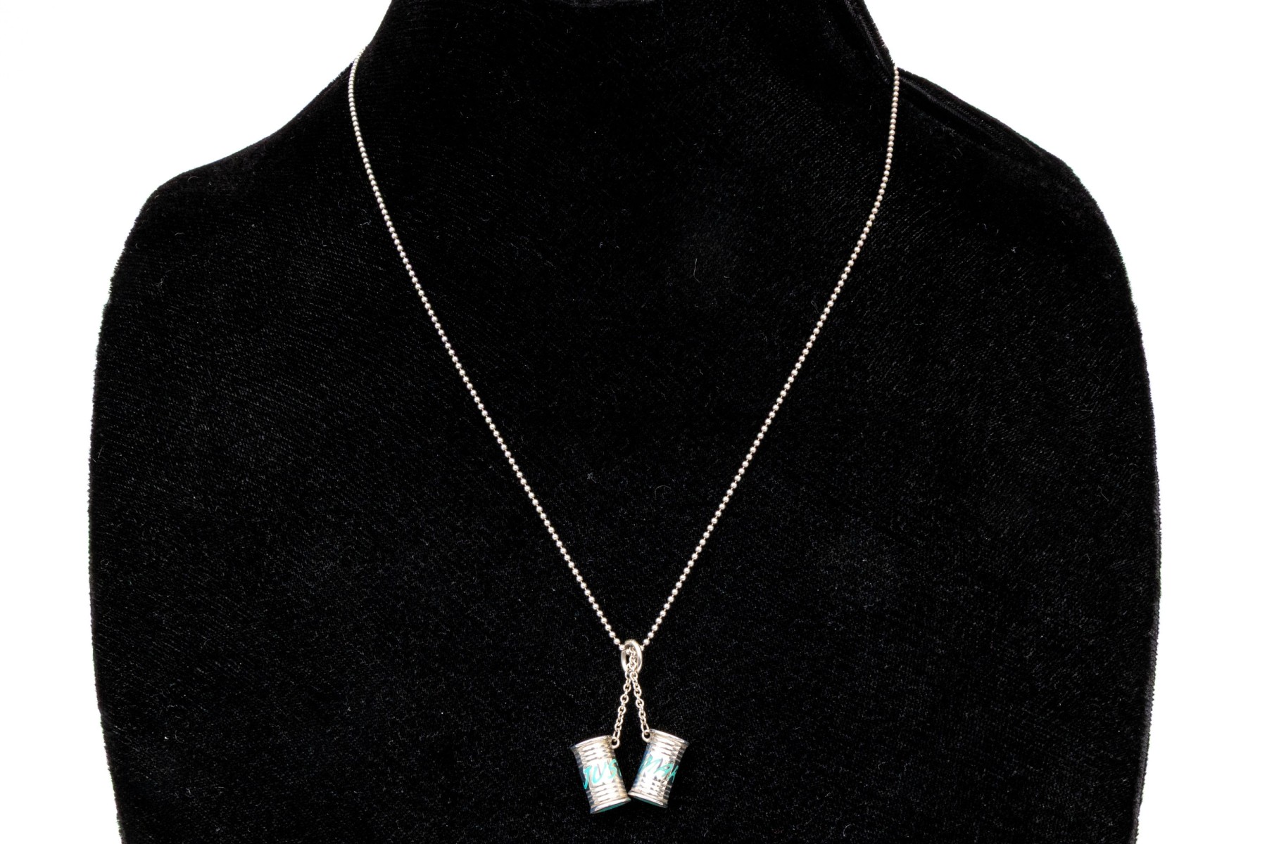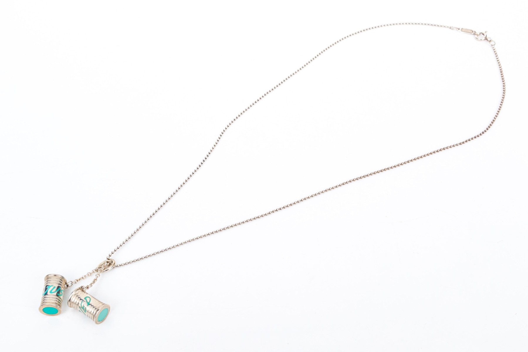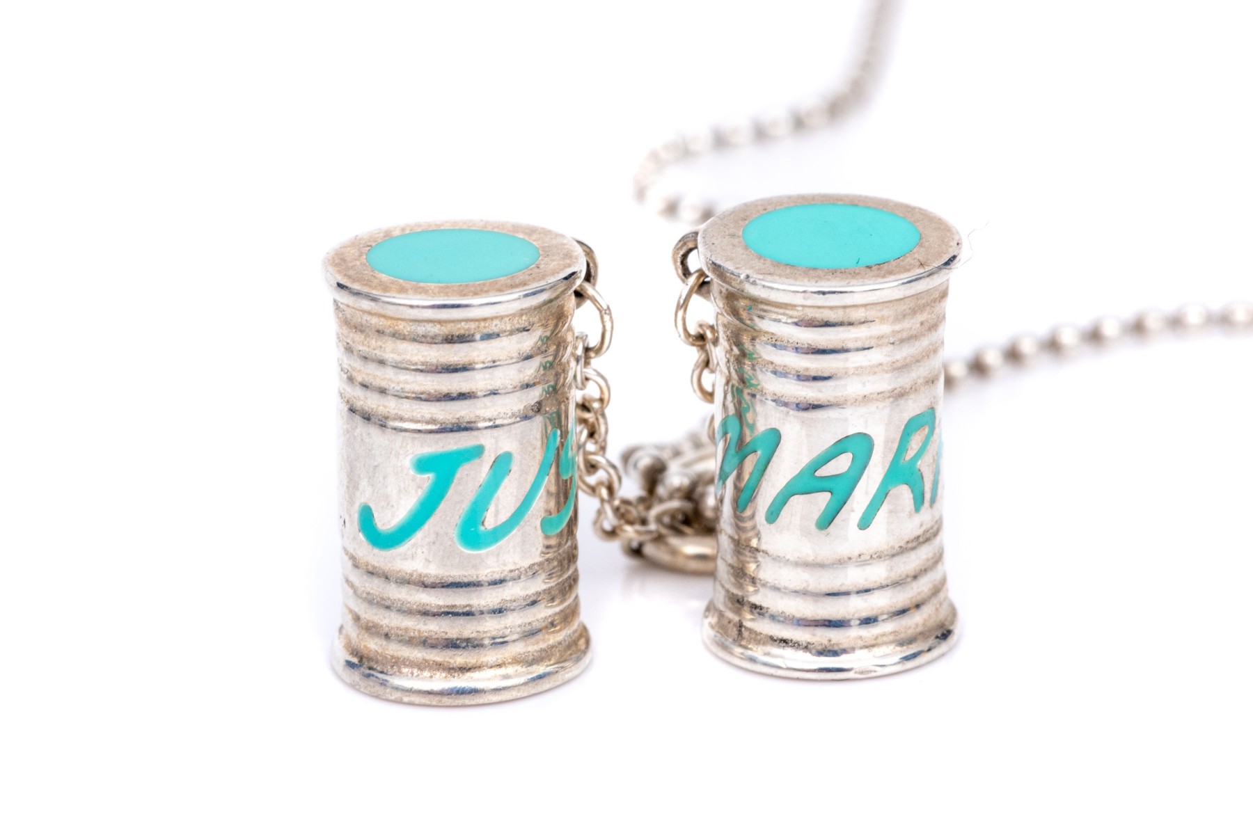 Tiffany & Co. sterling silver unusual Tiffany blue enamel "Just Married" can motif pendant, with chain. This fabulous drop pendant is sterling silver, with Tiffany blue enamel decorations on a pair of cans, which is displayed on a beaded chain and finished with a spring ring style clasp