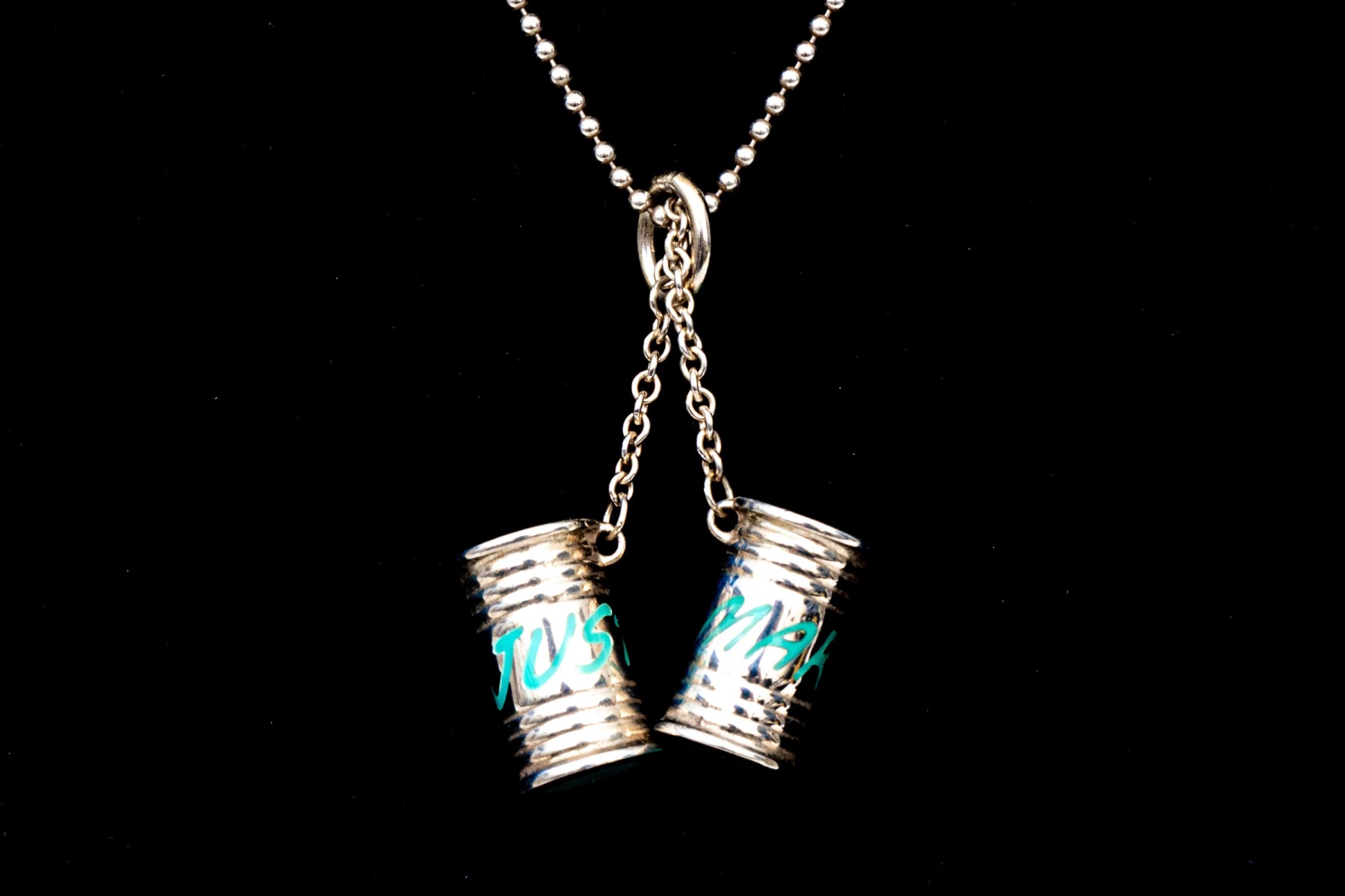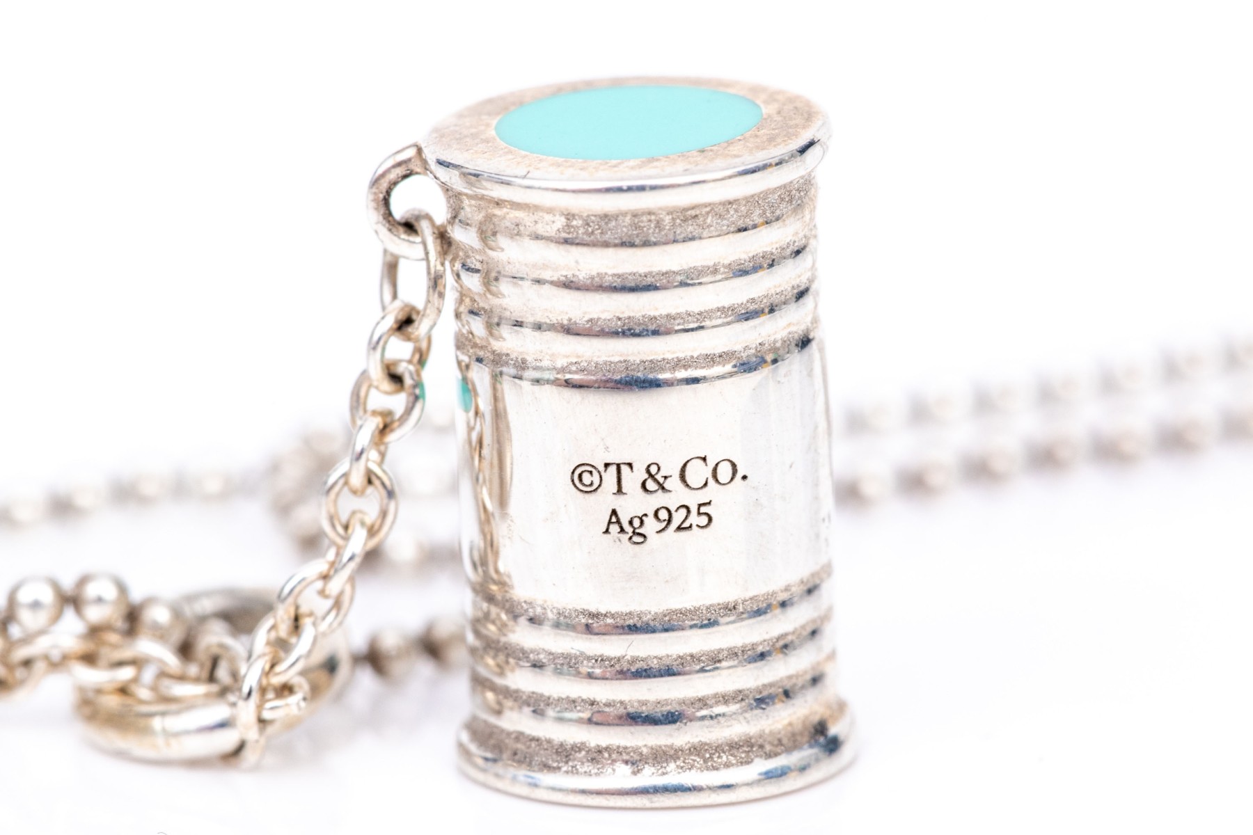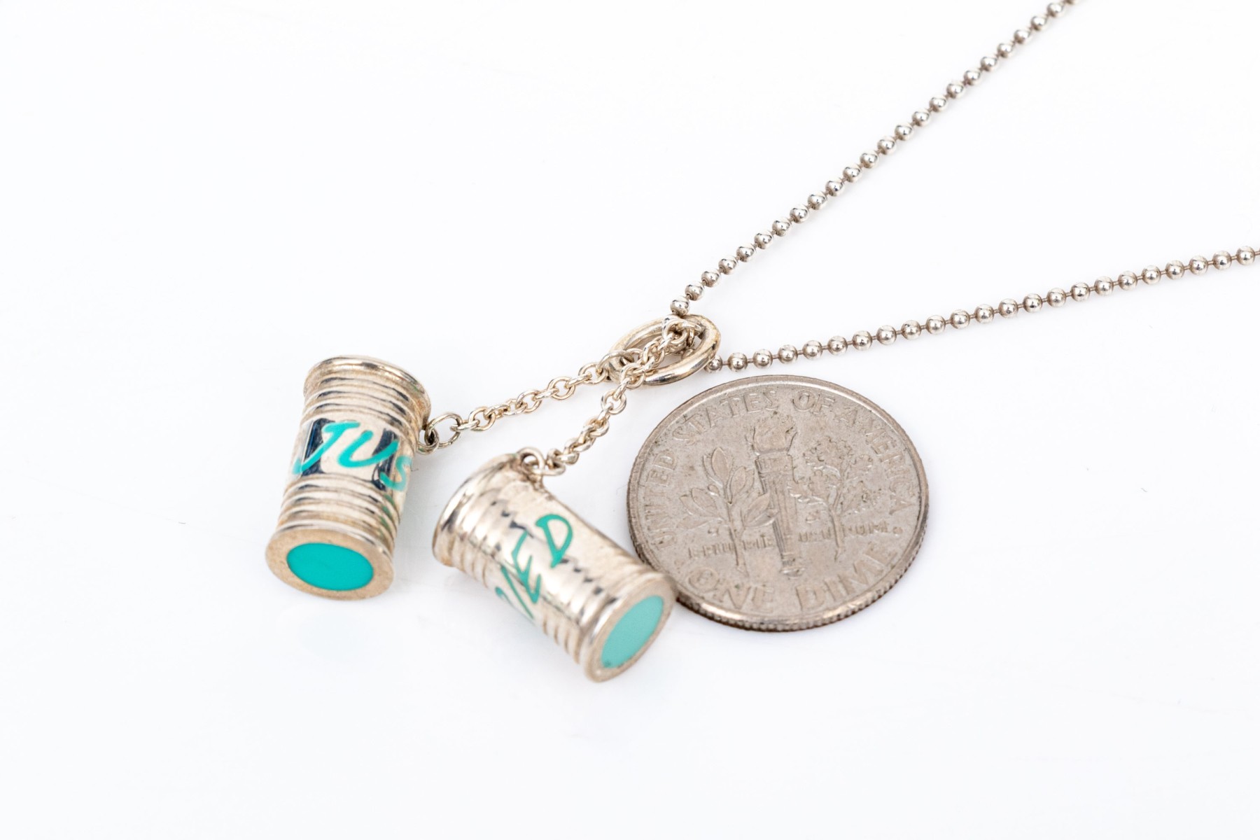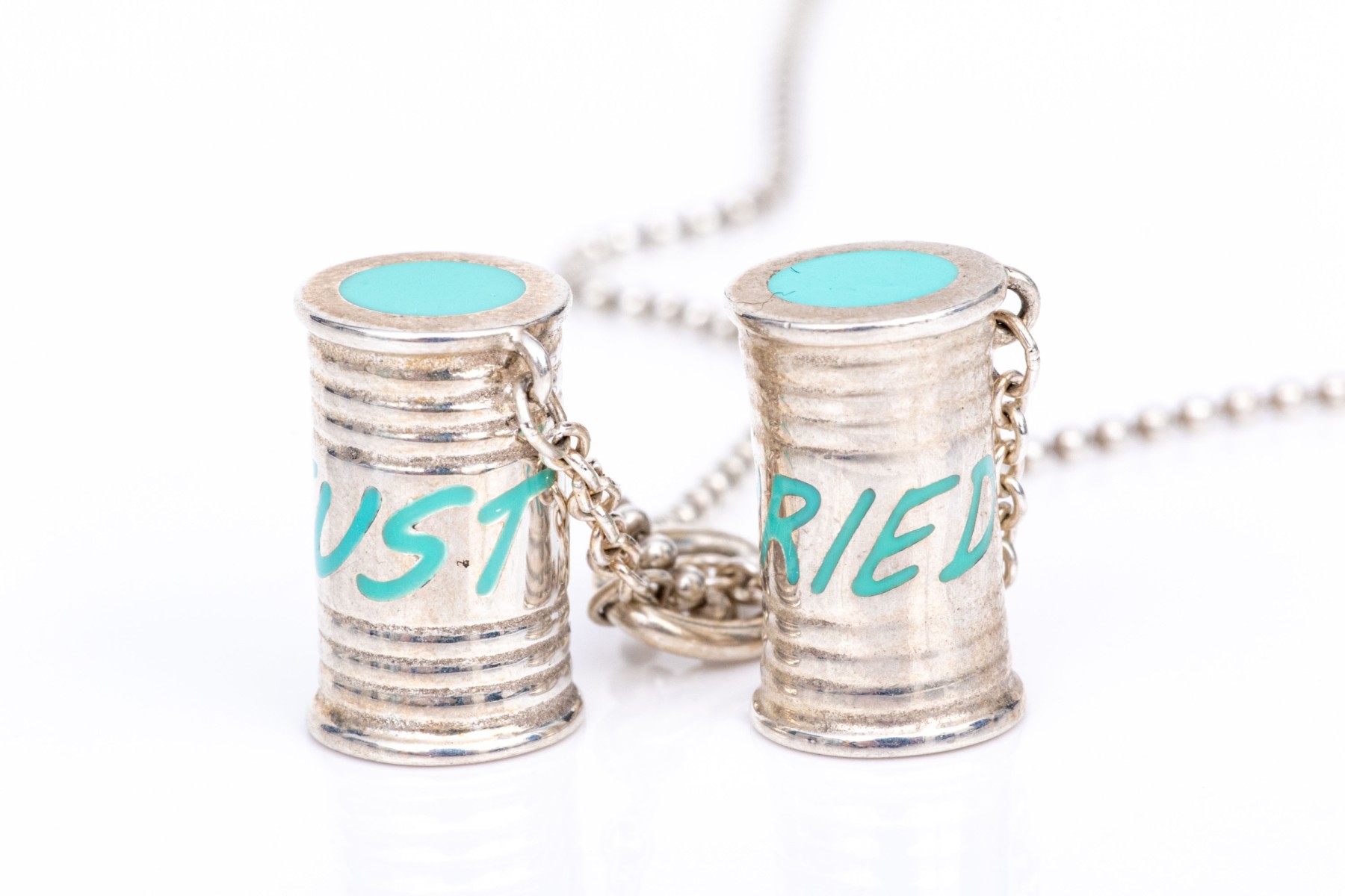 Tiffany & Co. sterling silver unusual Tiffany blue enamel "Just Married" can motif pendant, with chain. This fabulous drop pendant is sterling silver, with Tiffany blue enamel decorations on a pair of cans, which is displayed on a beaded chain and finished with a spring ring style clasp