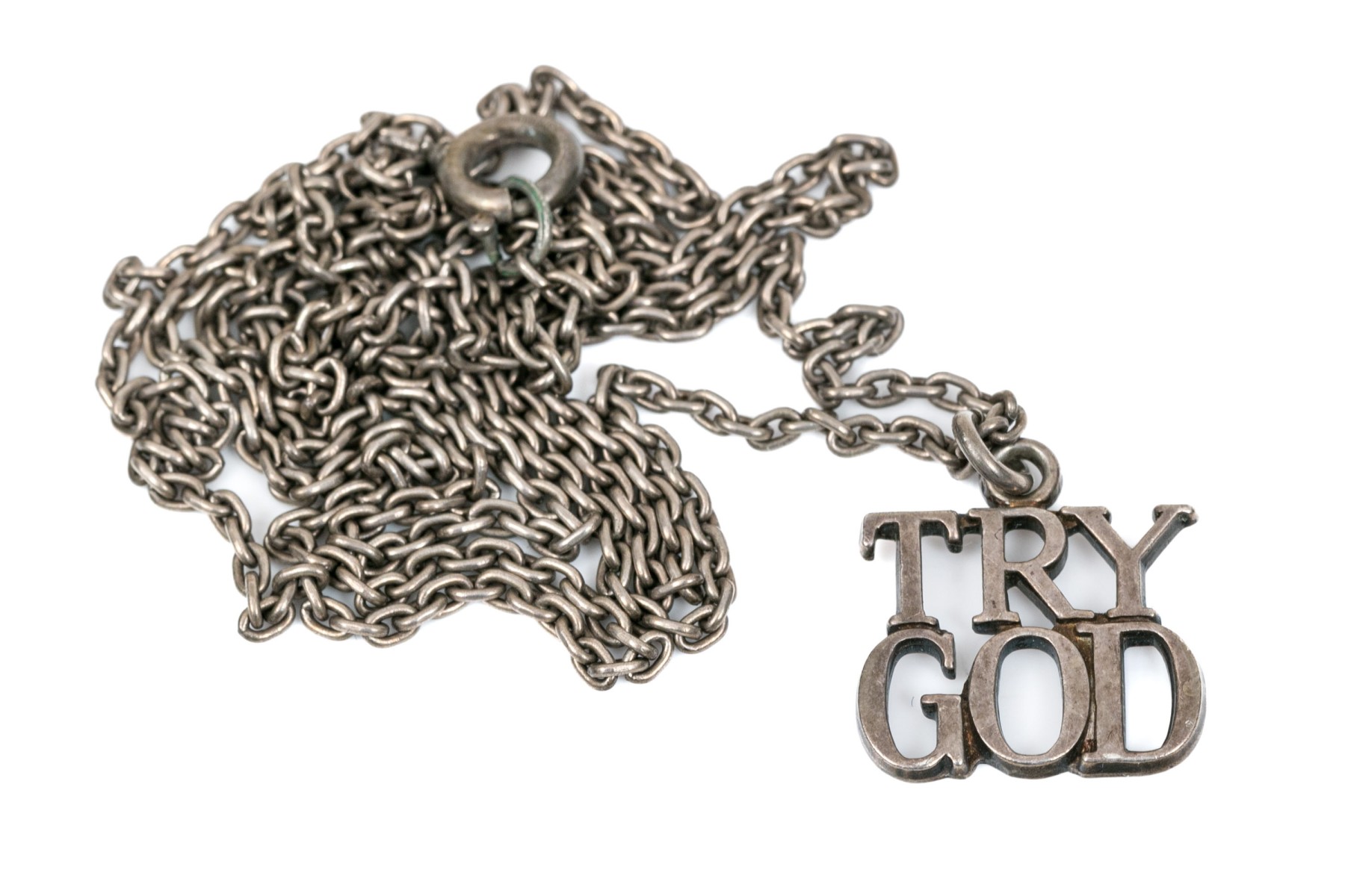 A sterling silver chain displaying a 'Try God' Pendant by Tiffany & Company. The chain secures with a spring ring clasp.