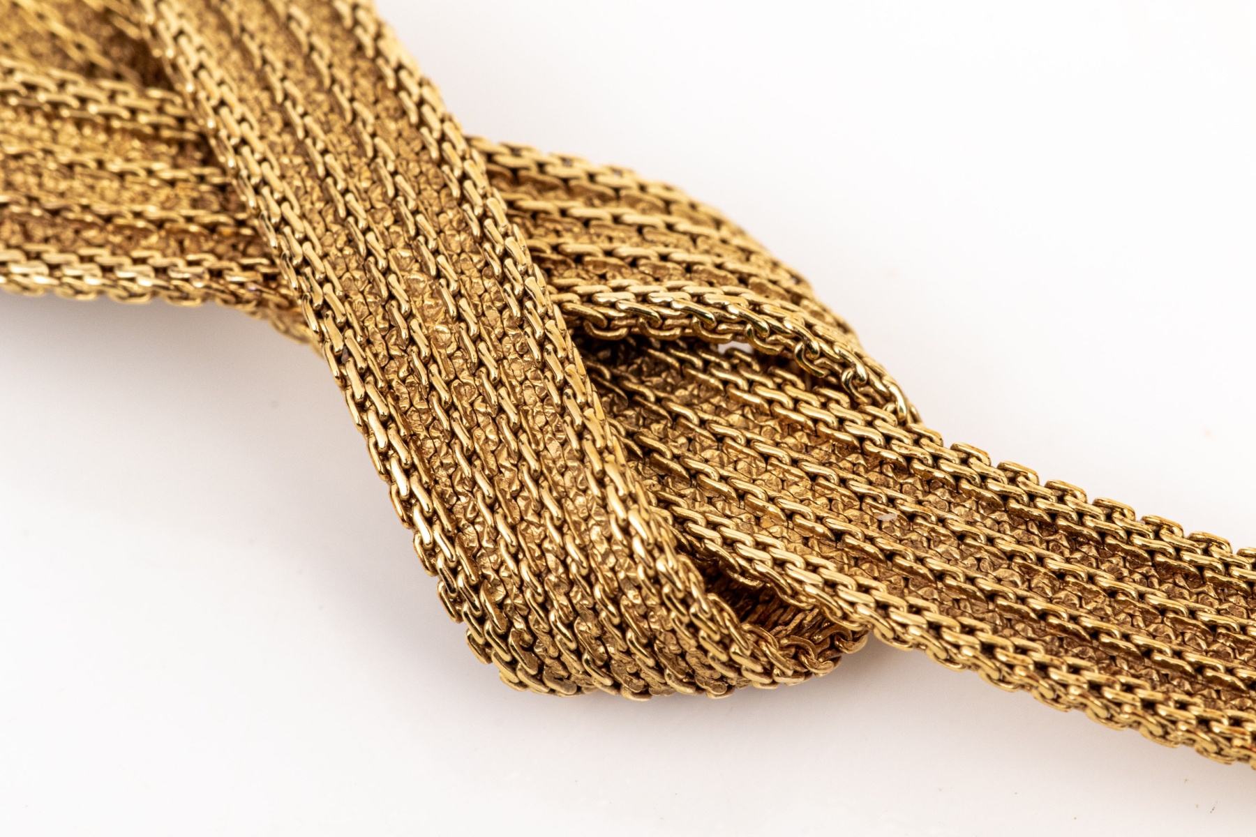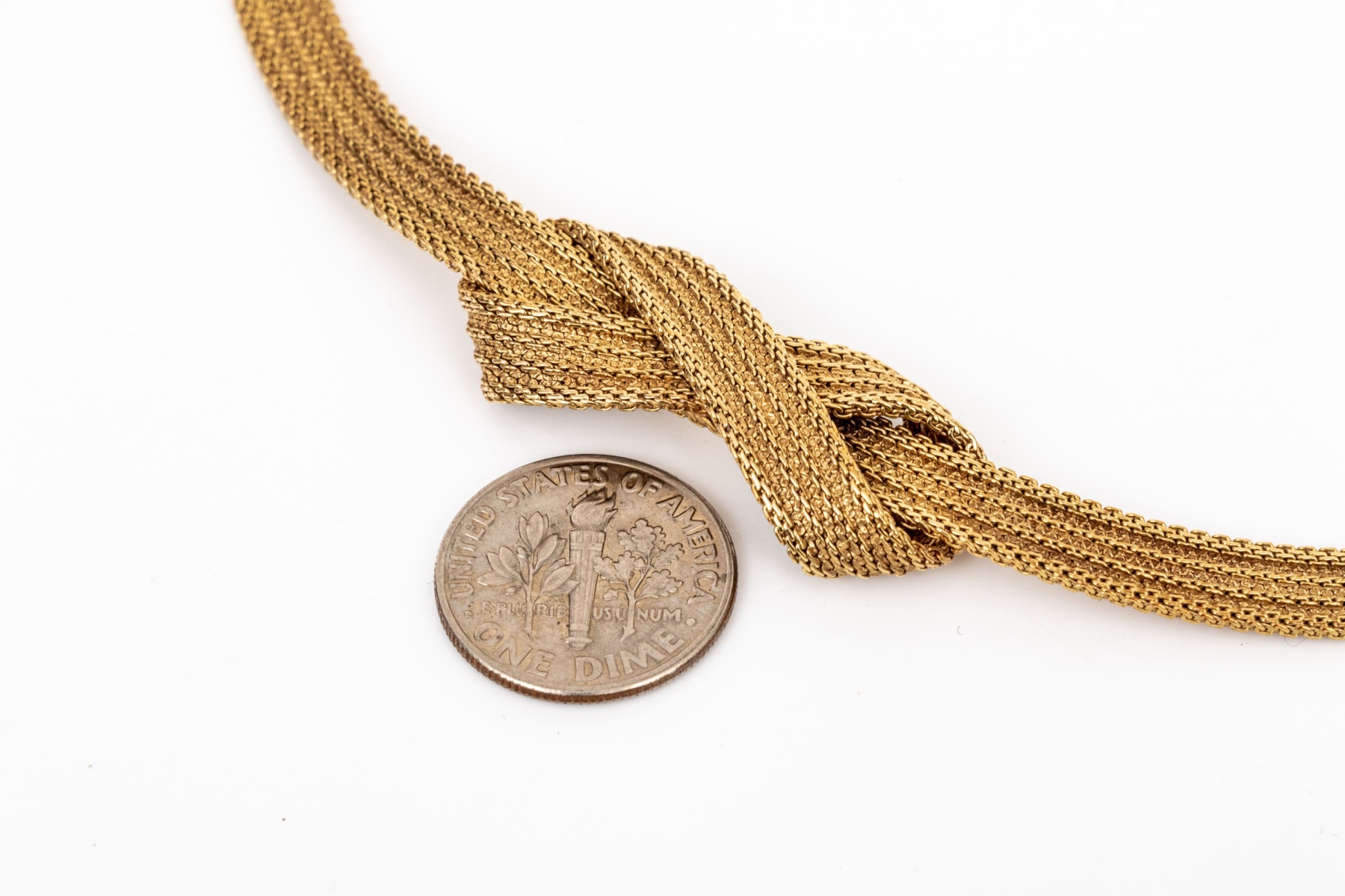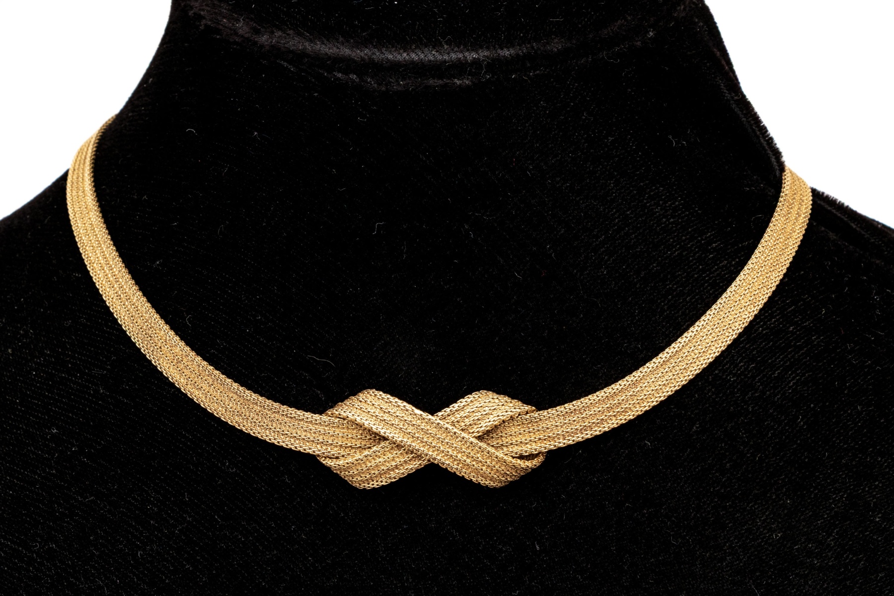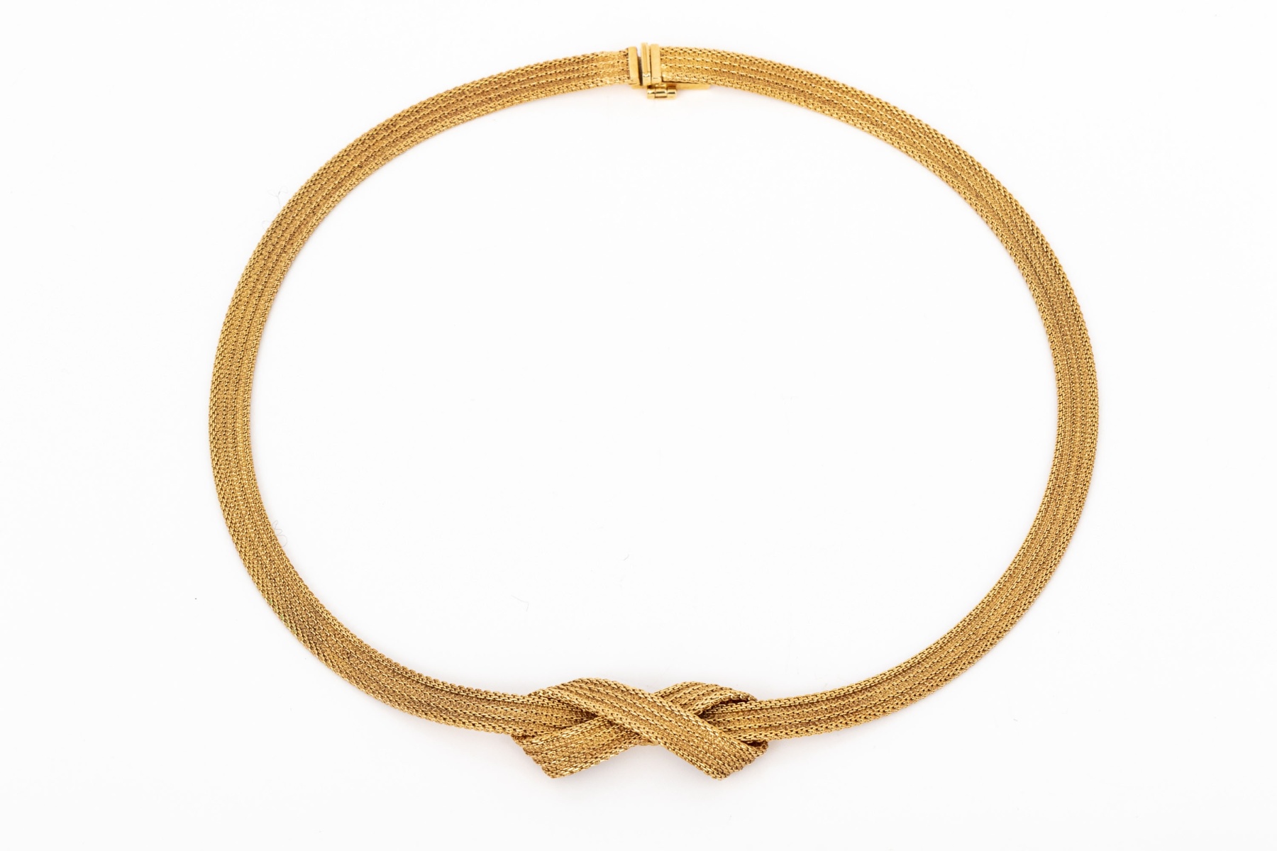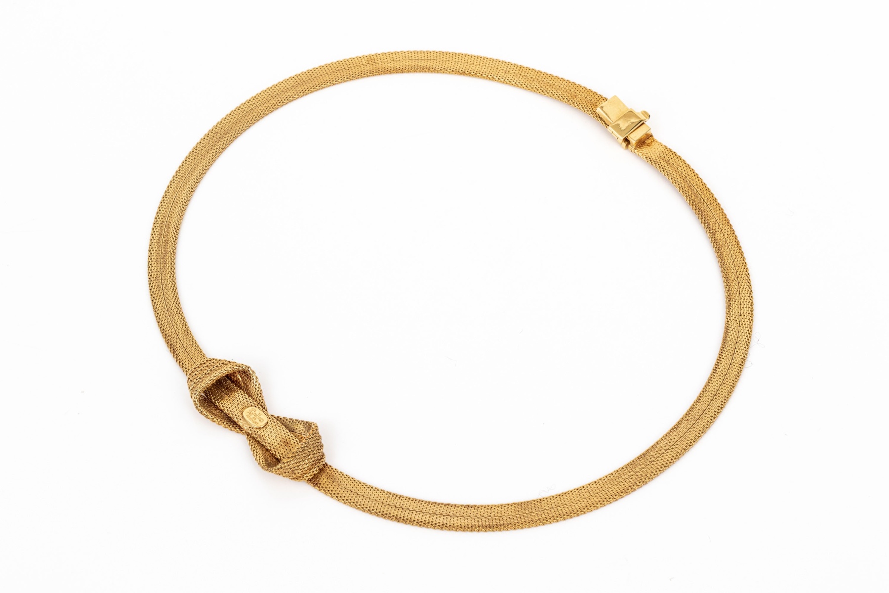 Tiffany & Co. vintage 14k yellow gold wonderful vintage mesh knot necklace, by Grosse Germany. This fabulous retro necklace features a matte finished woven mesh, knotted in the center and completed with a hidden box style clasp and a foldover safety.