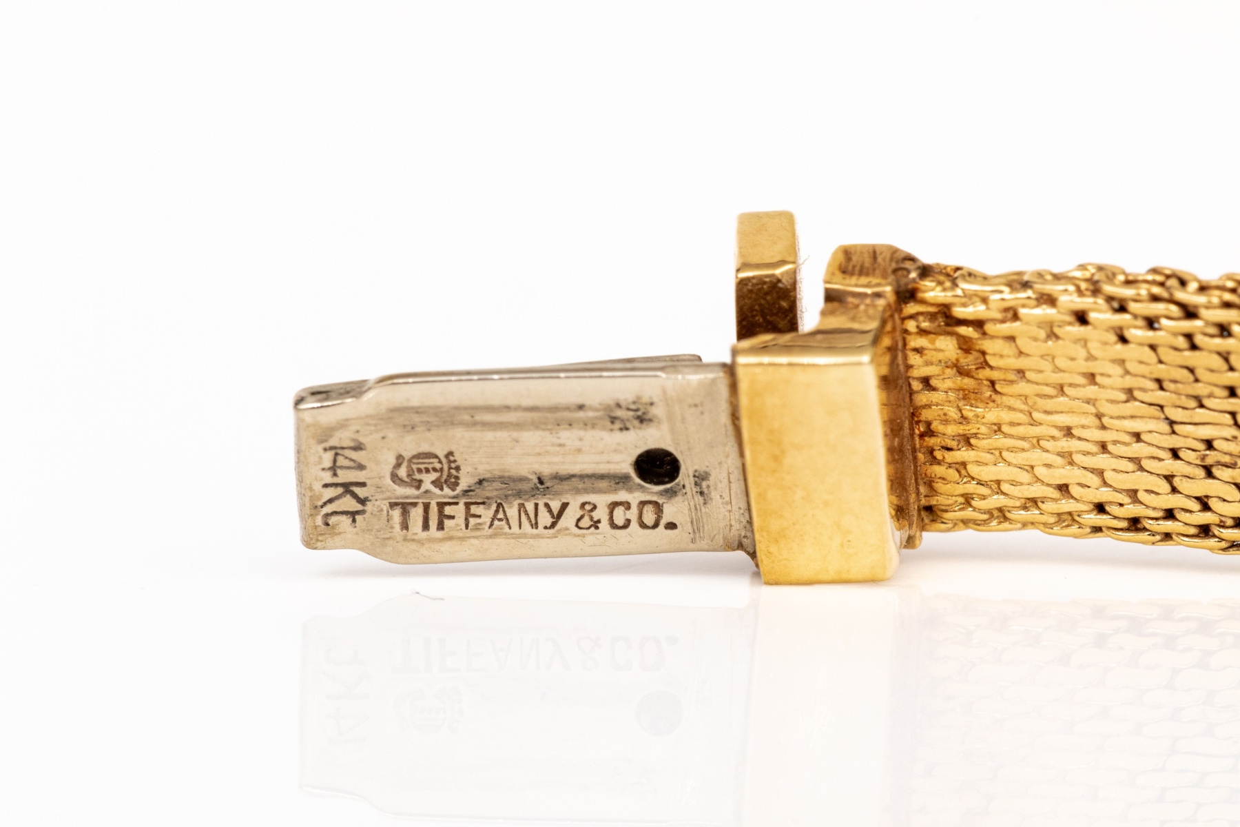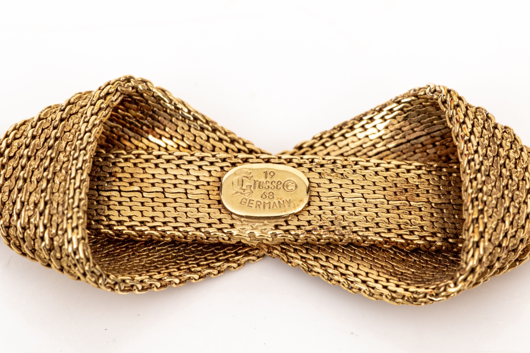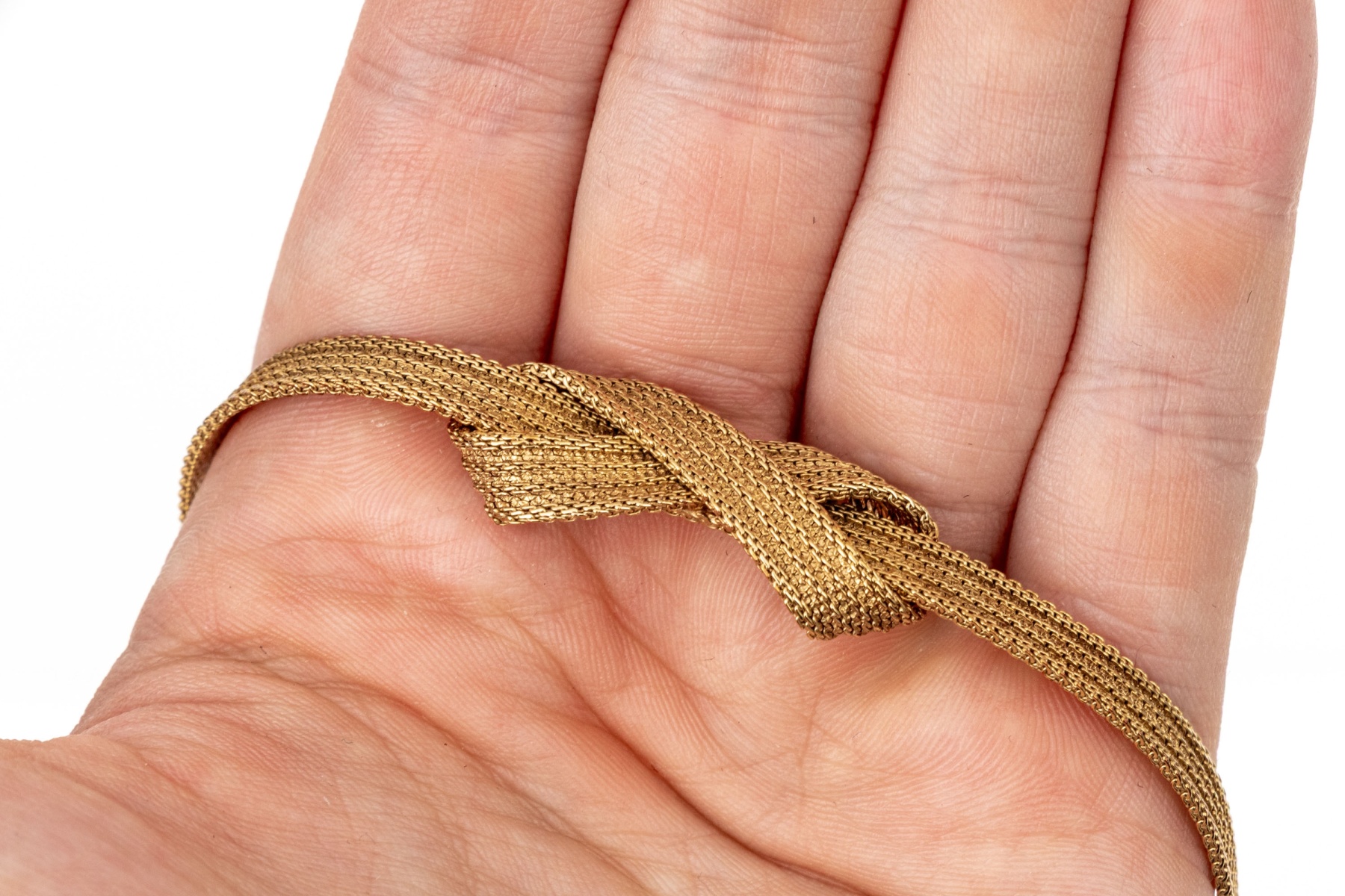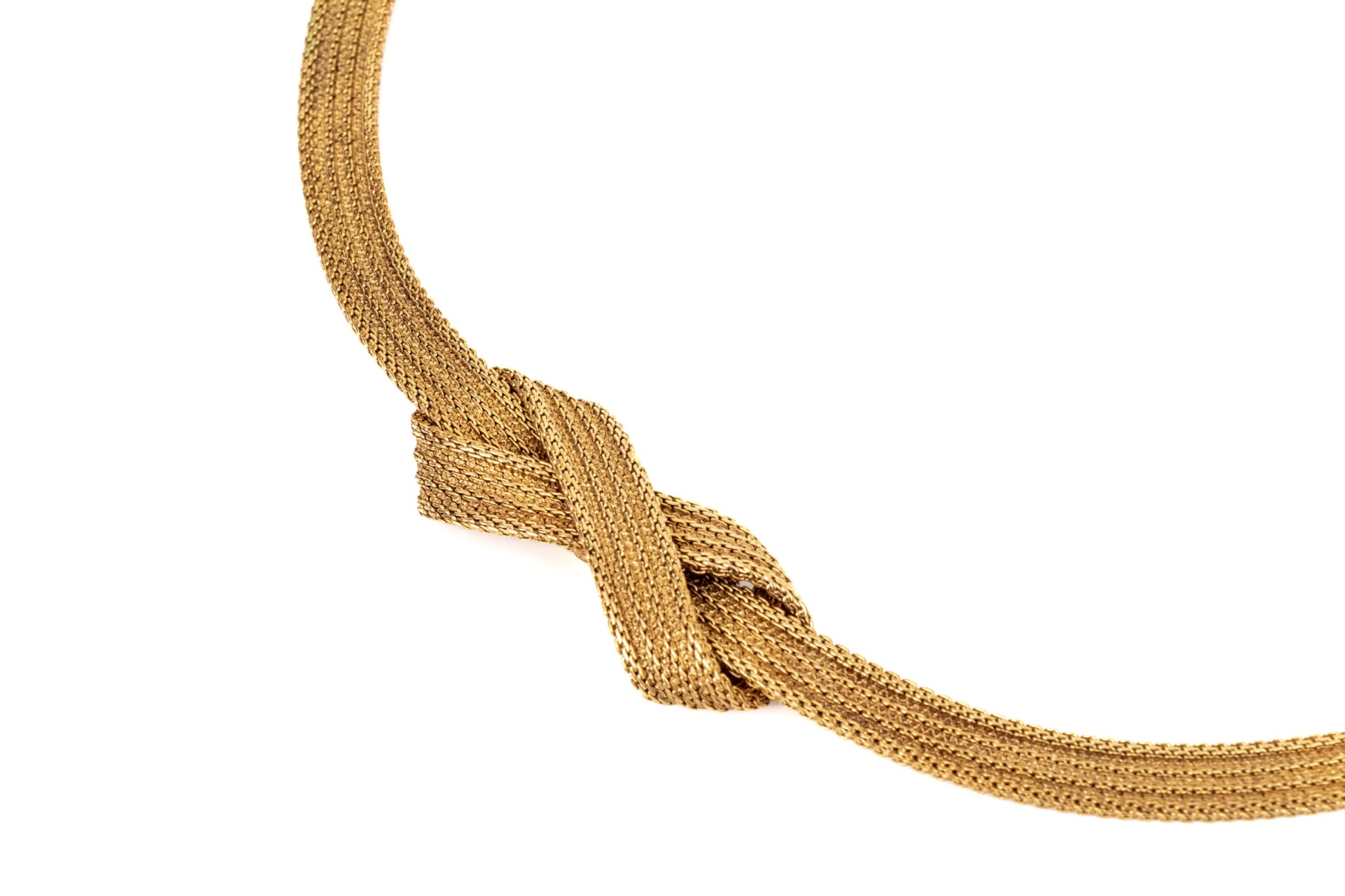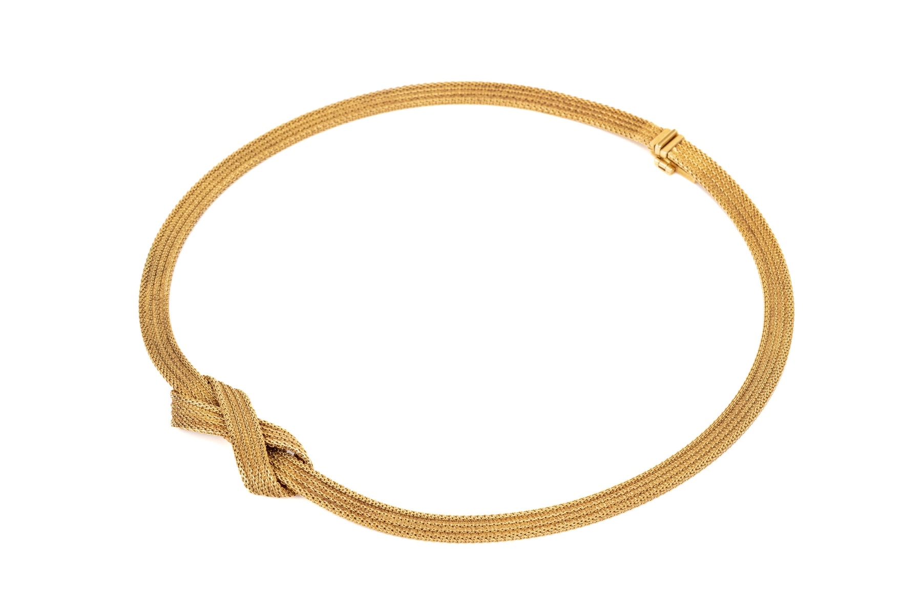 Tiffany & Co. vintage 14k yellow gold wonderful vintage mesh knot necklace, by Grosse Germany. This fabulous retro necklace features a matte finished woven mesh, knotted in the center and completed with a hidden box style clasp and a foldover safety.