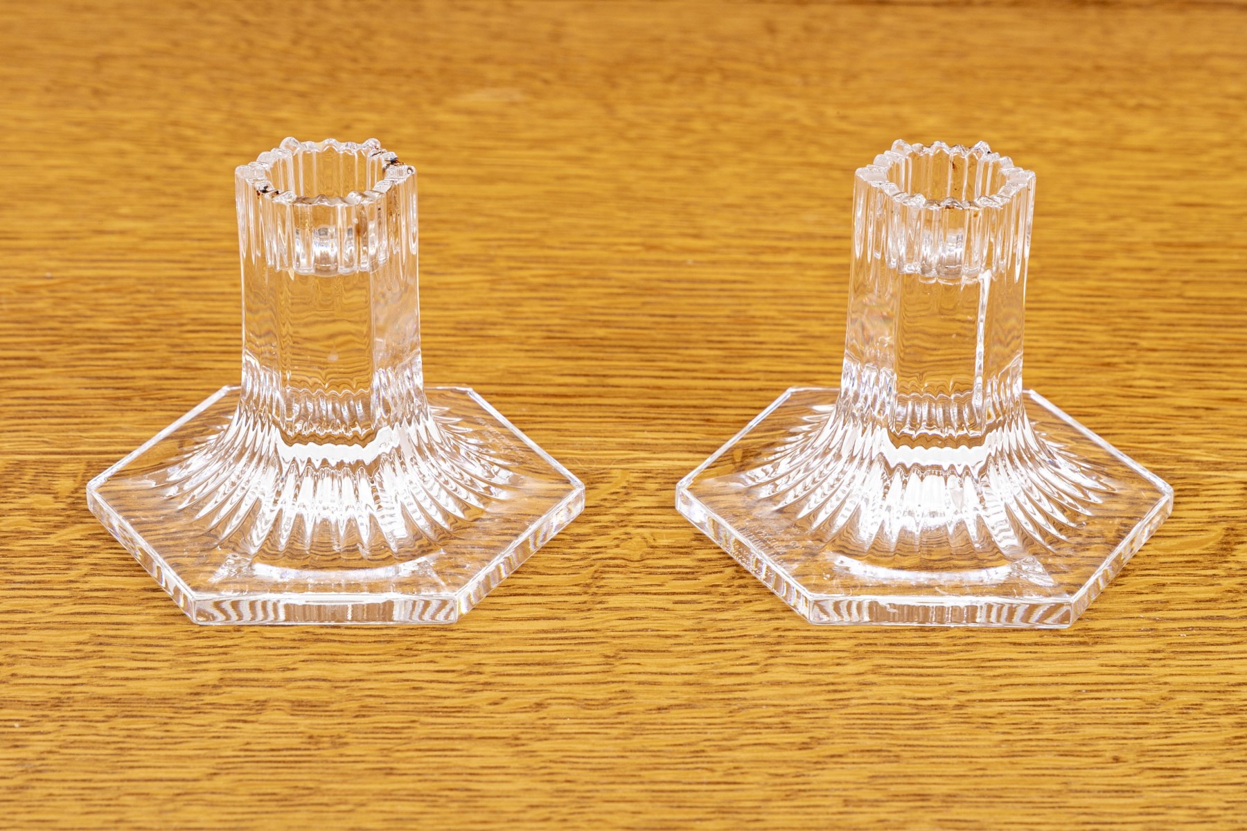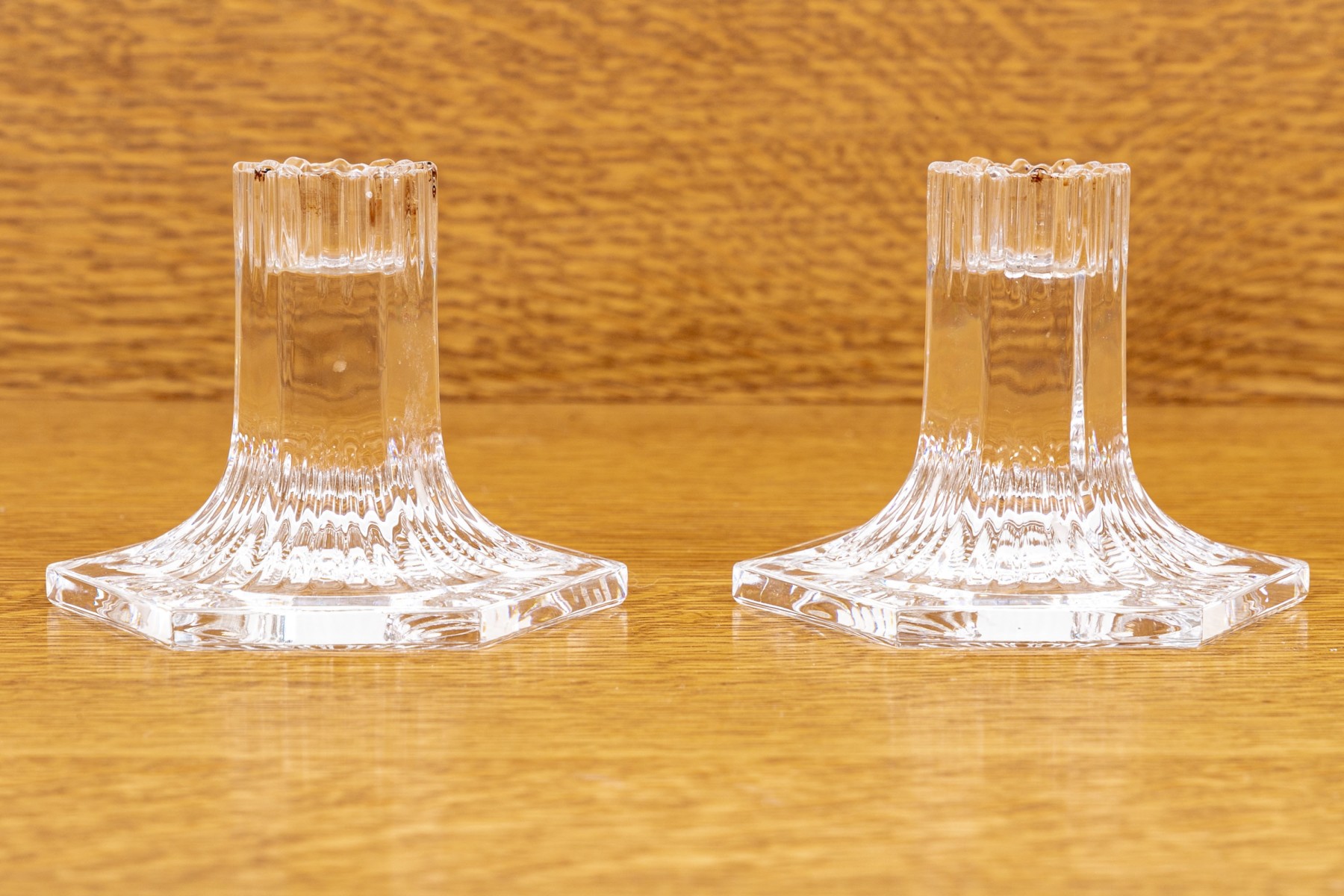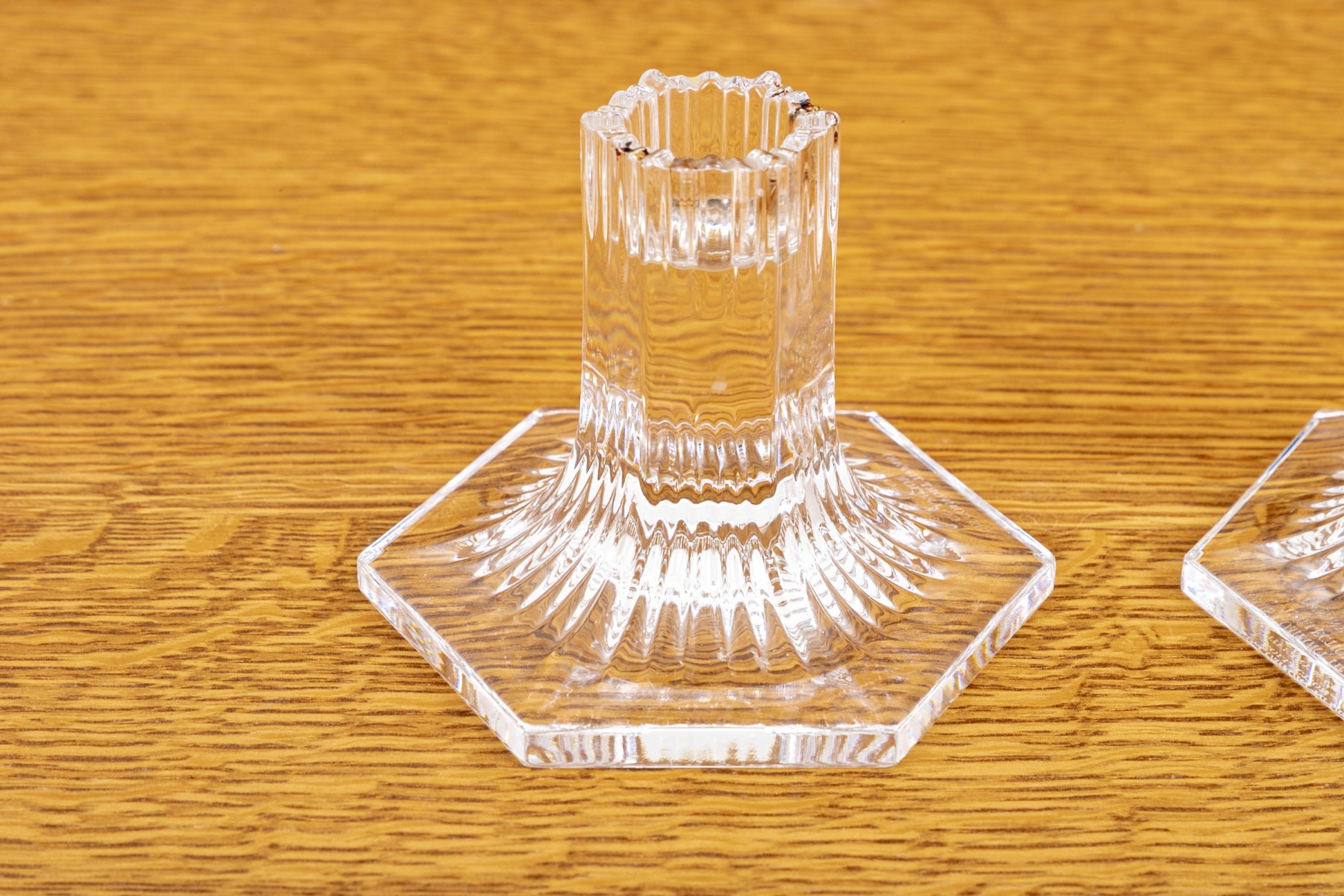 Pair of Tiffany & Co. crystal candleholders from their Louis Comfort Tiffany Collection with vertical cuts and a multisided base. Acid etched on verso with Louis Comfort Tiffany Collection and Tiffany & Co.