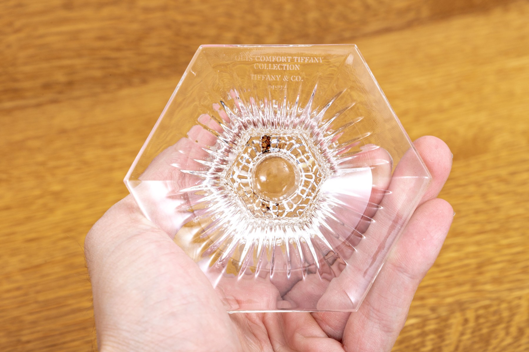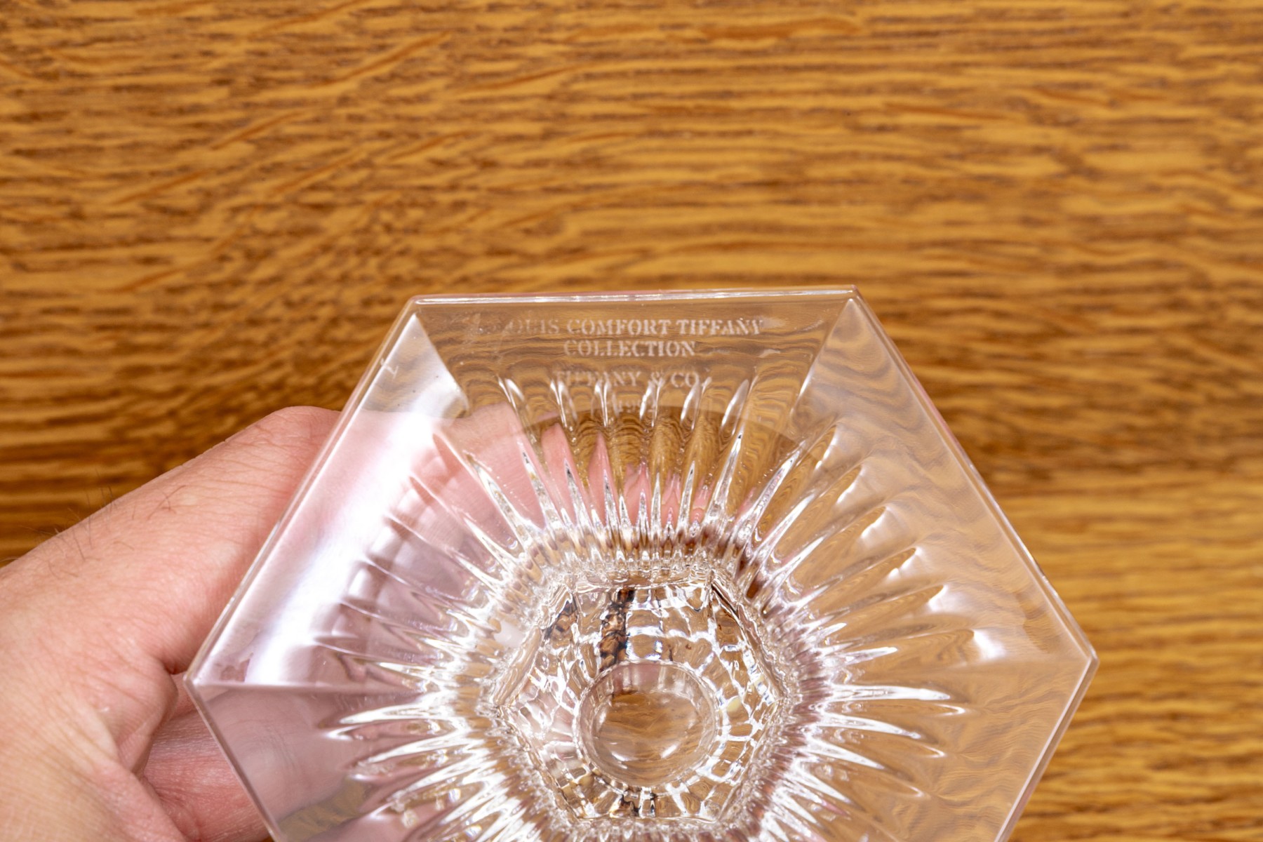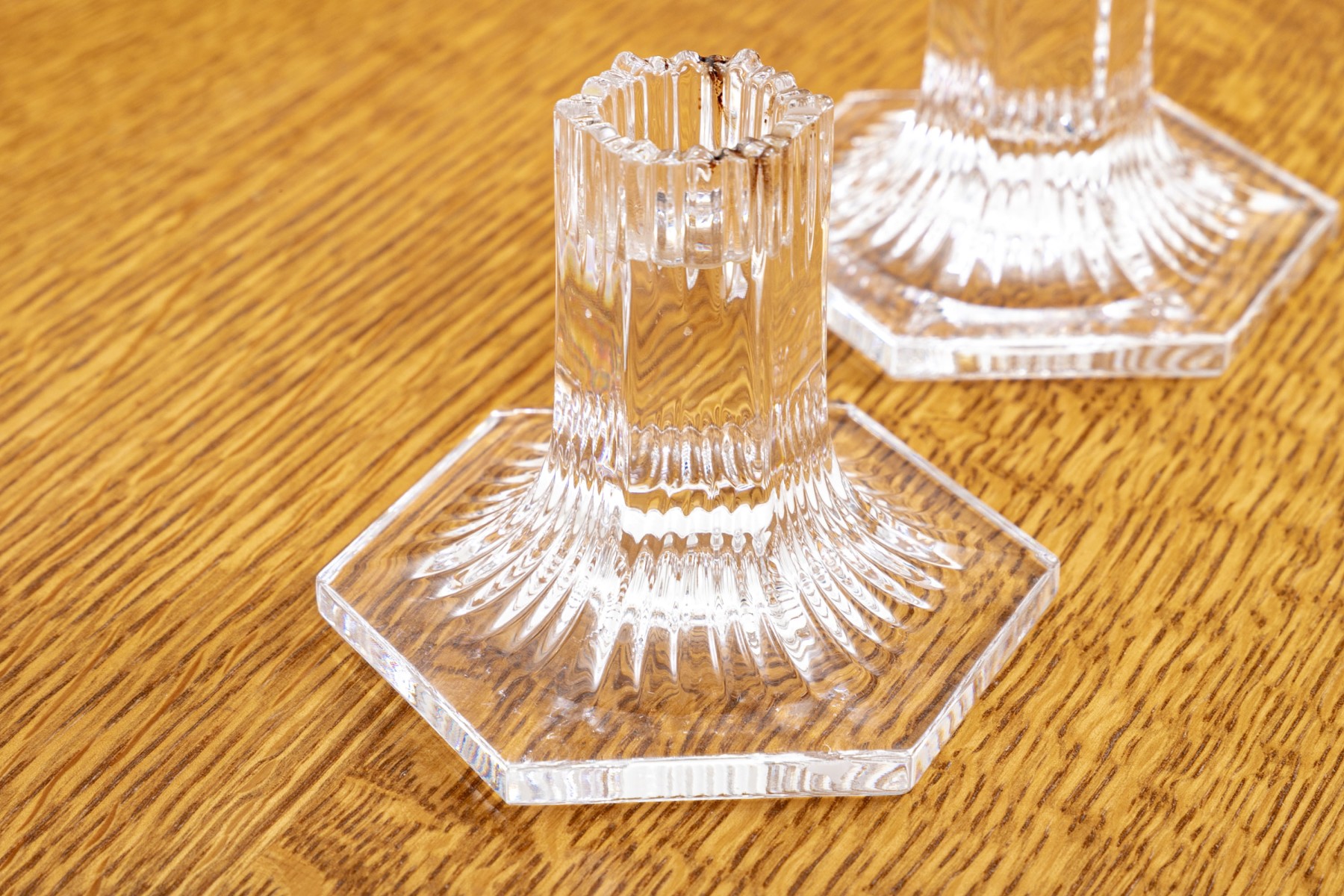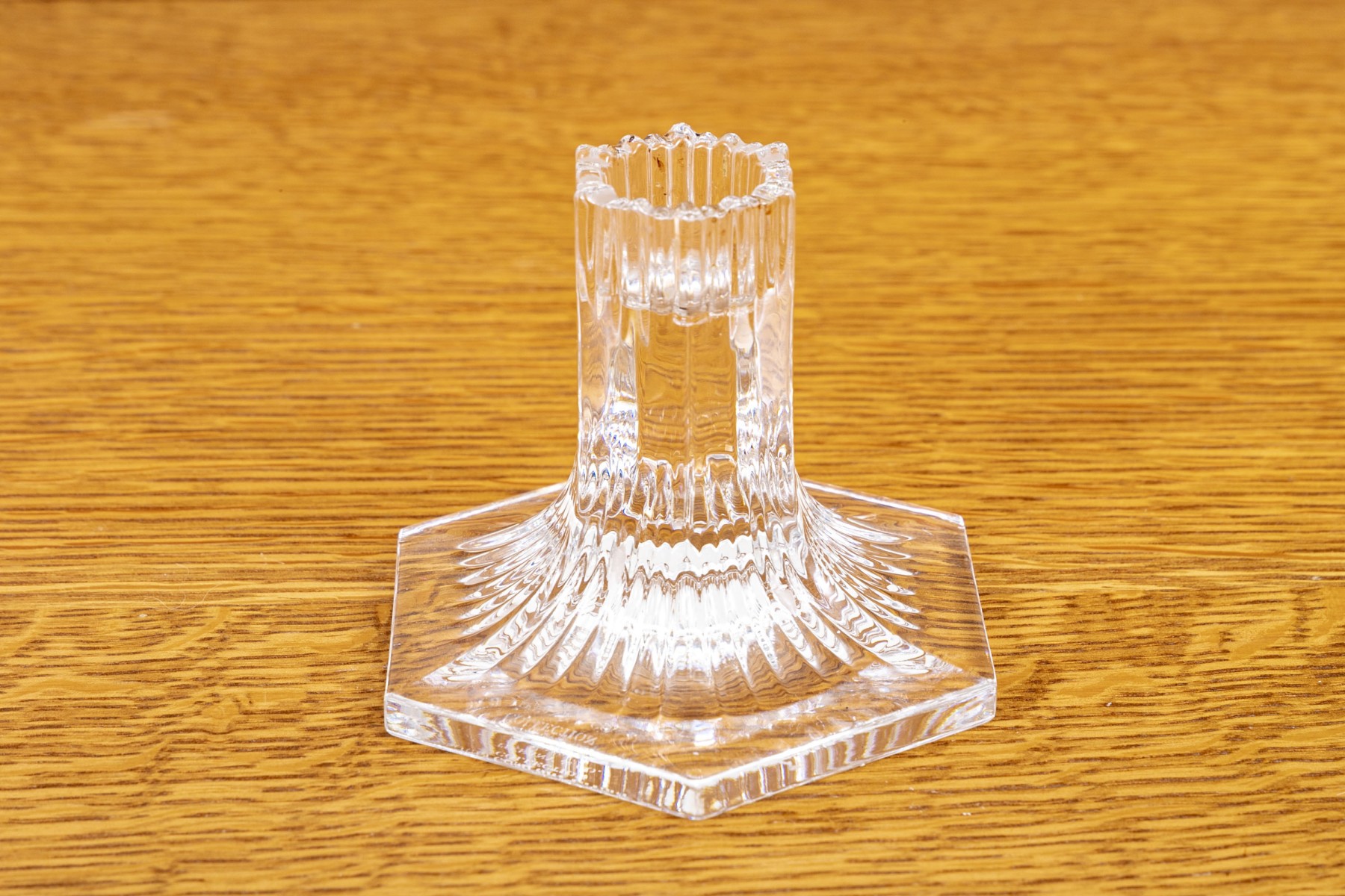 Pair of Tiffany & Co. crystal candleholders from their Louis Comfort Tiffany Collection with vertical cuts and a multisided base. Acid etched on verso with Louis Comfort Tiffany Collection and Tiffany & Co.