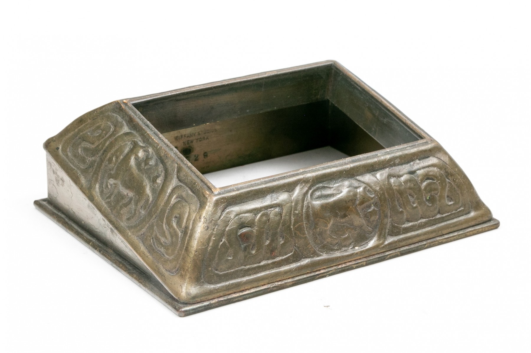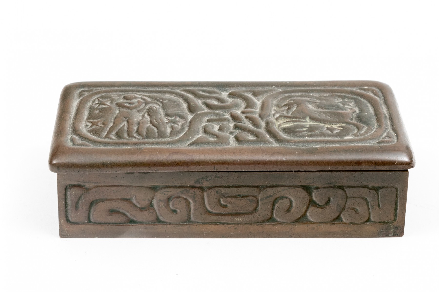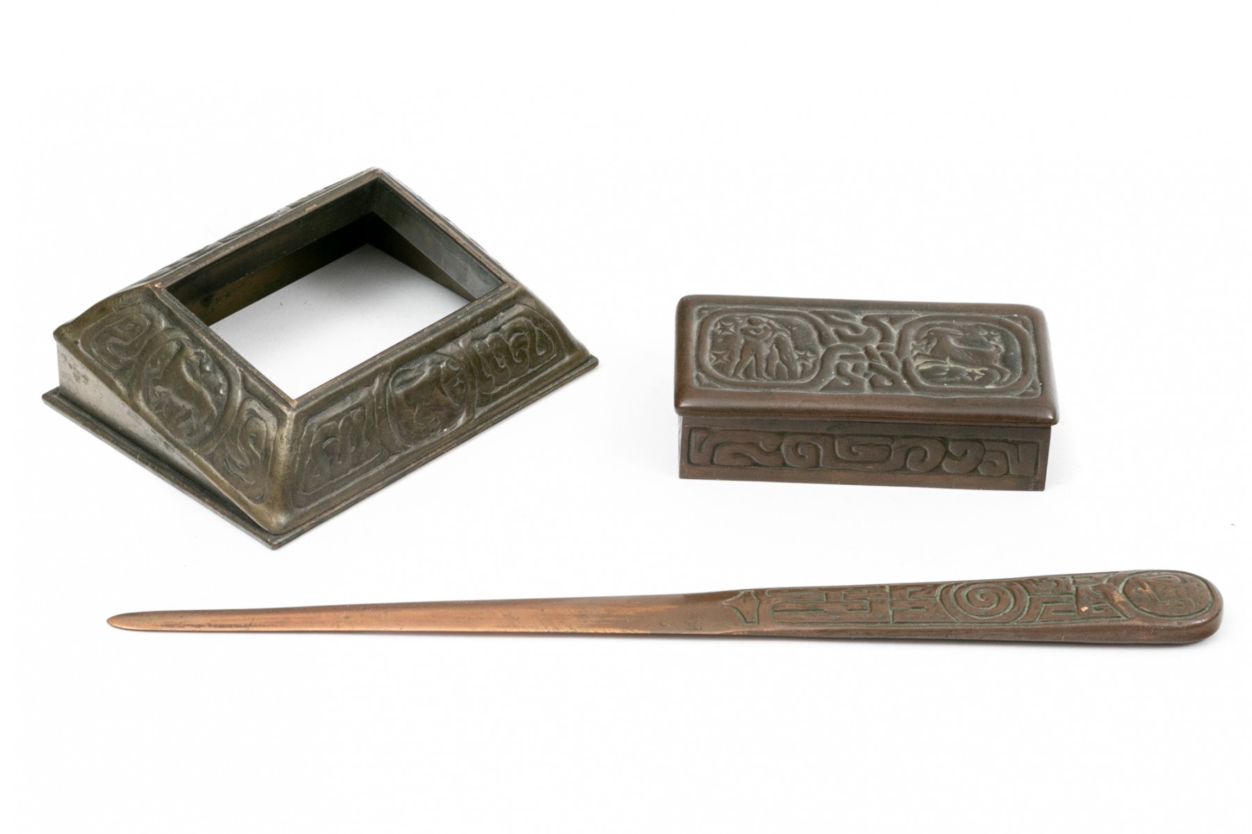 Tiffany Studios, New York magnificent antique bronze zodiac three piece desk set. The wonderful set includes the stamp box, letter opener and the perpetual calendar, complete with glass and all of the calendar inserts. Missing the fastening "u" shaped interior clip