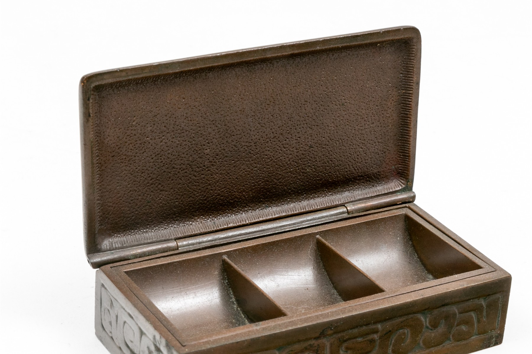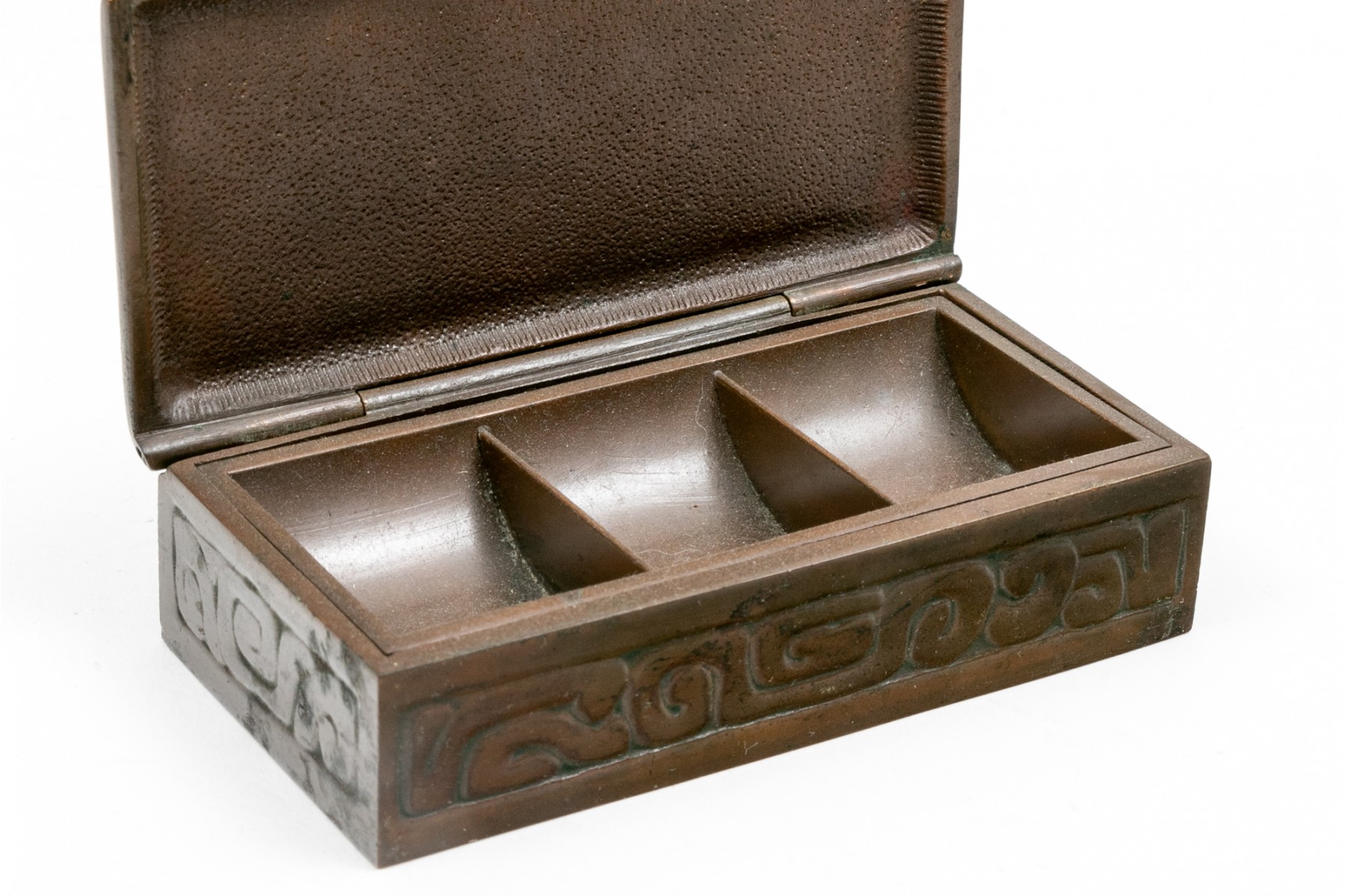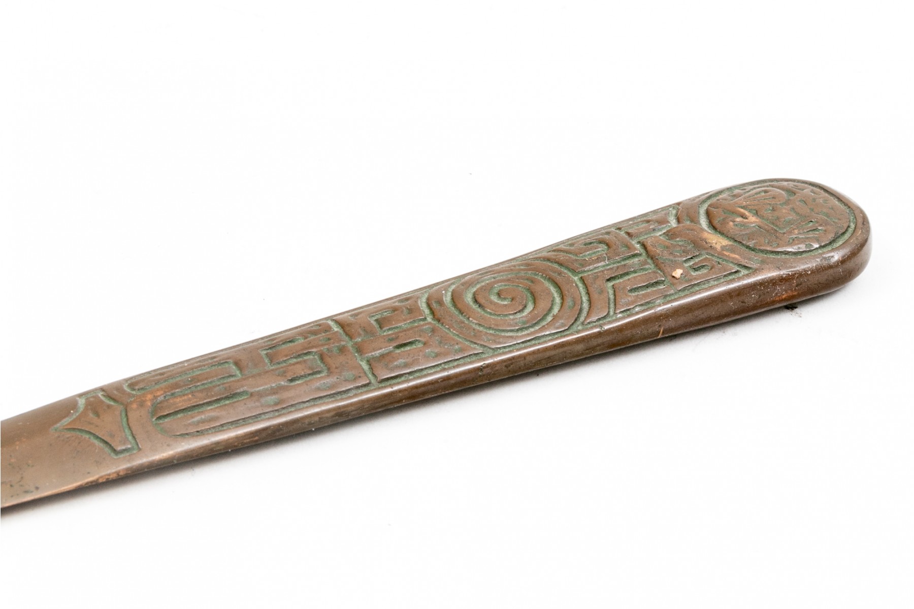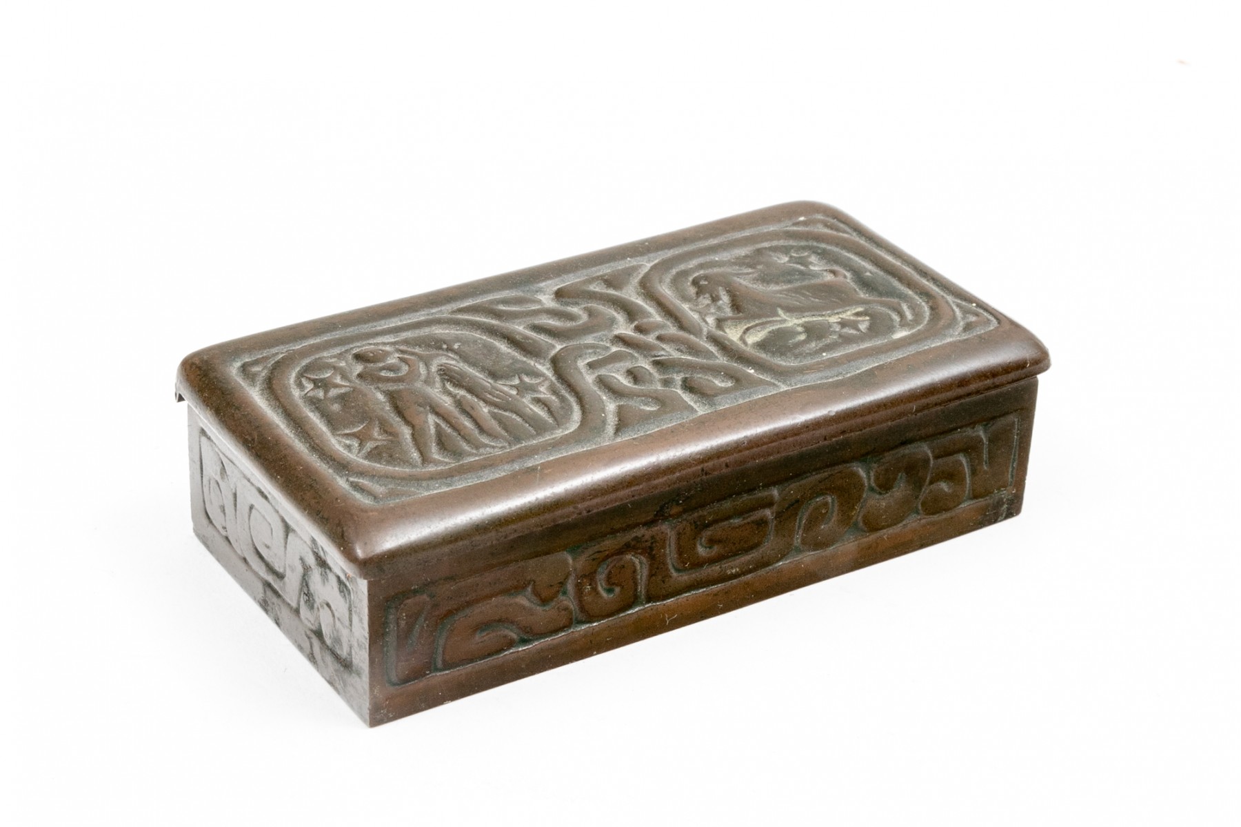 Tiffany Studios, New York magnificent antique bronze zodiac three piece desk set. The wonderful set includes the stamp box, letter opener and the perpetual calendar, complete with glass and all of the calendar inserts. Missing the fastening "u" shaped interior clip